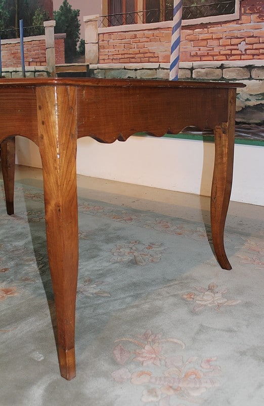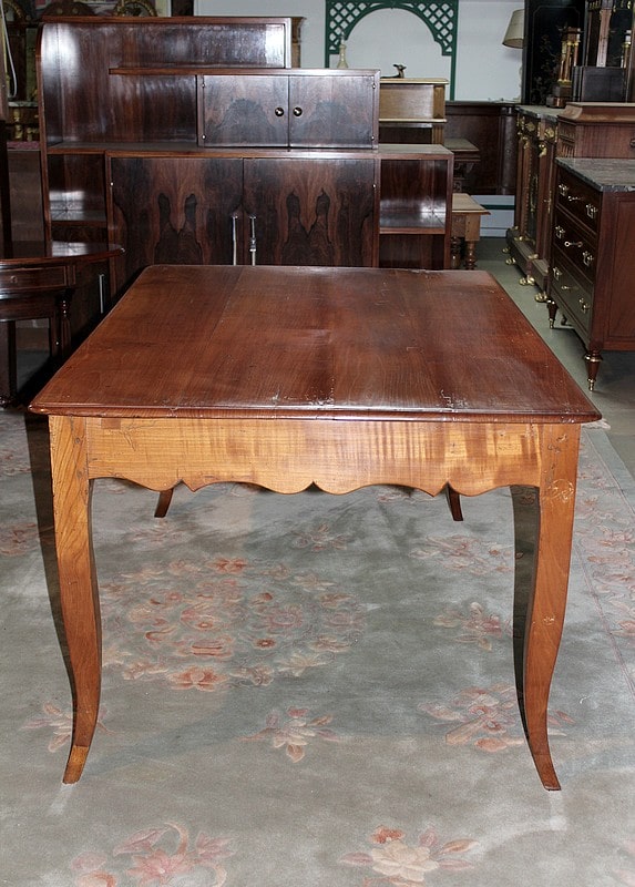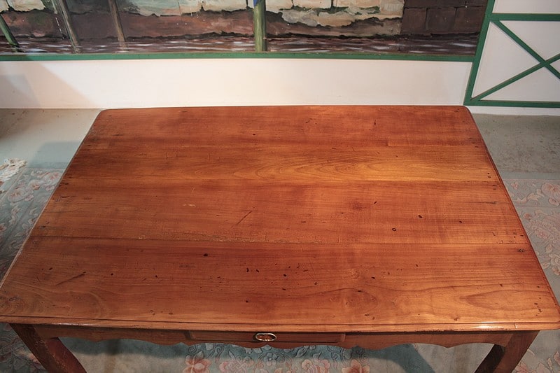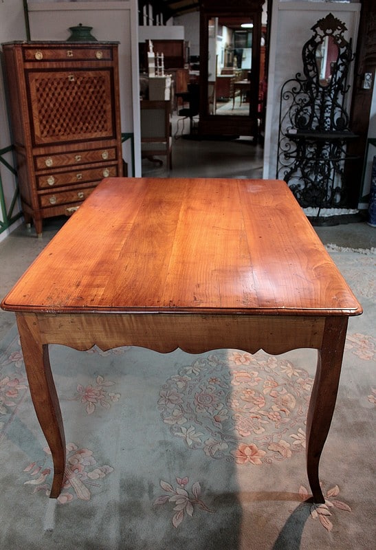 Table rectangulaire en merisier de style Louis XV, ouvrant par un tiroir en ceinture. Son dessus est mouluré et sa traverse chantournée. Elle repose sur 4 pieds galbés (bas refaits sur 8/9cm pour mise à hauteur).