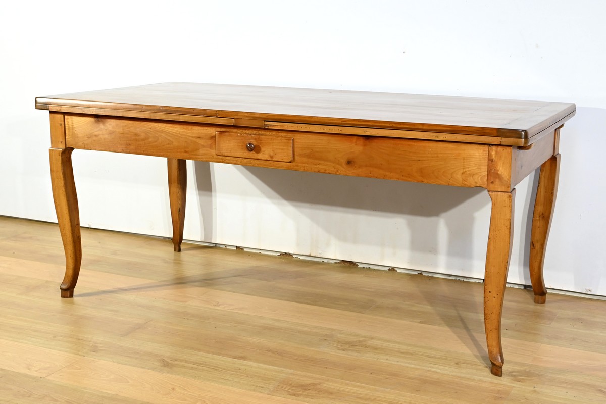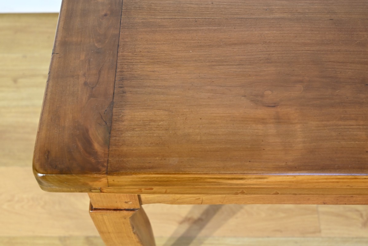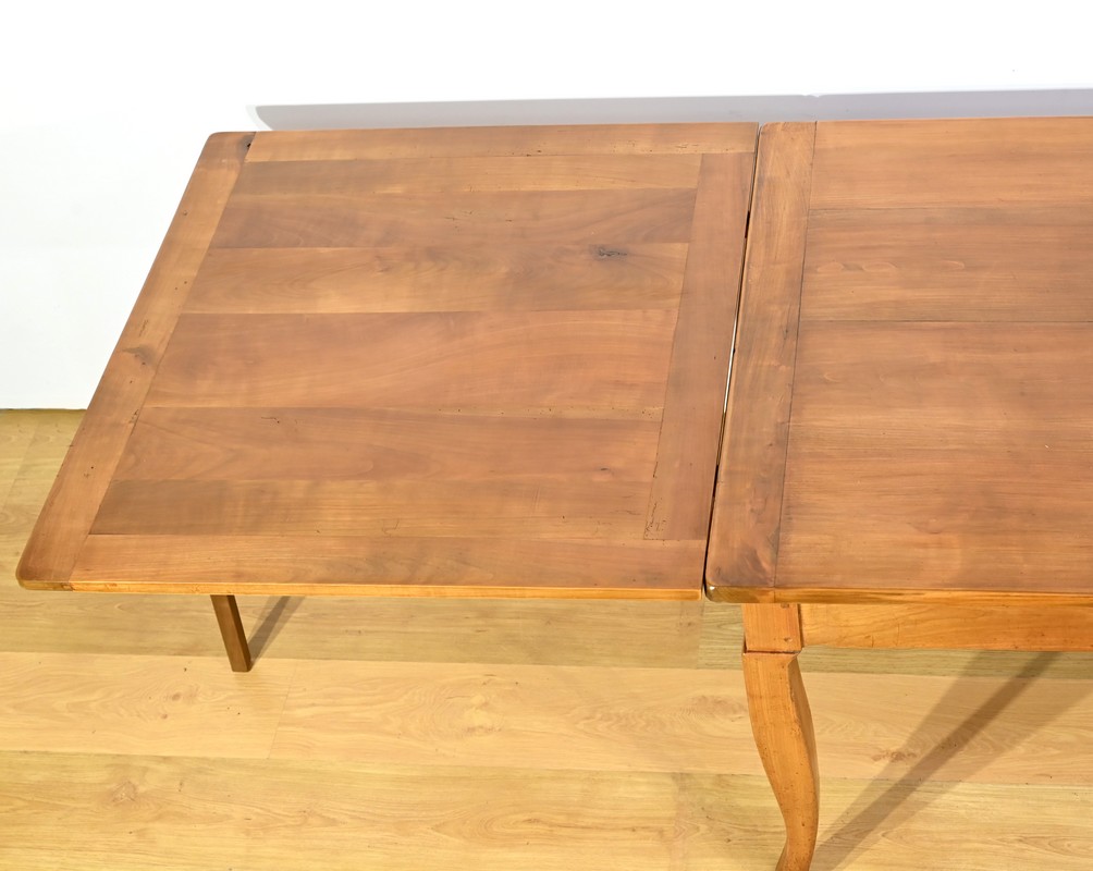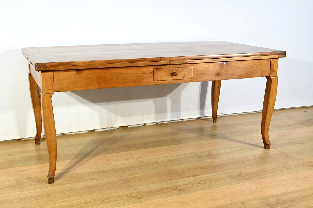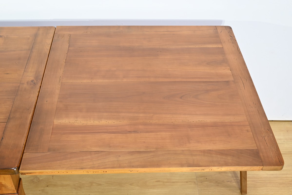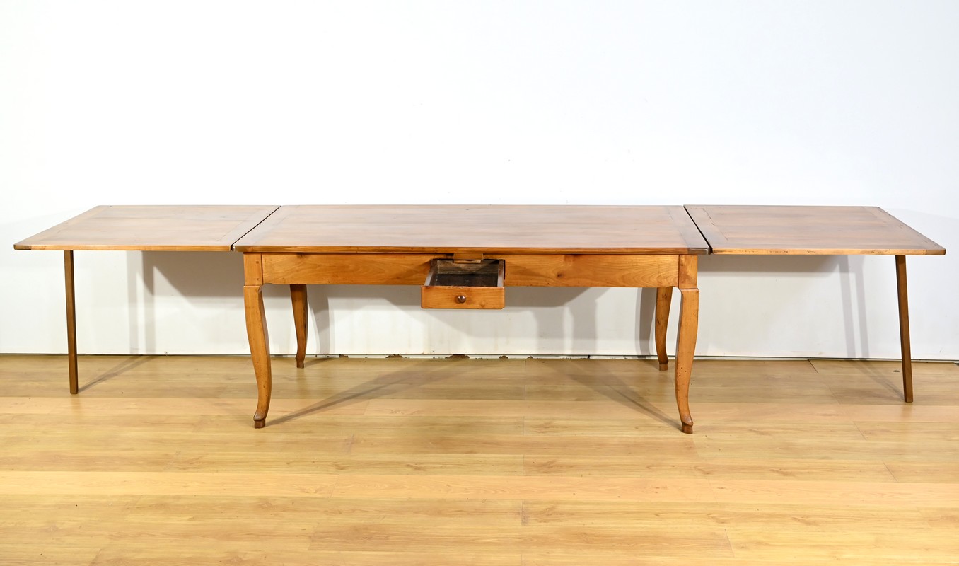 Cette table en merisier massif provenant de la région Rennaise à la particularité de pouvoir s’allonger afin de gagner le double de sa capacité, soit 12 à 14 couverts, grâce à deux plateaux en merisier massif coulissants.