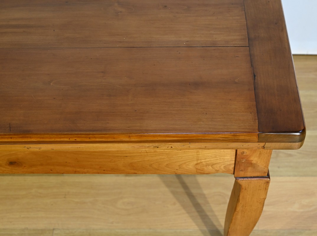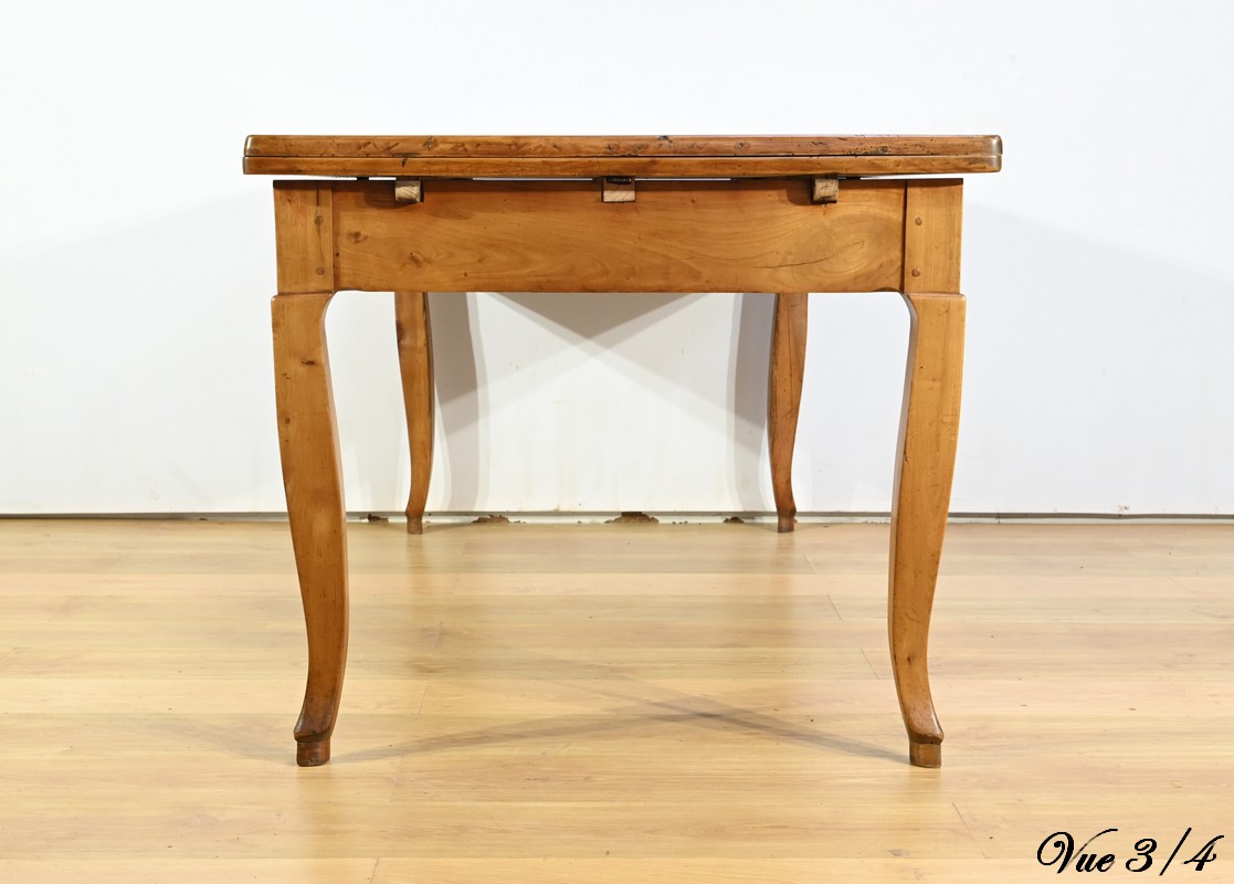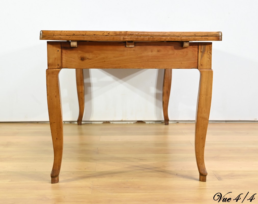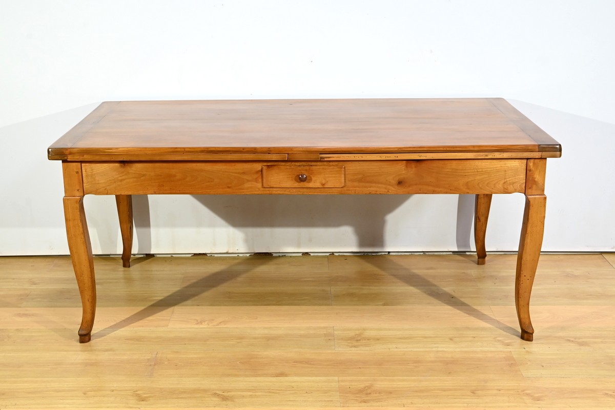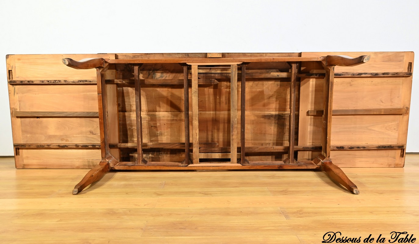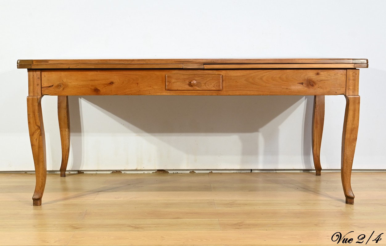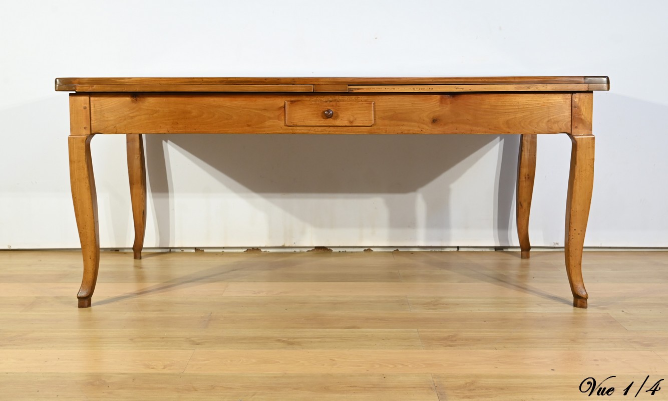 Cette table en merisier massif provenant de la région Rennaise à la particularité de pouvoir s’allonger afin de gagner le double de sa capacité, soit 12 à 14 couverts, grâce à deux plateaux en merisier massif coulissants.