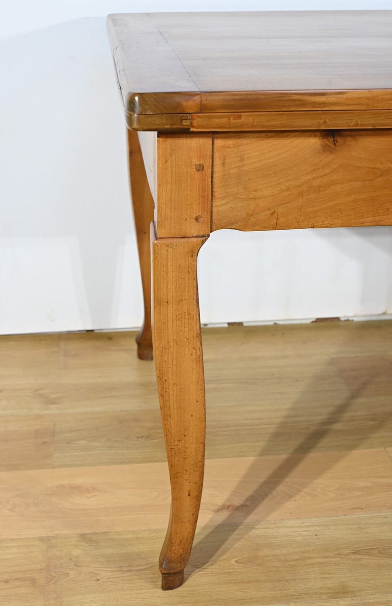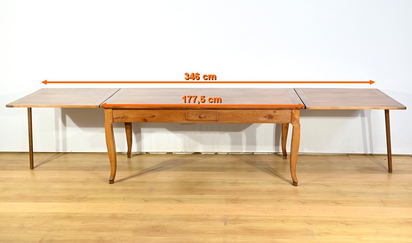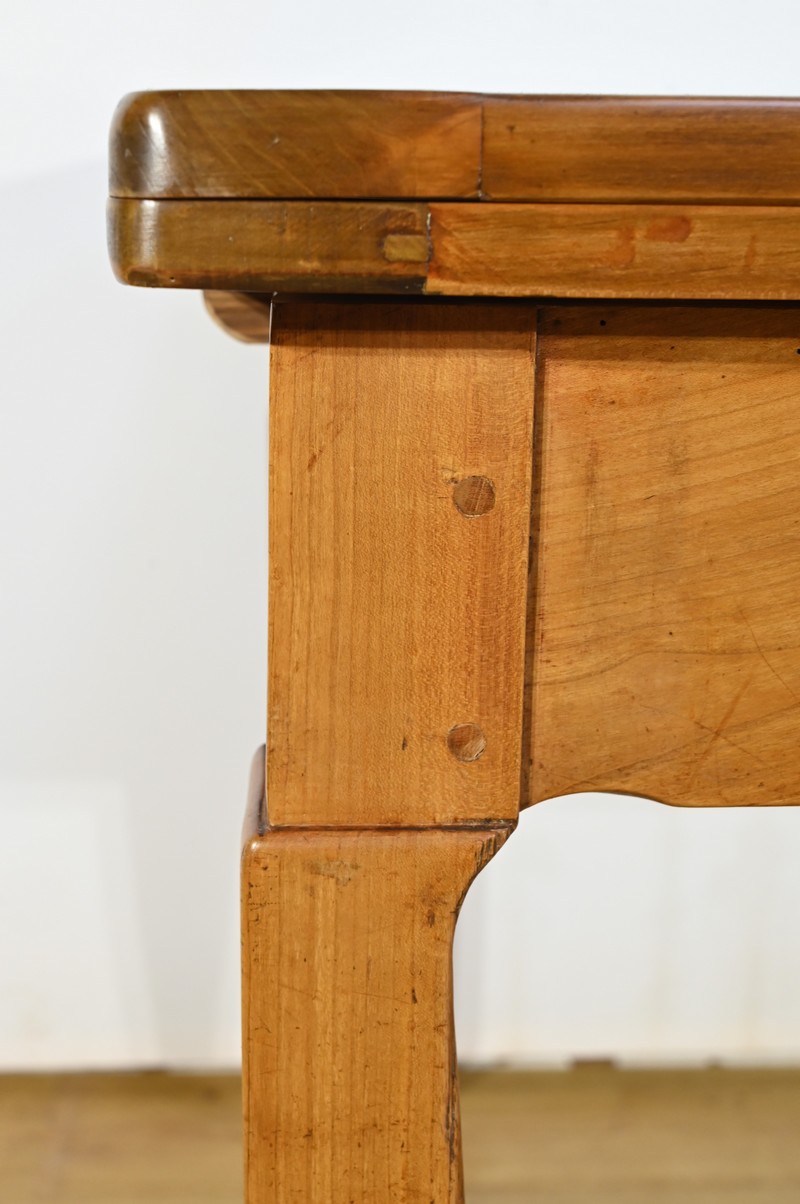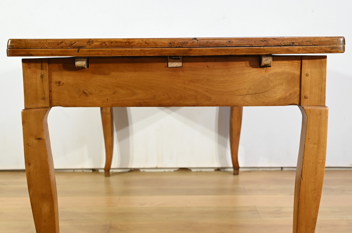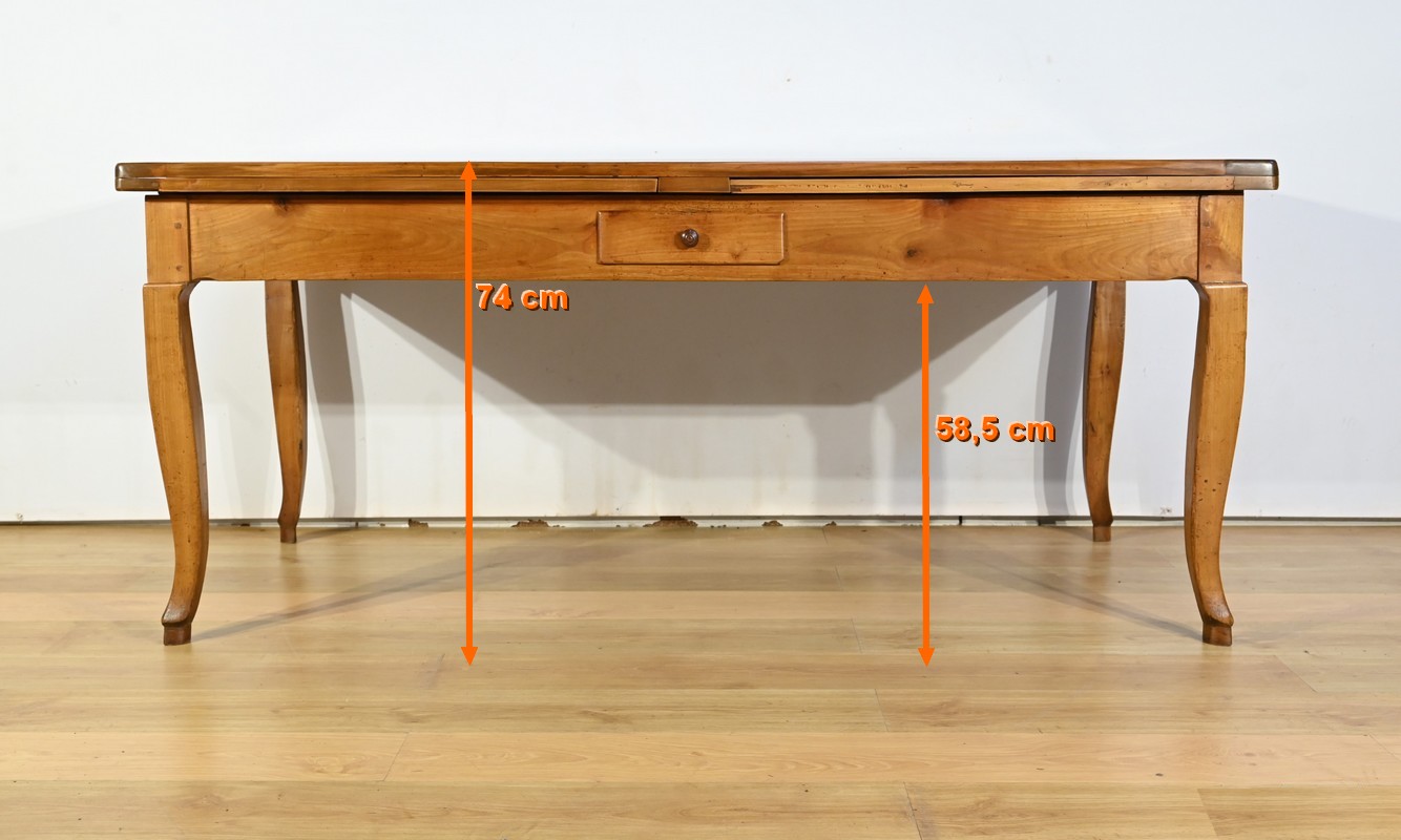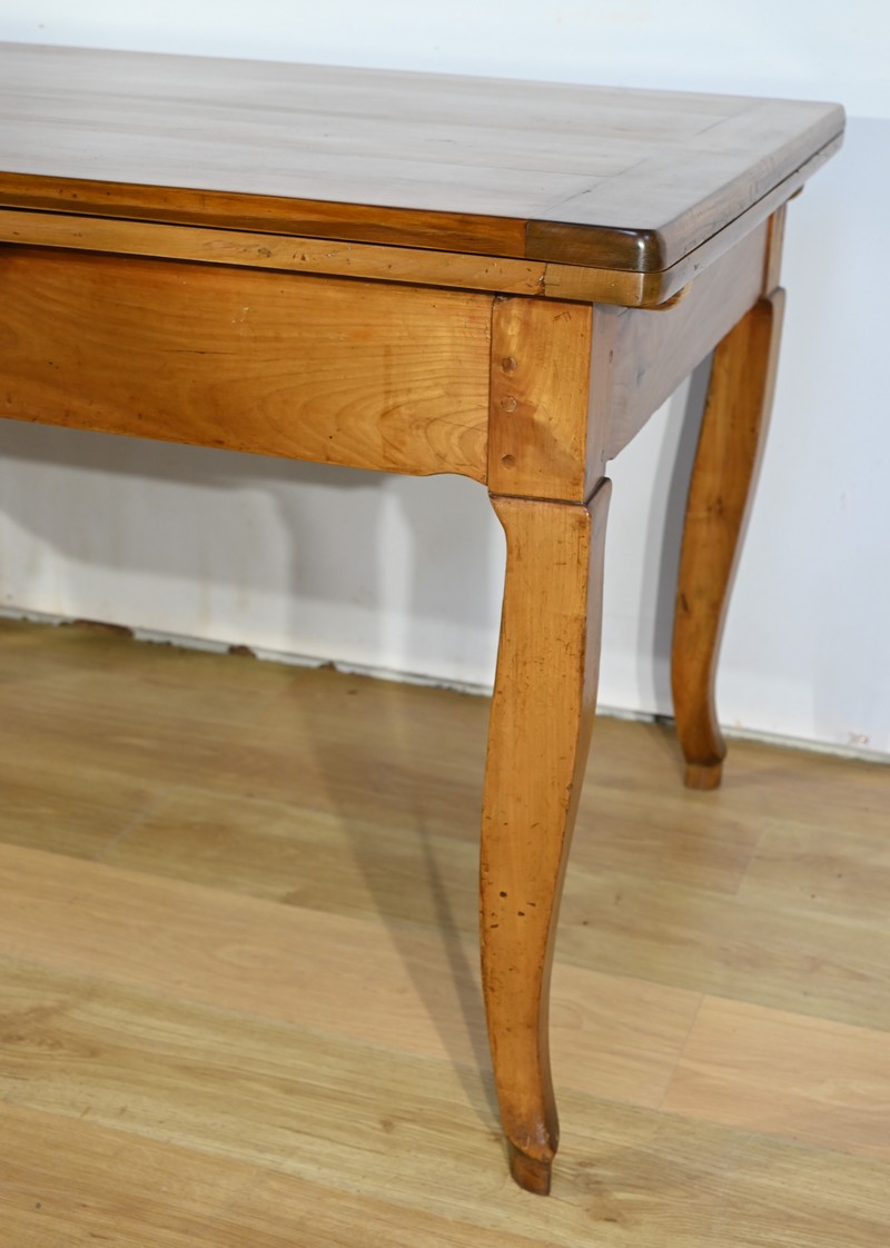 Cette table en merisier massif provenant de la région Rennaise à la particularité de pouvoir s’allonger afin de gagner le double de sa capacité, soit 12 à 14 couverts, grâce à deux plateaux en merisier massif coulissants.