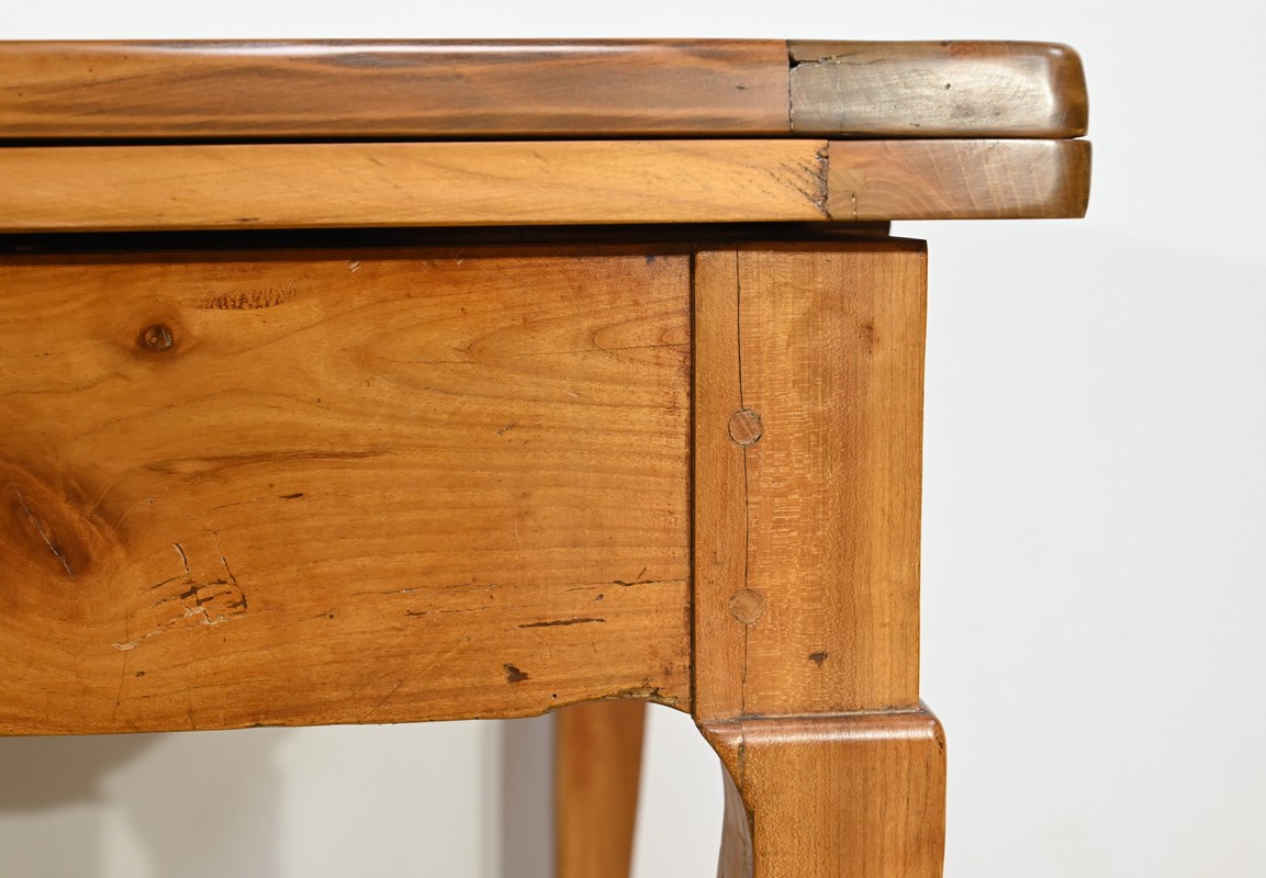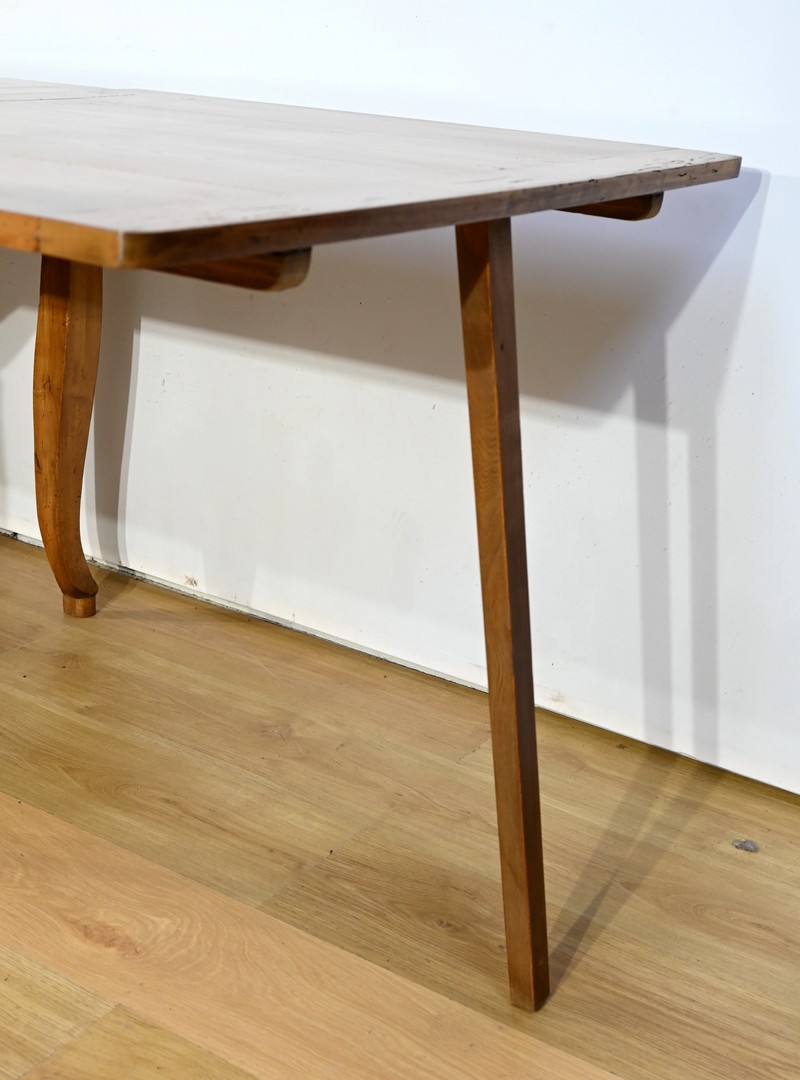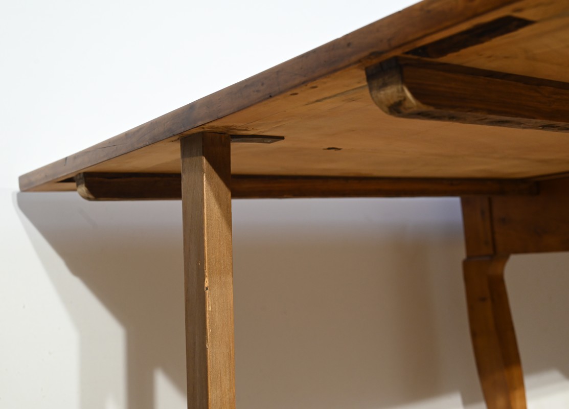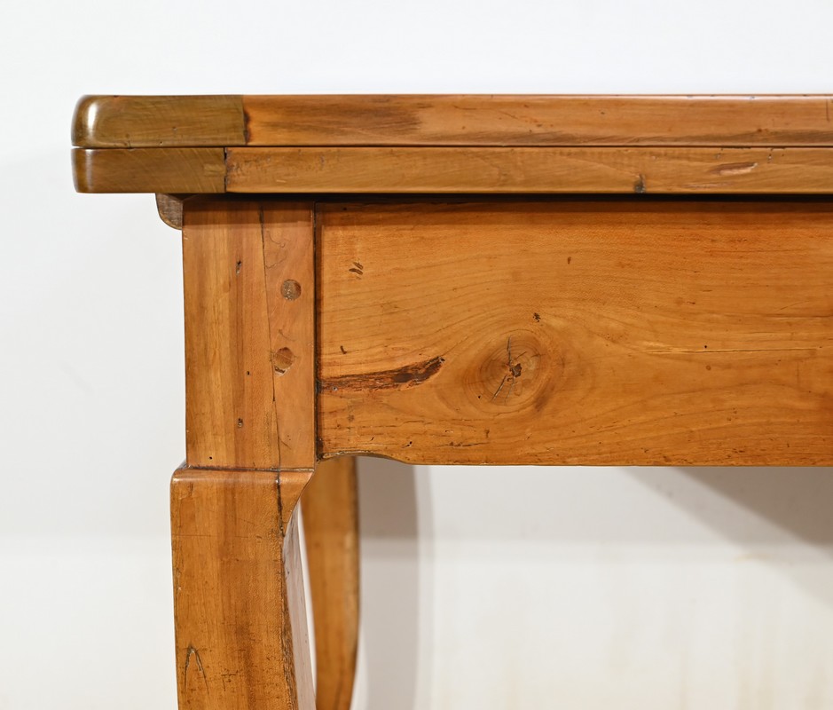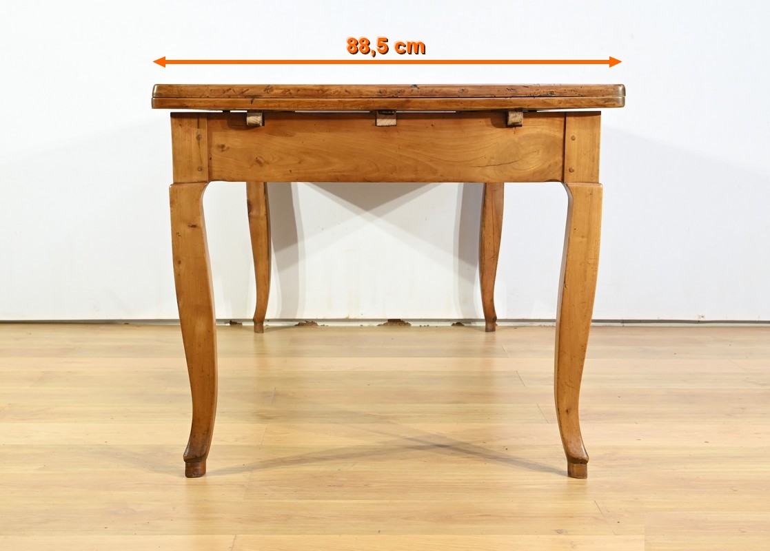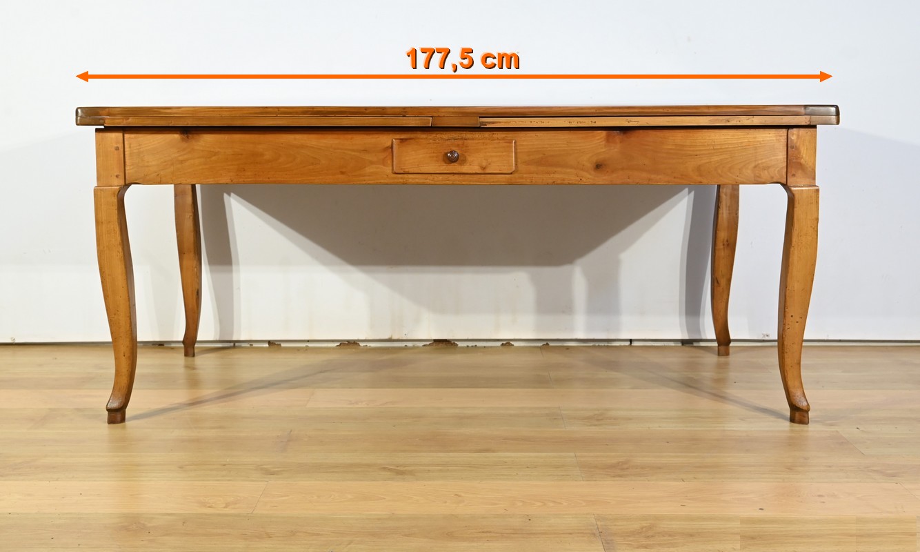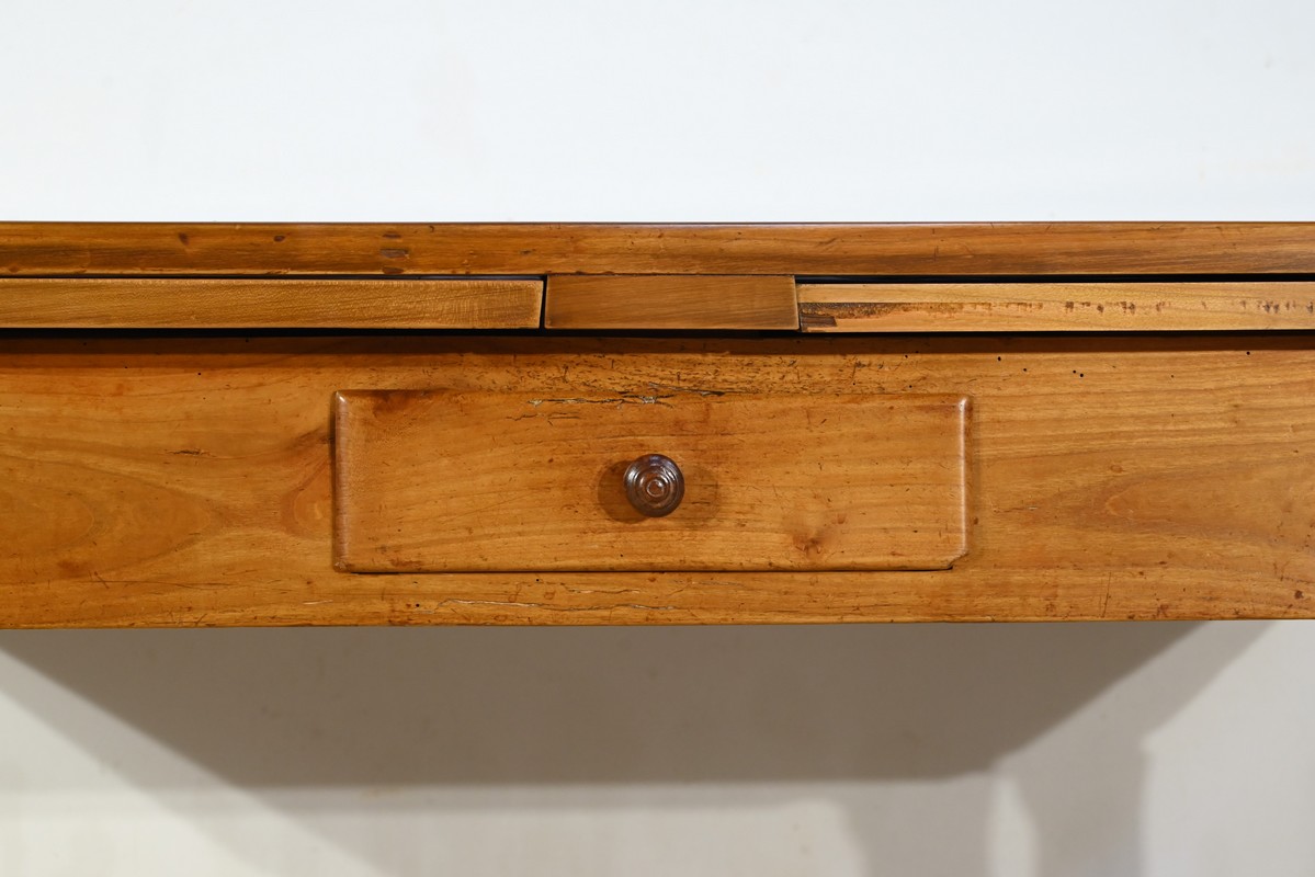 Cette table en merisier massif provenant de la région Rennaise à la particularité de pouvoir s’allonger afin de gagner le double de sa capacité, soit 12 à 14 couverts, grâce à deux plateaux en merisier massif coulissants.