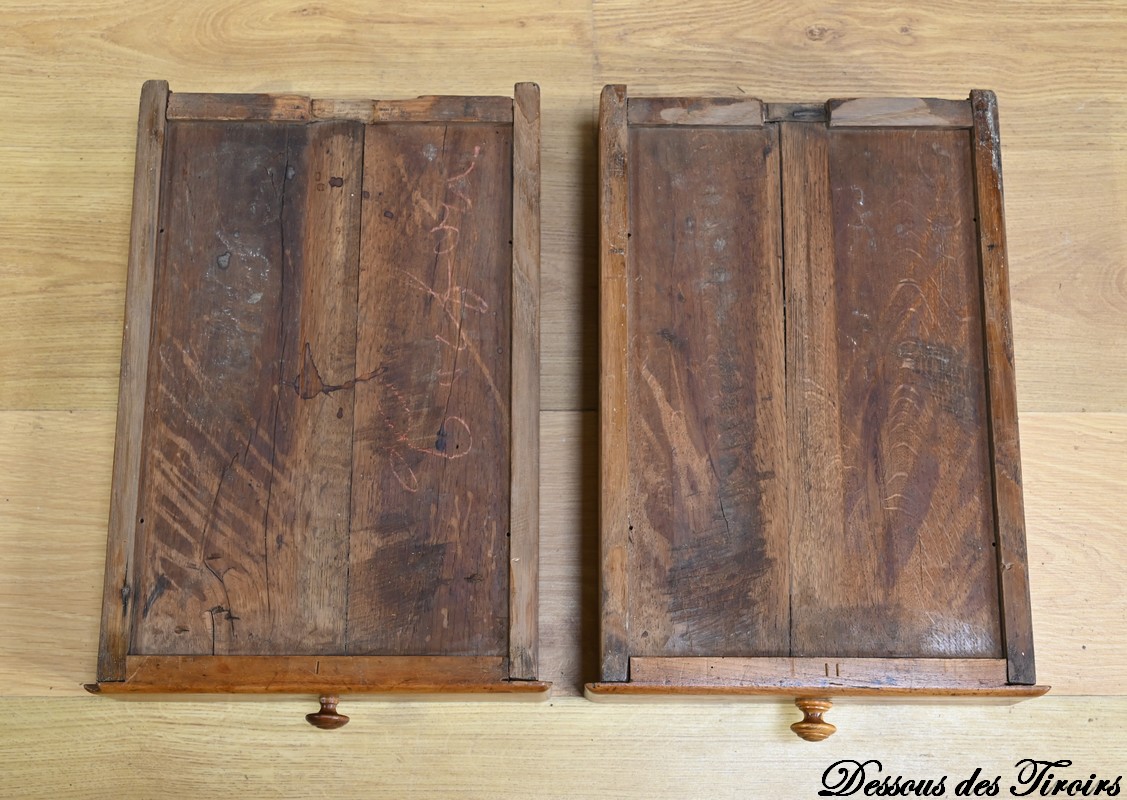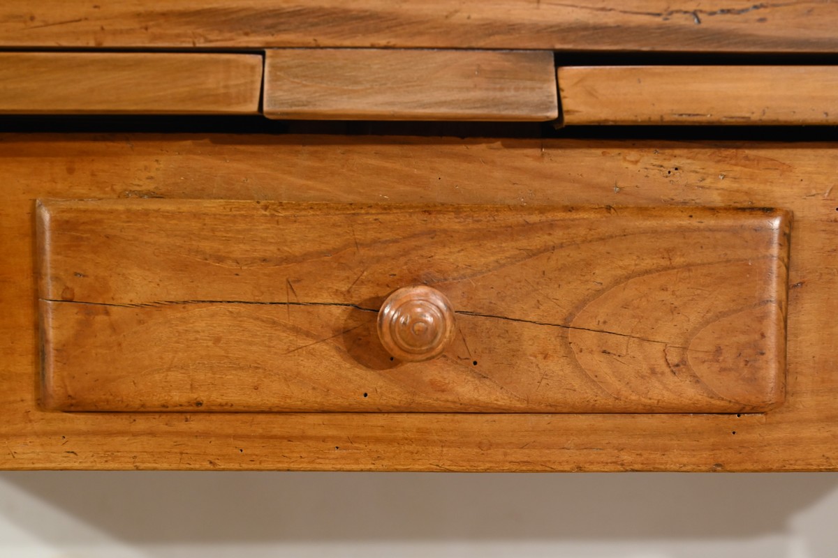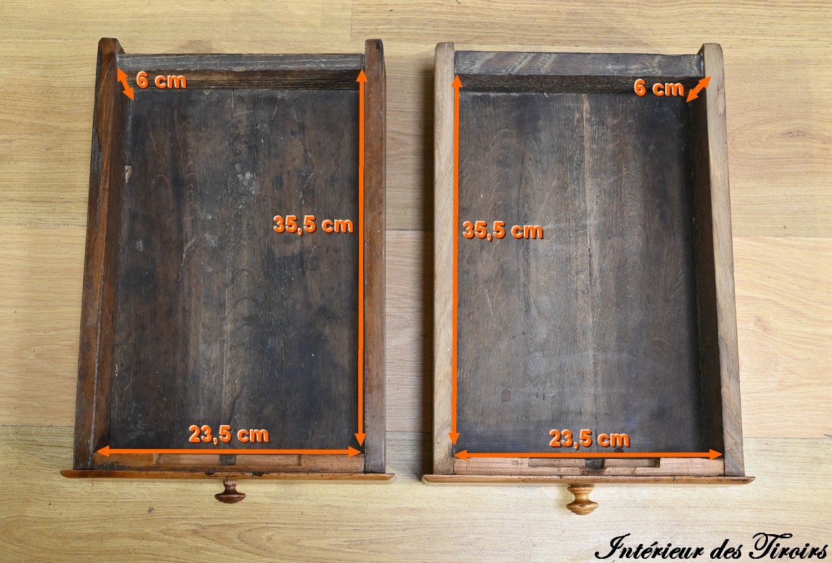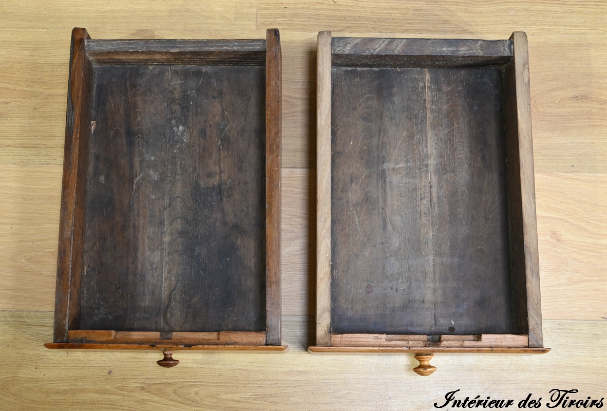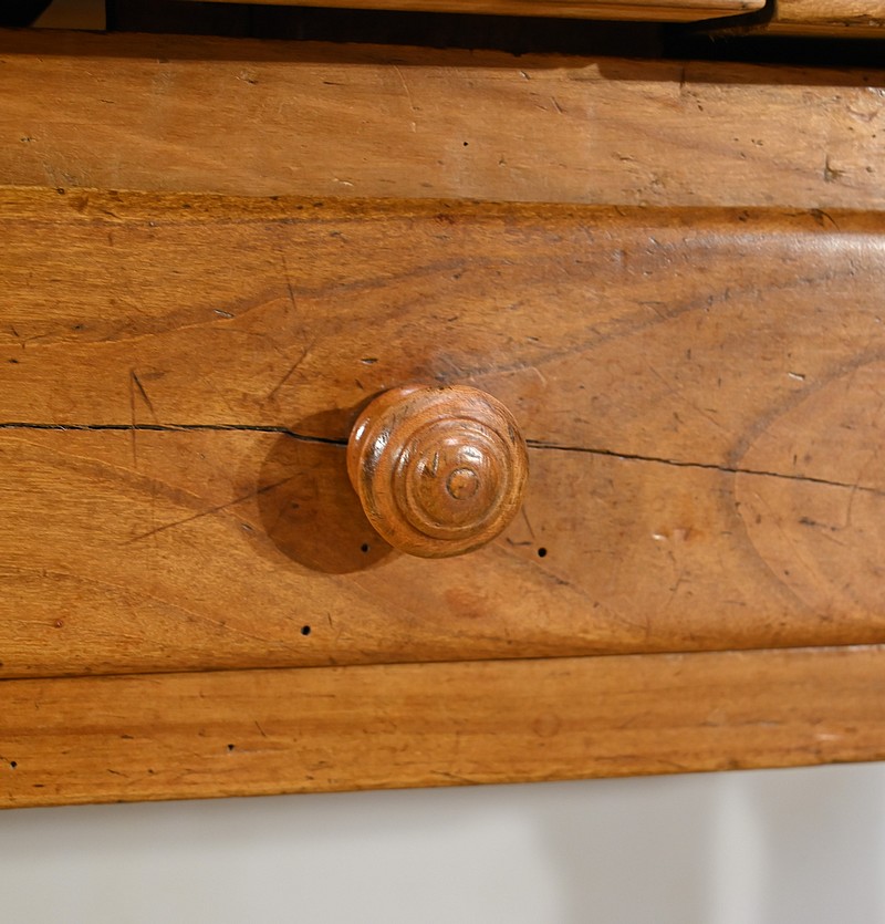 Cette table propose deux petits tiroirs en ceinture avec boutons tournés en bois.