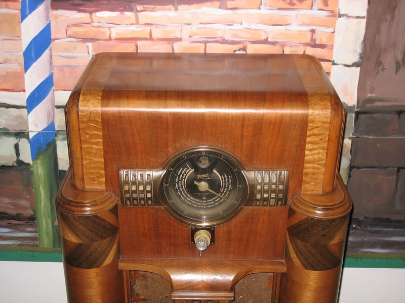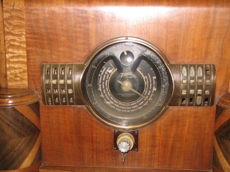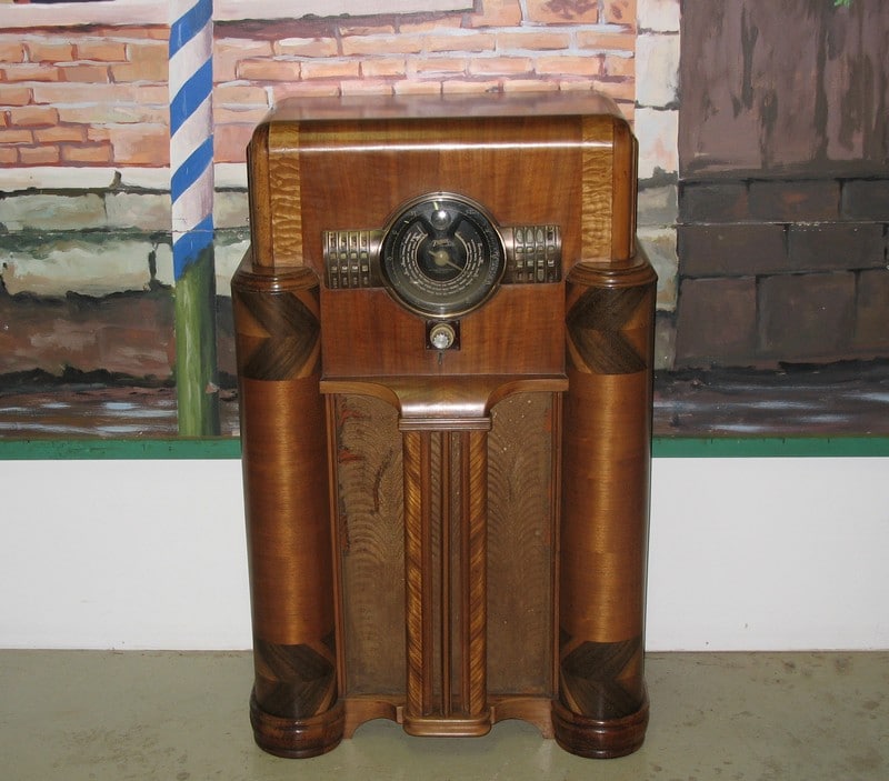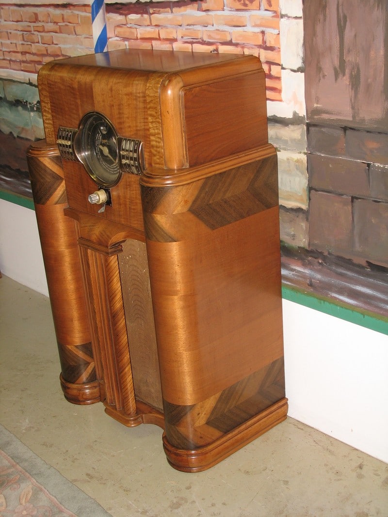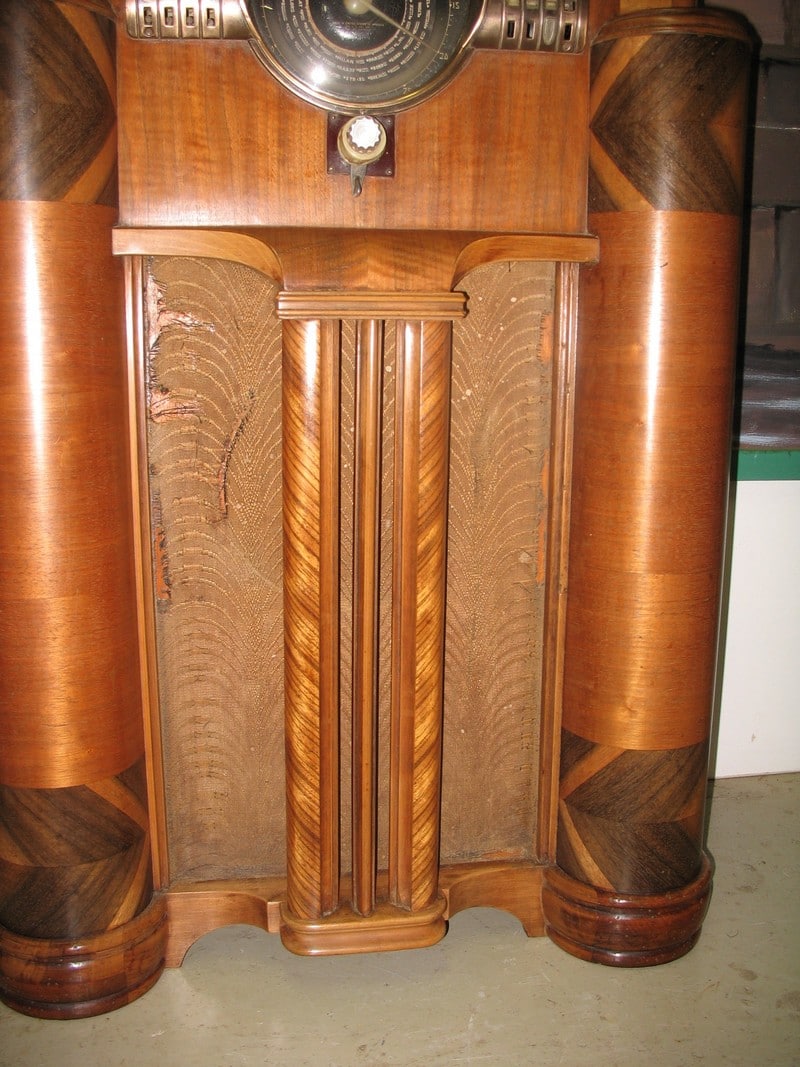 Bois en parfait état. Décapage du verni et finition cirée. Radio en l’état.