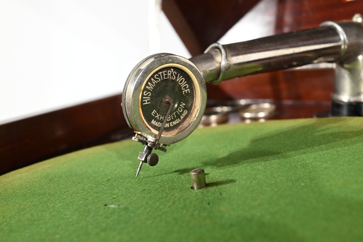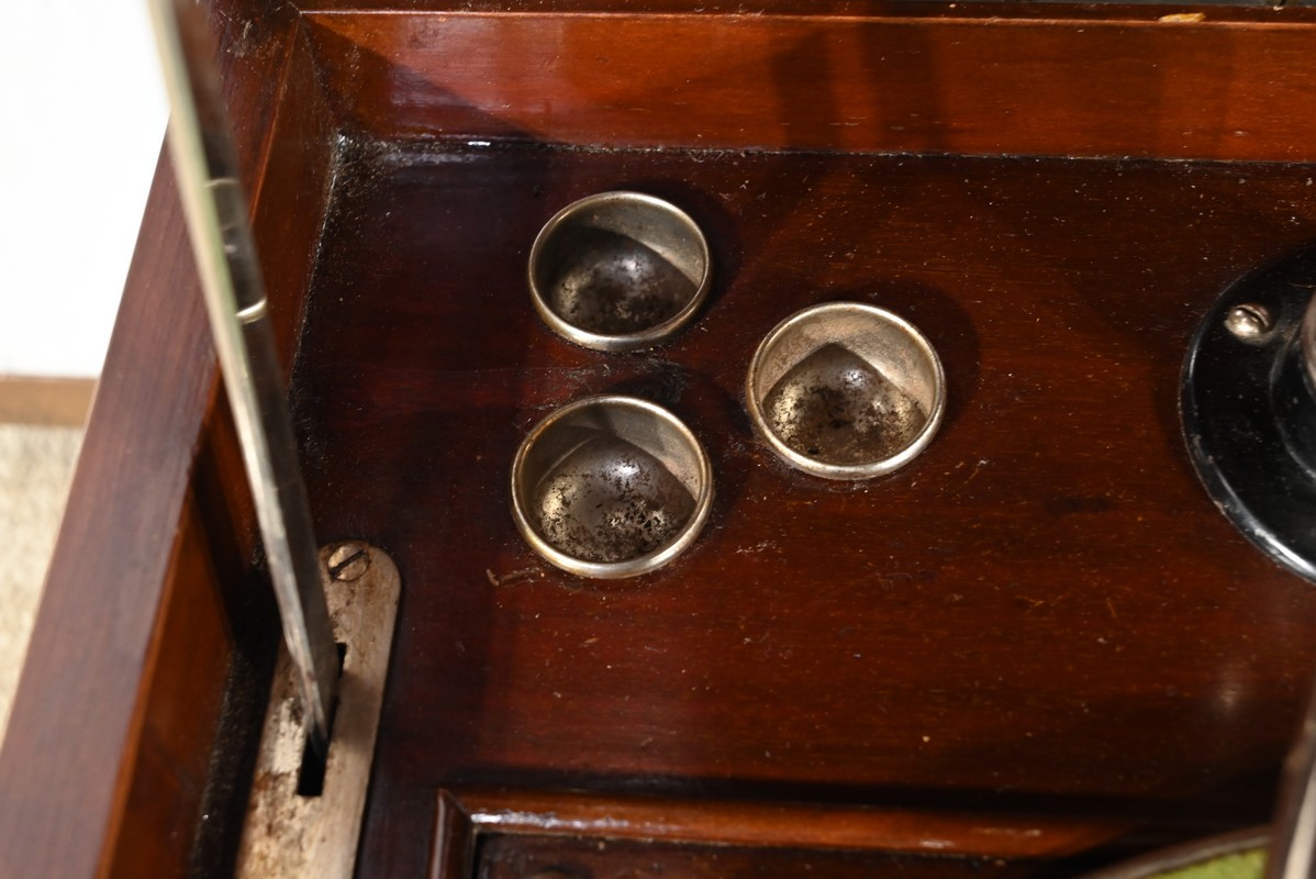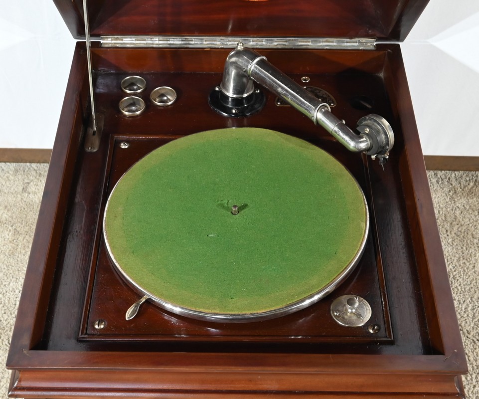 Ouvert, ce phonographe présente une platine 78 tours, habillée d’une feutrine verte, équipée d’un bras Silvertone avec tête à aiguille et d’un régulateur de vitesse.
