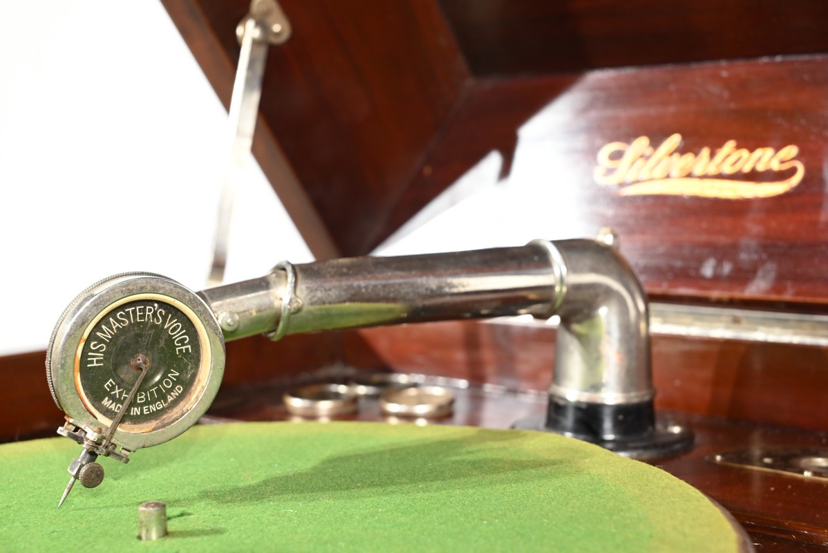 Présent dans le catalogue annuel de l’année 1920 de l’entreprise américaine Silvertone ce phonographe présente un abattant, à diverses moulures, monté sur compas.