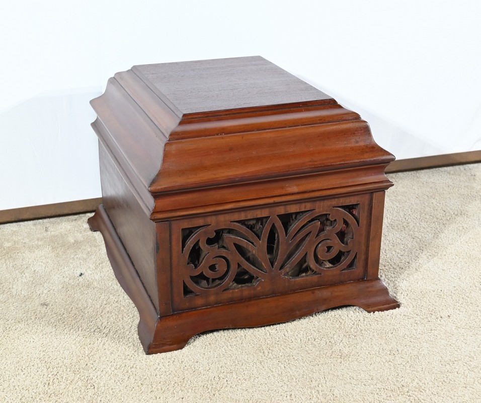 Le coffre de résonance à décors de volutes et de feuilles est ajouré en façade.