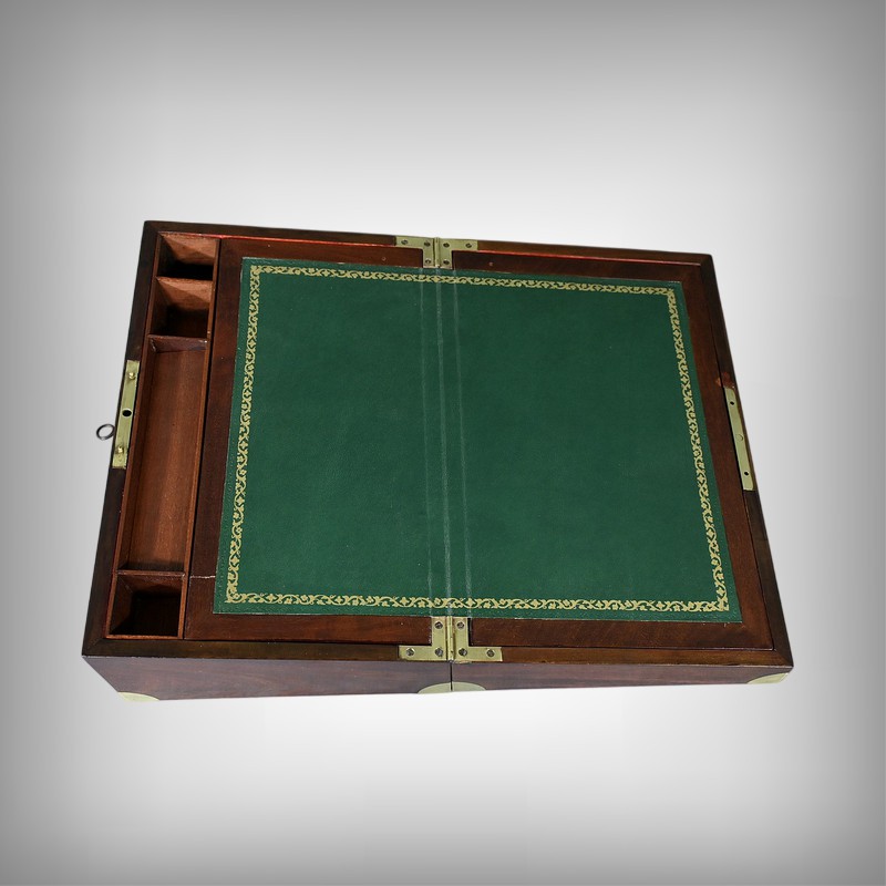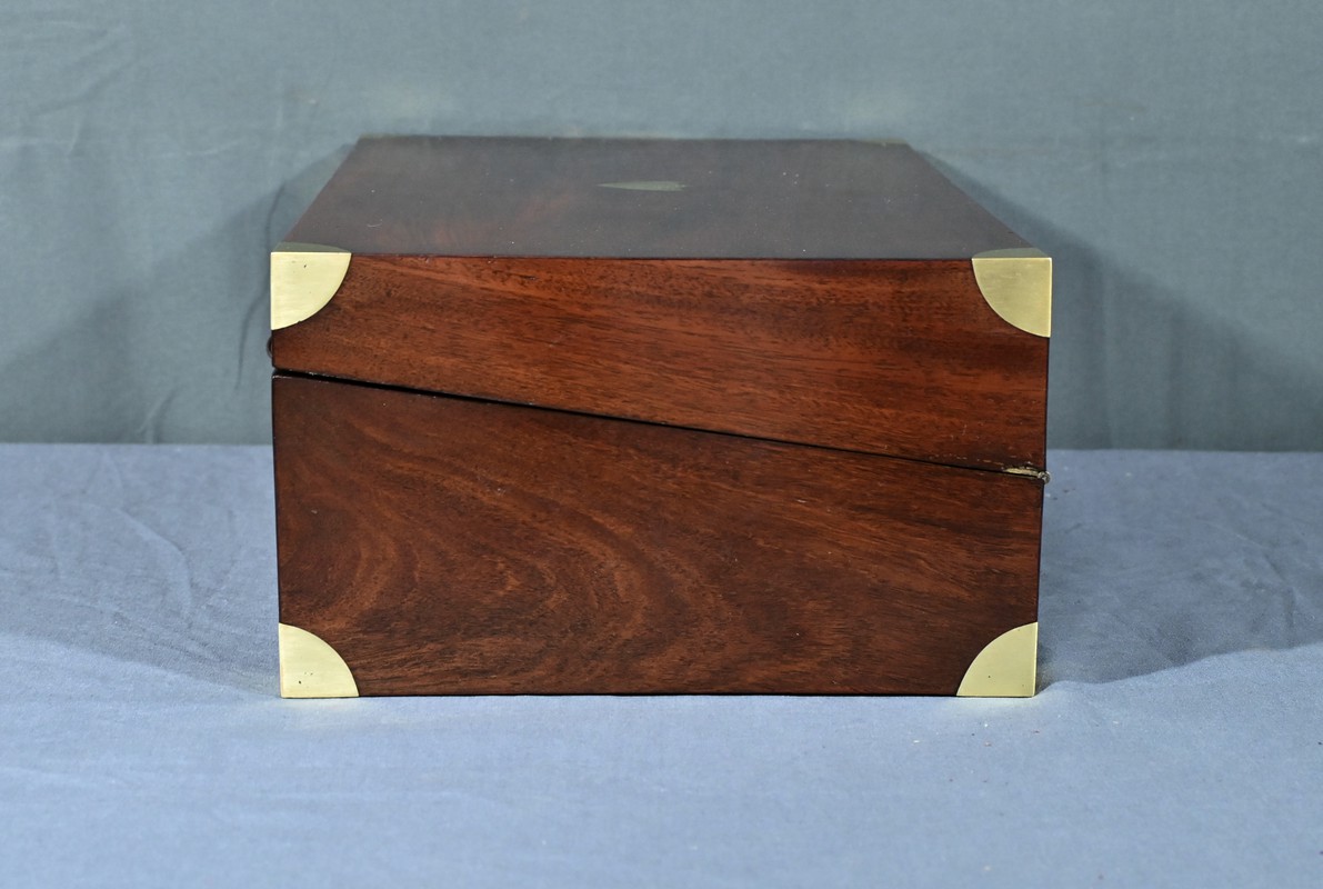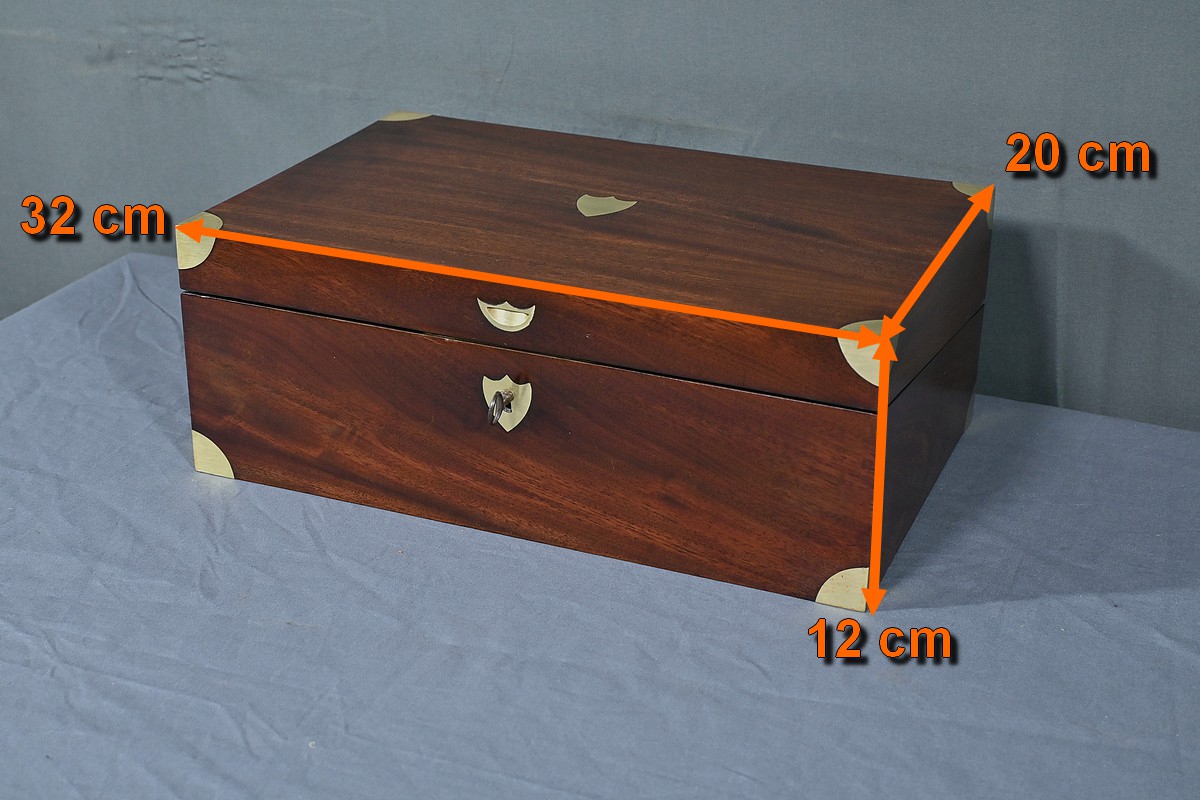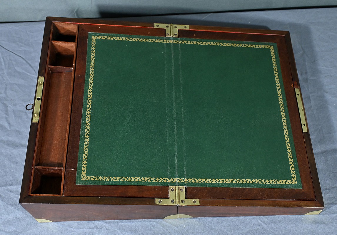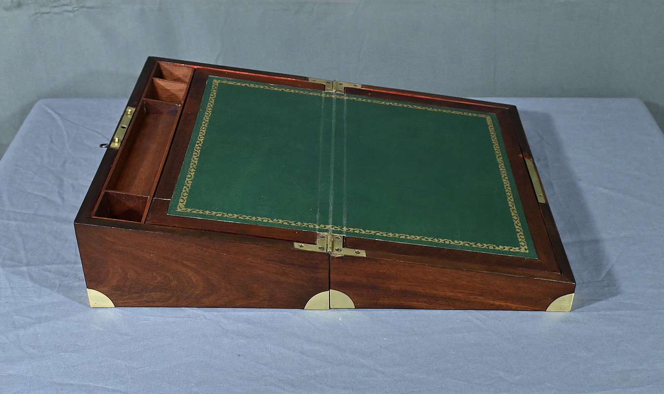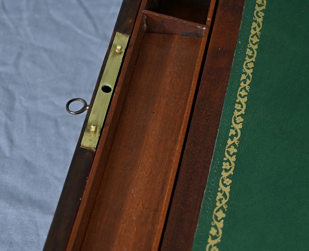 Écritoire de voyage en acajou massif doté d’un dessus avec plaque centrale en laiton en forme de blason et d’une serrure fonctionnelle. Cet objet allie élégance et praticité, offrant à la fois une surface d’écriture inclinée et plusieurs compartiments de rangement pour vos documents, plumes et encres. Il est agrémenté d’un cuir vert neuf avec vignette dorée. Dans la partie supérieure, nous trouvons trois casiers et un porte crayon amovible découvrant une cavité. Objet de collection et de décoration, cet écritoire de voyage ravira les amoureux d’articles historiques, on se plaira à imaginer les correspondances dont il fut le témoin et l’accessoire privilégié.