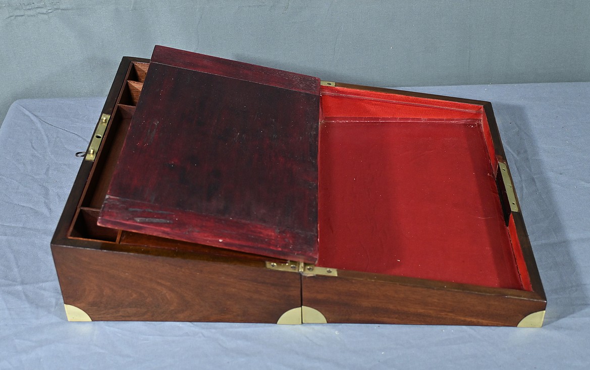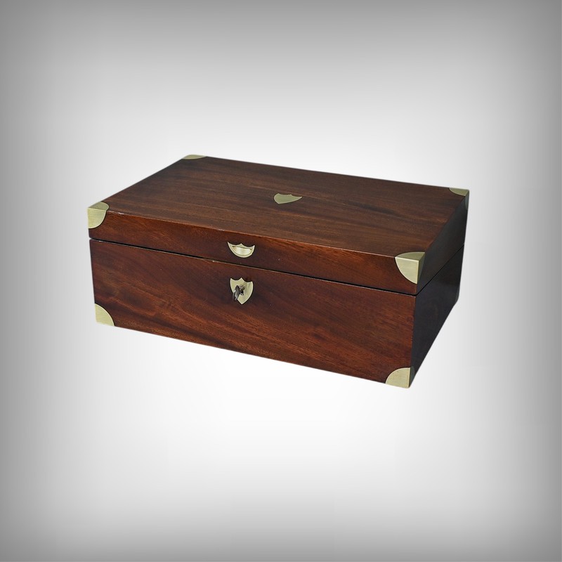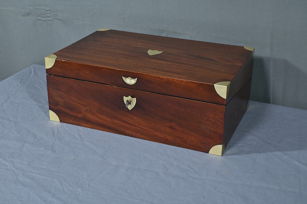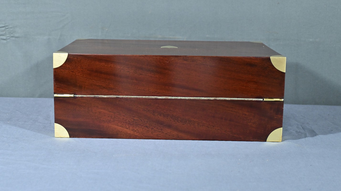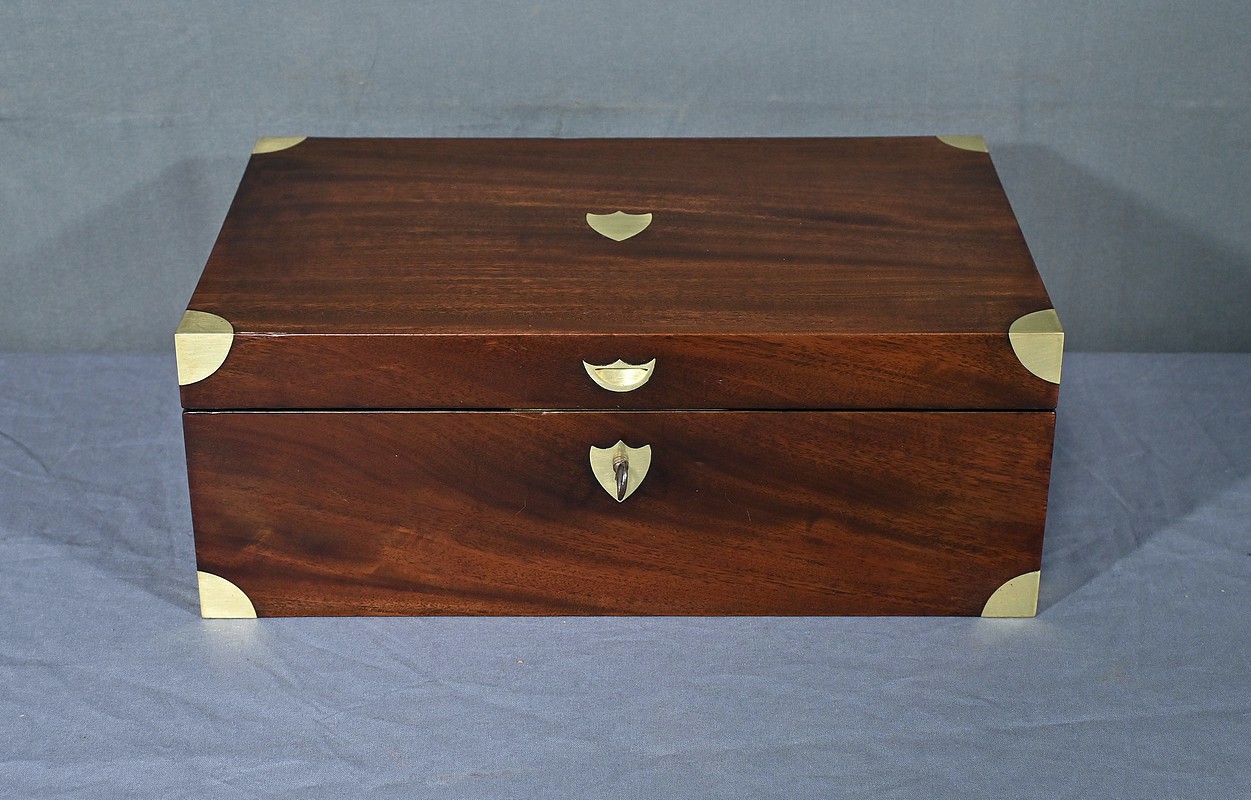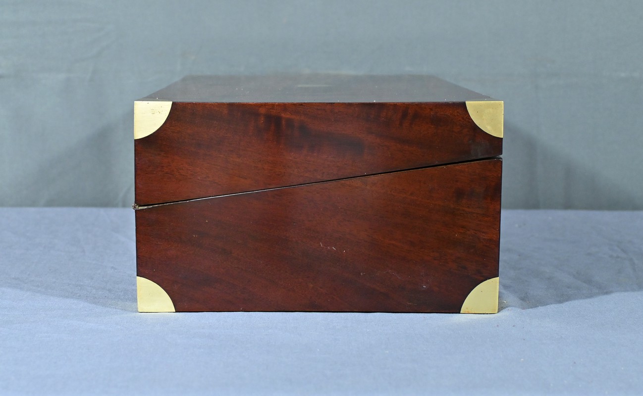Écritoire de voyage en acajou massif doté d’un dessus avec plaque centrale en laiton en forme de blason et d’une serrure fonctionnelle. Cet objet allie élégance et praticité, offrant à la fois une surface d’écriture inclinée et plusieurs compartiments de rangement pour vos documents, plumes et encres. Il est agrémenté d’un cuir vert neuf avec vignette dorée. Dans la partie supérieure, nous trouvons trois casiers et un porte crayon amovible découvrant une cavité. Objet de collection et de décoration, cet écritoire de voyage ravira les amoureux d’articles historiques, on se plaira à imaginer les correspondances dont il fut le témoin et l’accessoire privilégié.