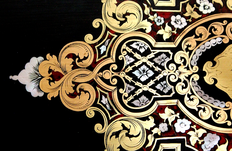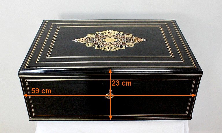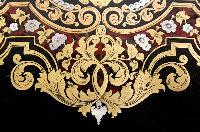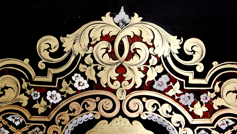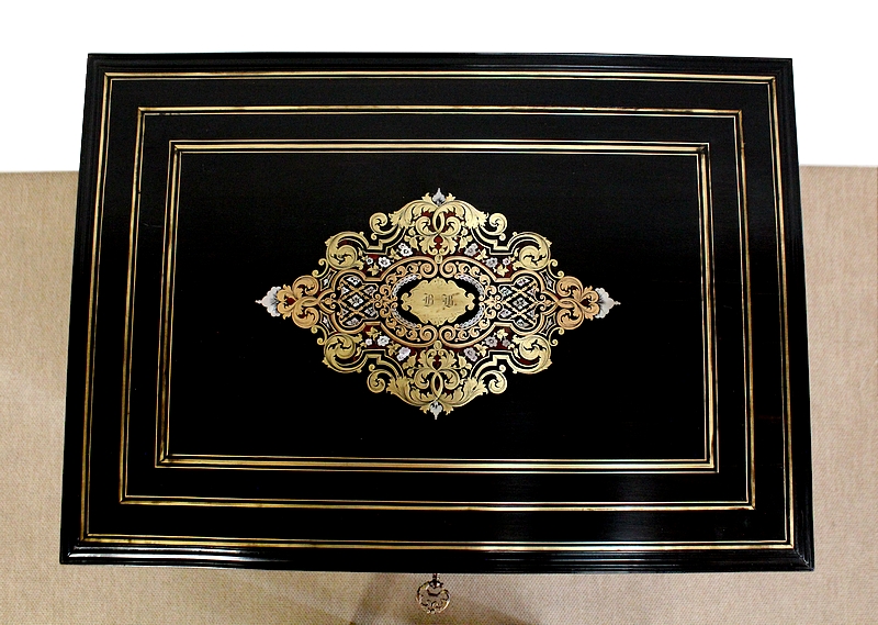 Sur le dessus, le pourtour mouluré présente une succession de trois filets de laiton qui encadrent un important motif aux incrustations de laiton, de nacre et d’écailles de tortue. Au centre, une plaque illustrée d’initiales est entourée d’arabesques, de feuilles et de fleurs s’entrelaçant.