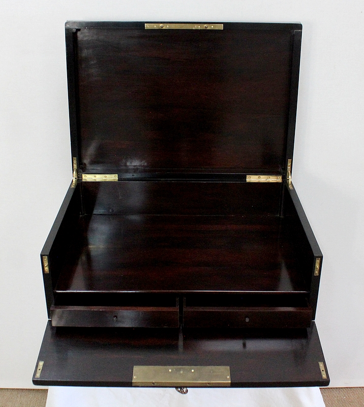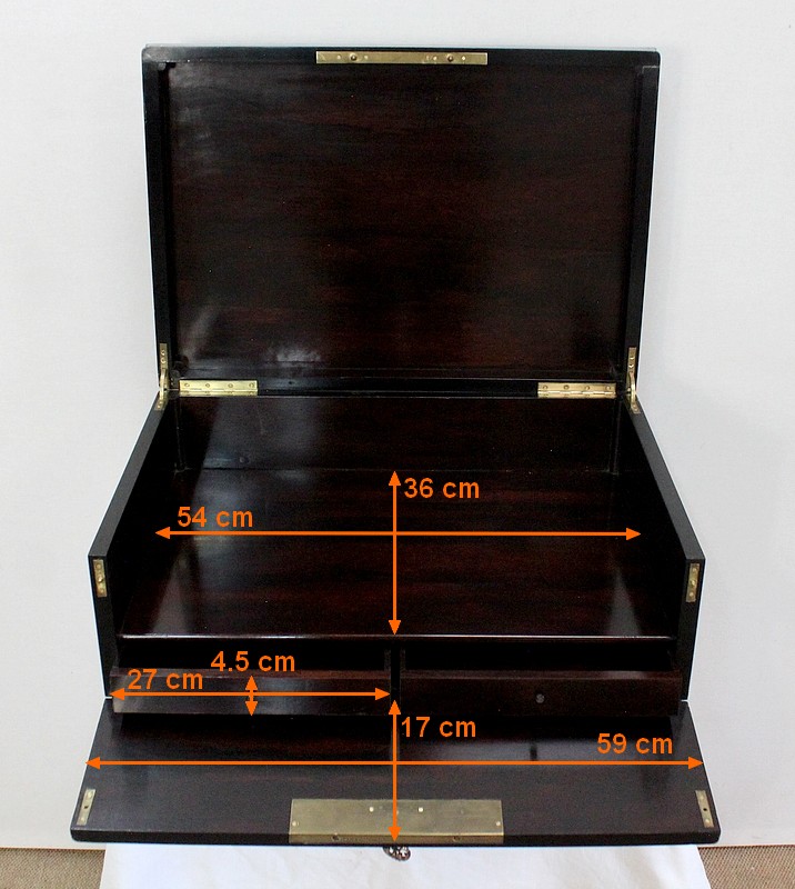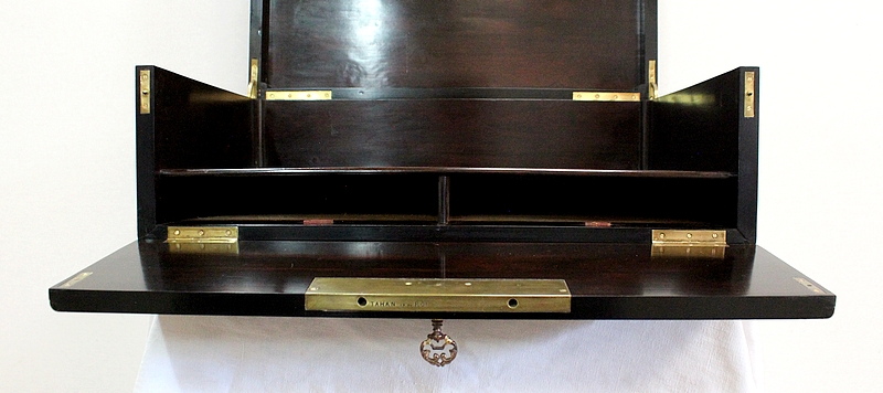 Une clé délicatement sculptée permet l’ouverture de cet écritoire. La serrure d’origine gravée – TAHAN – est en parfait état de fonctionnement.