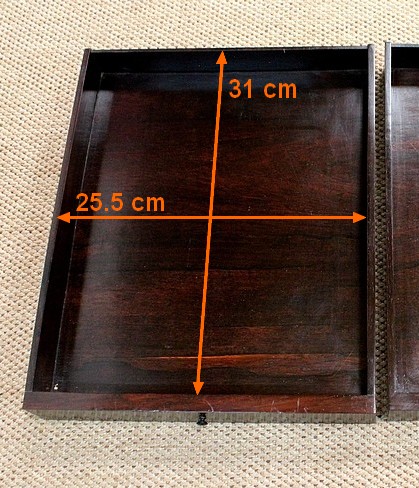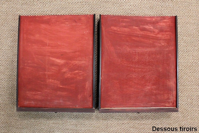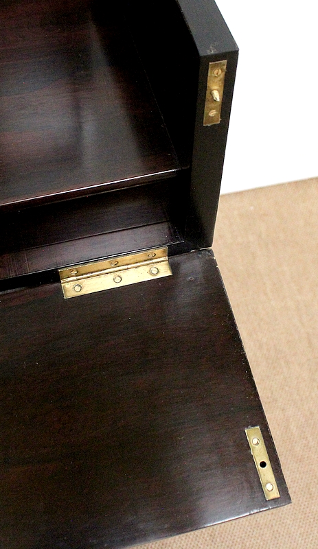 L’intérieur en Palissandre possède un espace de rangement et deux petits tiroirs avec boutons de tirage en ébène.