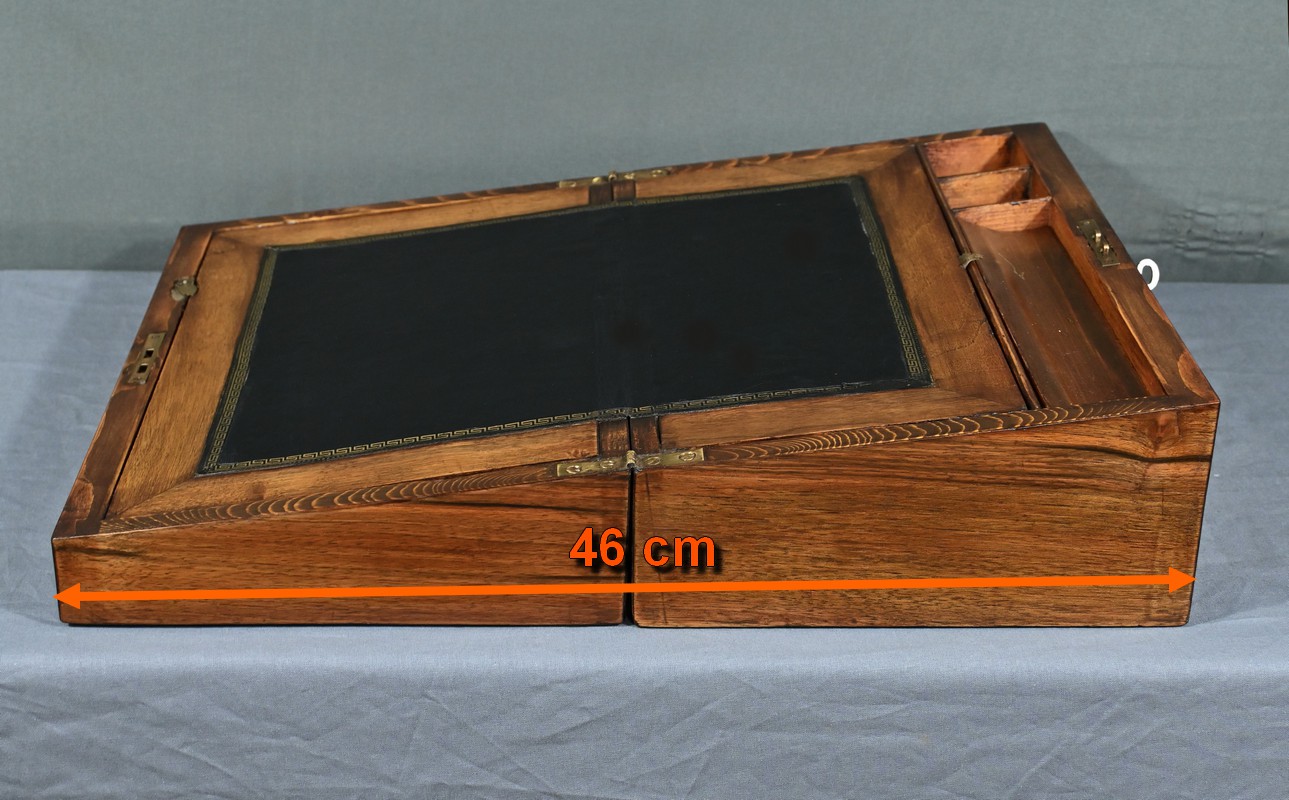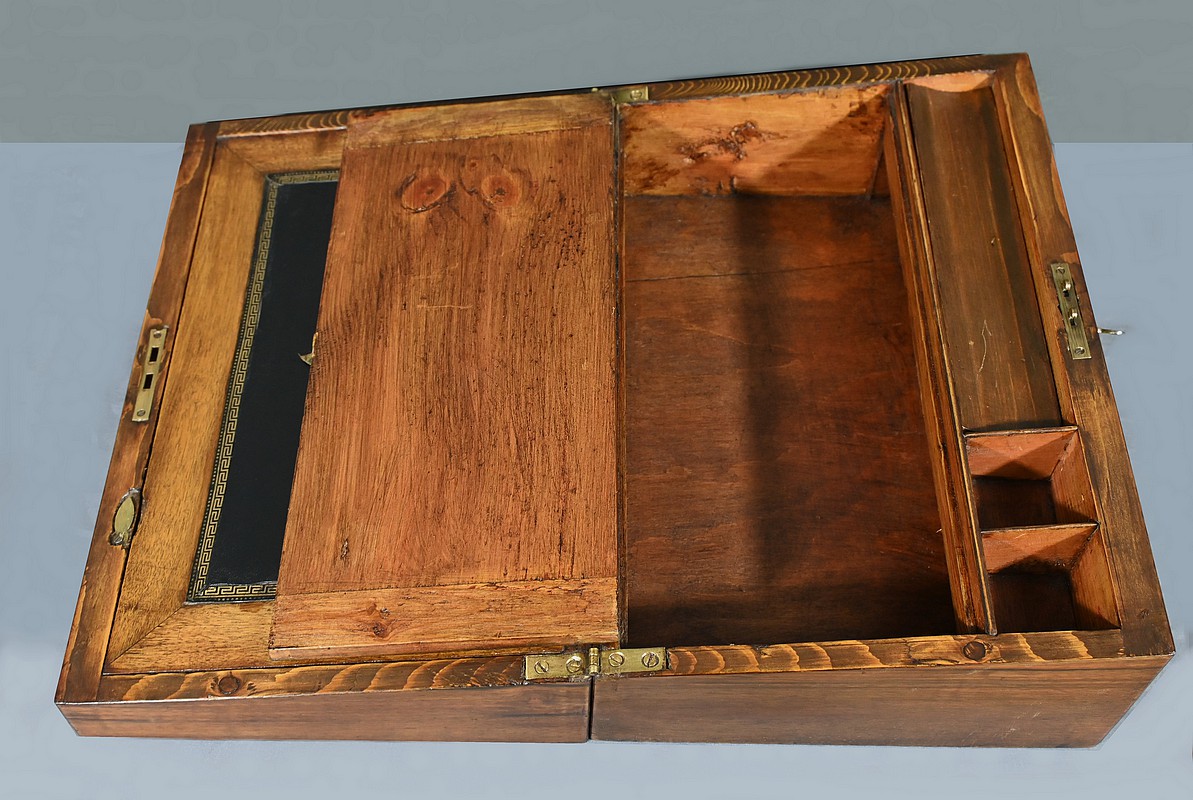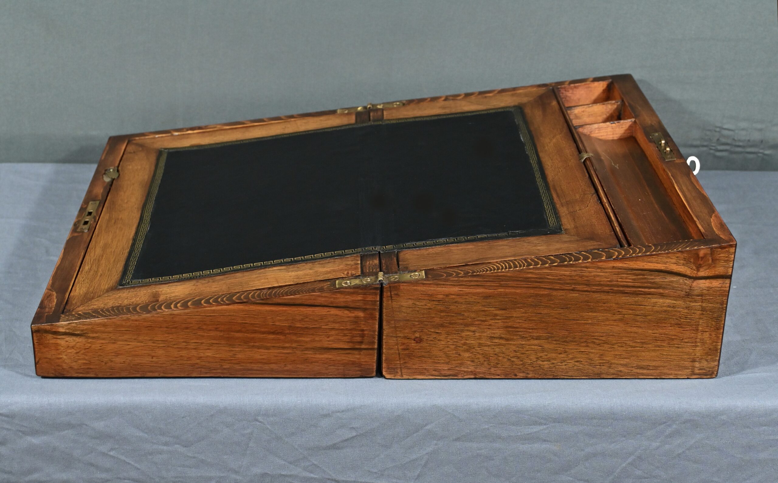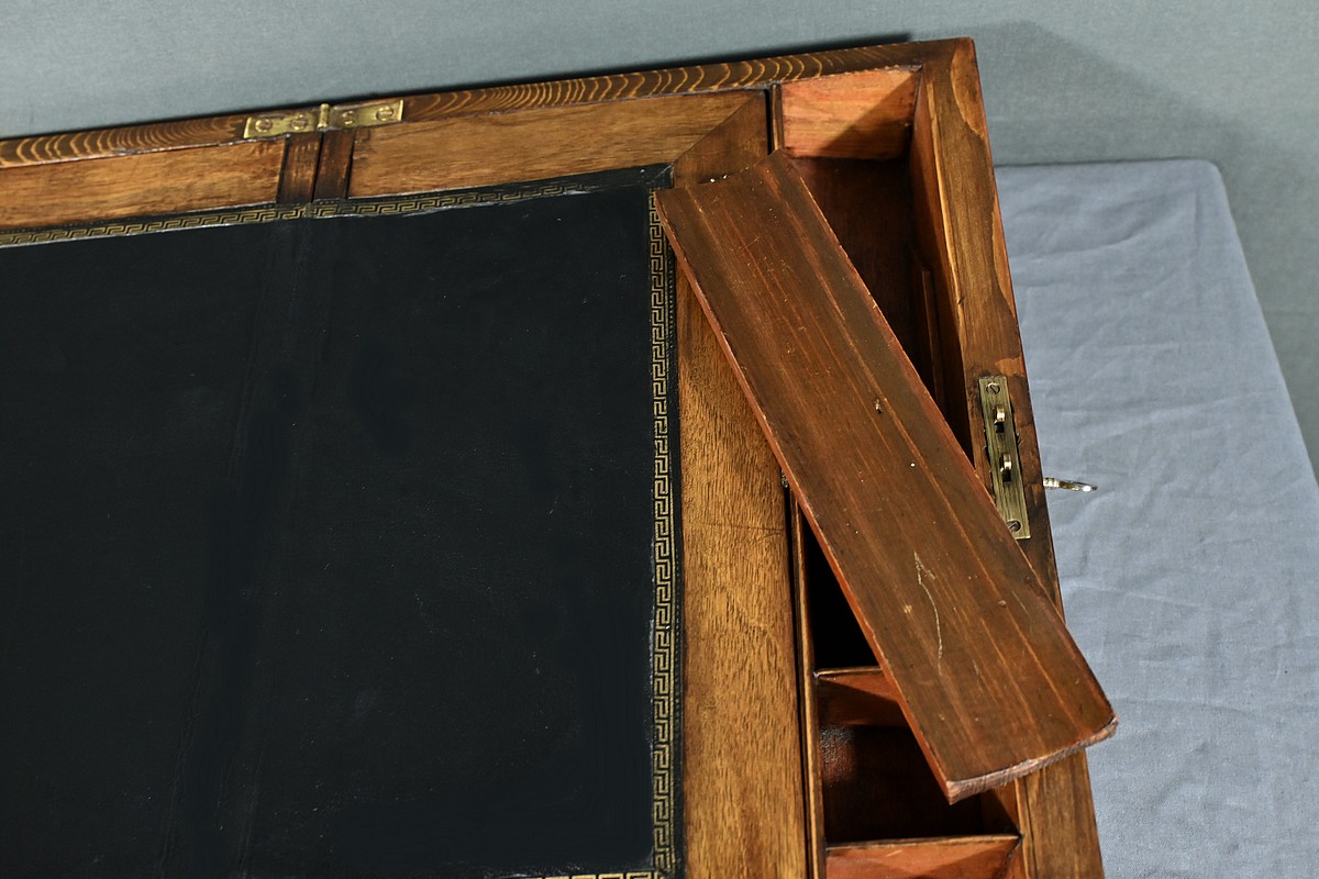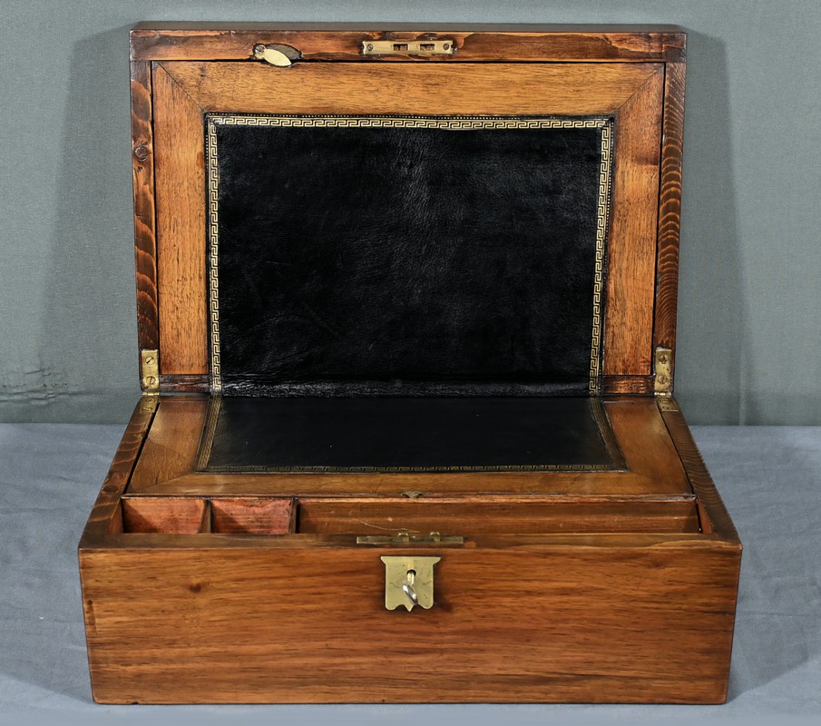 Écritoire de voyage en noyer doté d’un dessus avec plaque centrale en laiton et serrure fonctionnelle. Cet objet allie élégance et praticité, offrant à la fois une surface d’écriture inclinée et plusieurs compartiments de rangement pour vos documents, plumes et encres. Il est agrémenté d’un cuir noir avec vignette dorée à la grecque. Dans la partie supérieure, nous trouvons trois casiers et un porte crayon amovible découvrant une cavité. Objet de collection et de décoration, cet écritoire de voyage ravira les amoureux d’articles historiques, on se plaira à imaginer les correspondances dont il fut le témoin et l’accessoire privilégié.