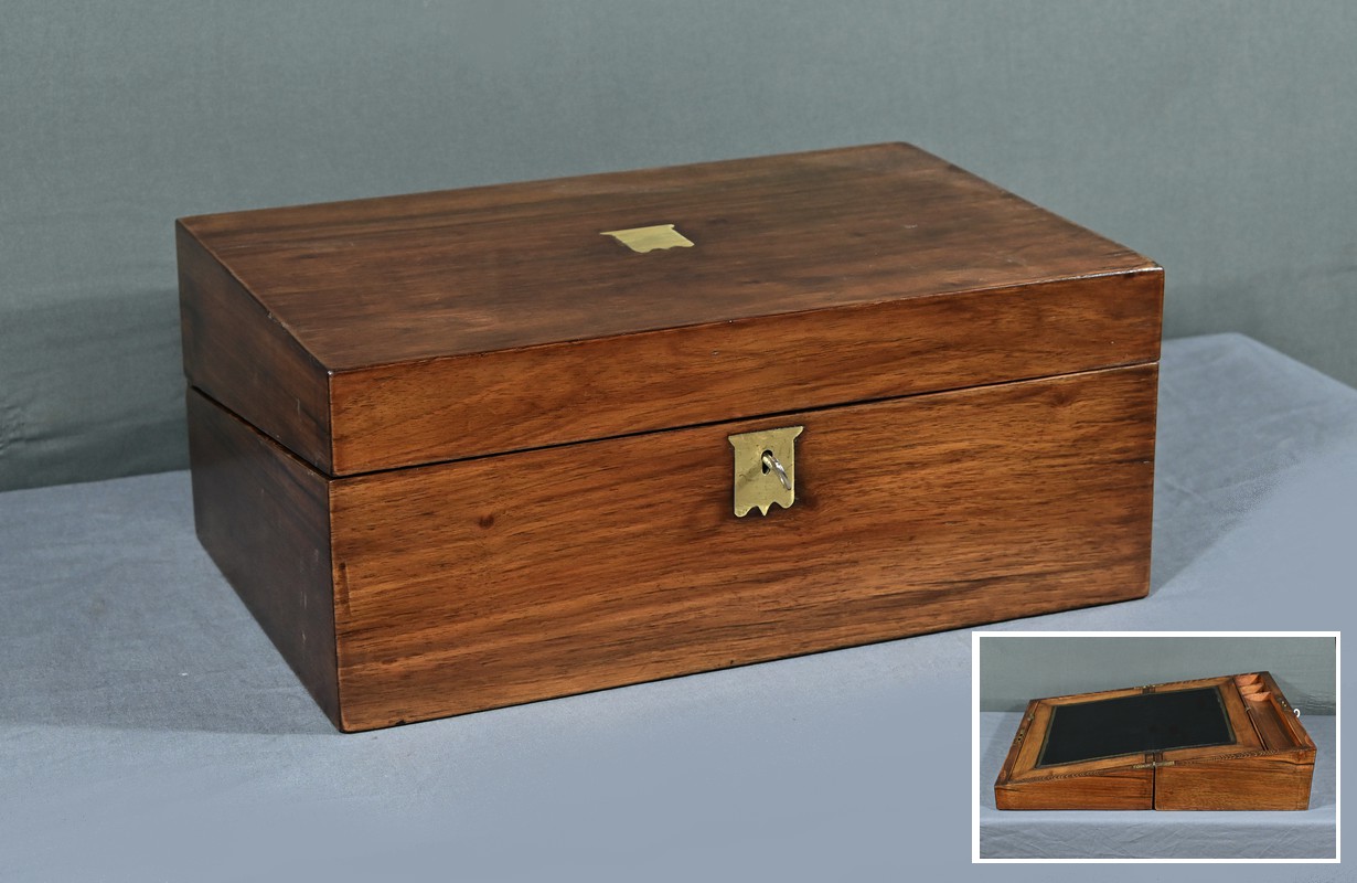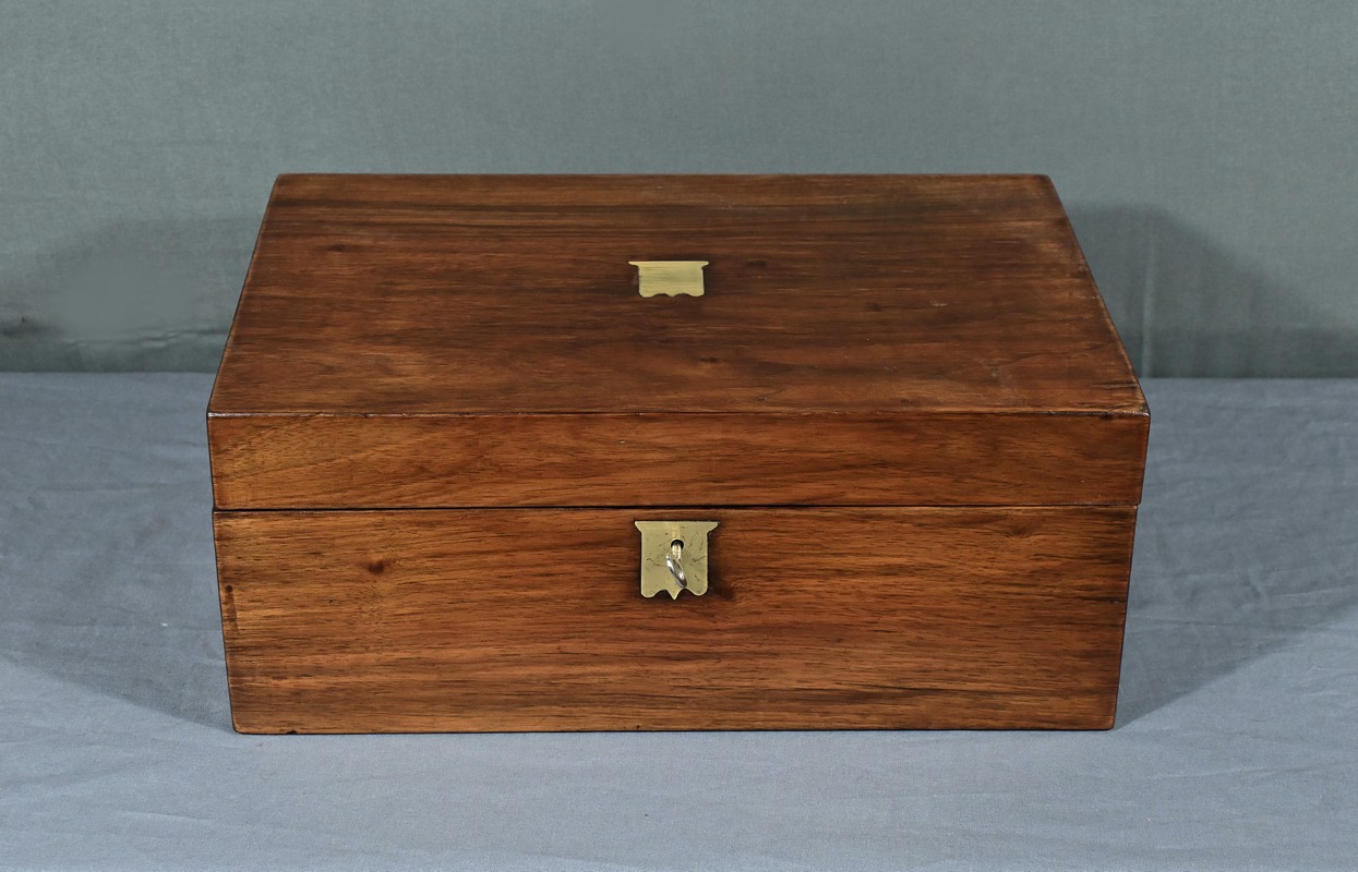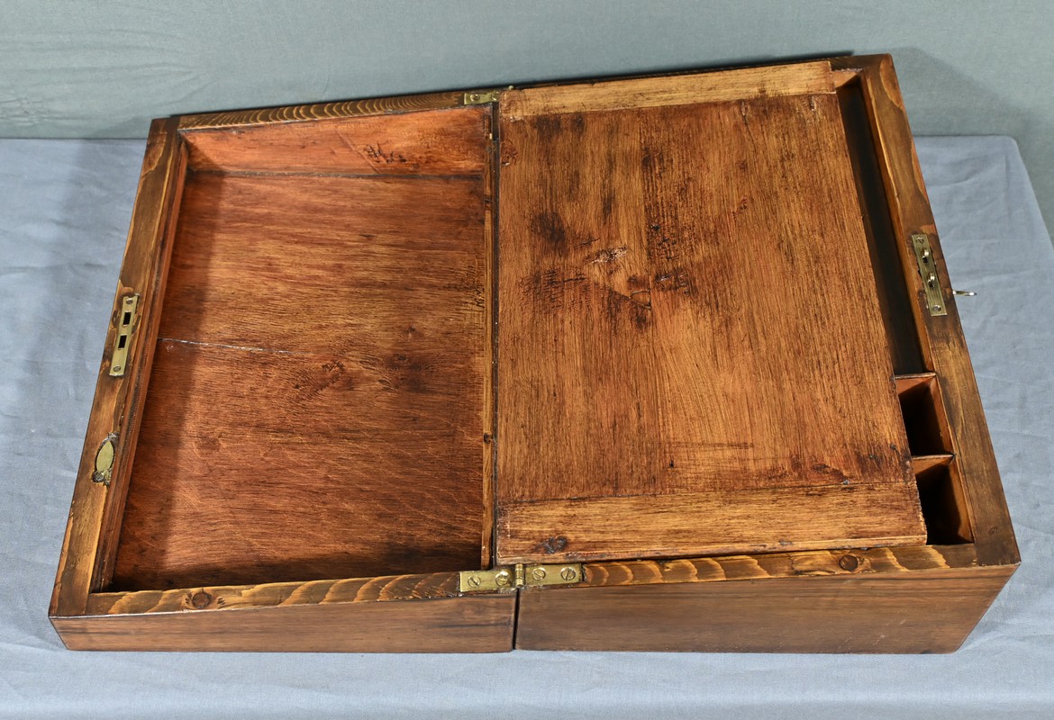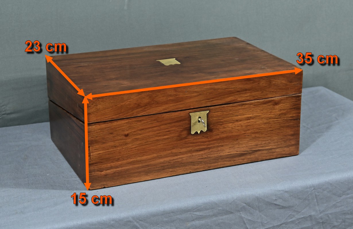 Écritoire de voyage en noyer doté d’un dessus avec plaque centrale en laiton et serrure fonctionnelle. Cet objet allie élégance et praticité, offrant à la fois une surface d’écriture inclinée et plusieurs compartiments de rangement pour vos documents, plumes et encres. Il est agrémenté d’un cuir noir avec vignette dorée à la grecque. Dans la partie supérieure, nous trouvons trois casiers et un porte crayon amovible découvrant une cavité. Objet de collection et de décoration, cet écritoire de voyage ravira les amoureux d’articles historiques, on se plaira à imaginer les correspondances dont il fut le témoin et l’accessoire privilégié.