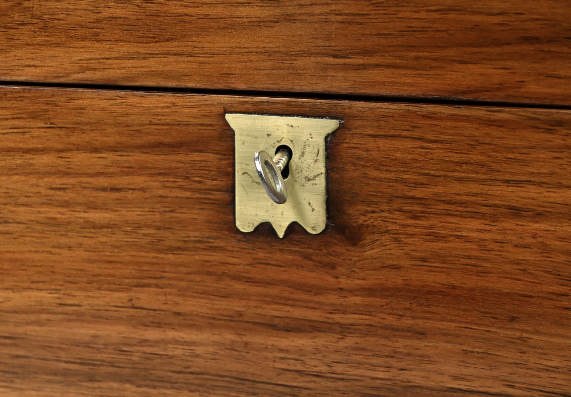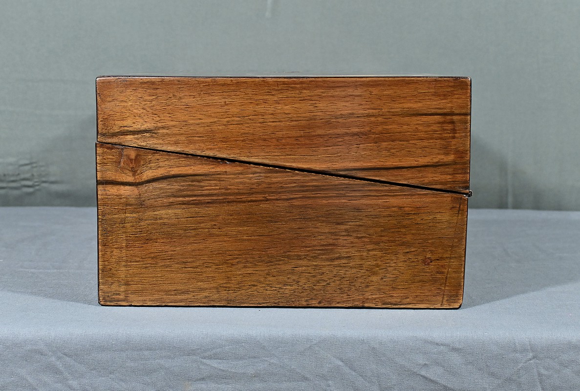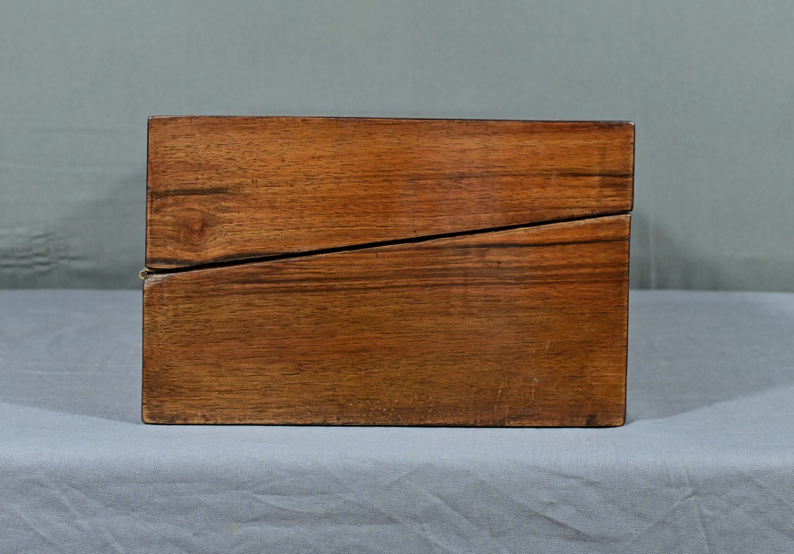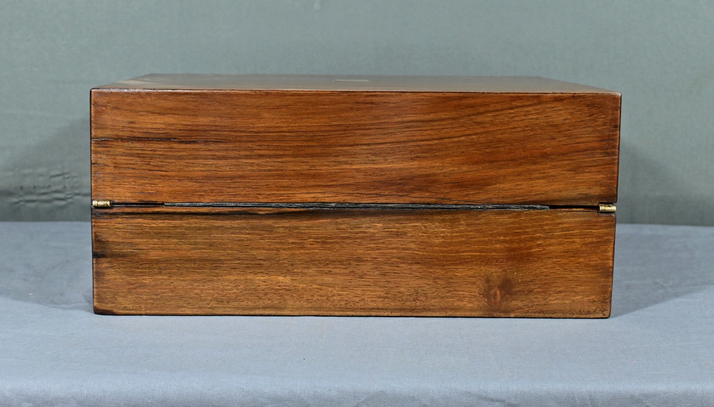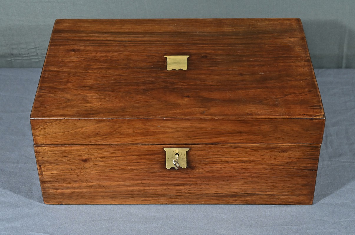 Écritoire de voyage en noyer doté d’un dessus avec plaque centrale en laiton et serrure fonctionnelle. Cet objet allie élégance et praticité, offrant à la fois une surface d’écriture inclinée et plusieurs compartiments de rangement pour vos documents, plumes et encres. Il est agrémenté d’un cuir noir avec vignette dorée à la grecque. Dans la partie supérieure, nous trouvons trois casiers et un porte crayon amovible découvrant une cavité. Objet de collection et de décoration, cet écritoire de voyage ravira les amoureux d’articles historiques, on se plaira à imaginer les correspondances dont il fut le témoin et l’accessoire privilégié.