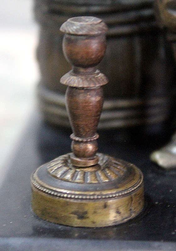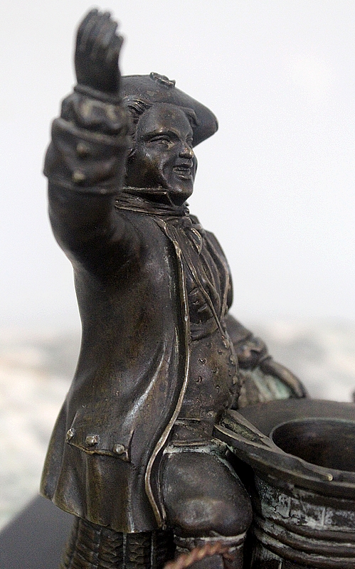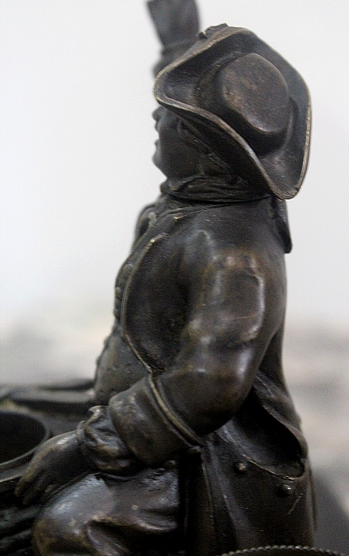 Le Sujet qui se présente à nous est manifestement Jovial et Souriant. Sa tête et son regard sont légèrement dirigés vers la droite. C’est avec Enthousiasme qu’il semble saluer des Passants. Cet Aimable personnage laisse penser qu’il est bien connu des Habitants. On pourrait imaginer qu’il est itinérant : Navigateur ou bien Marchand de profession et qu’il viendrait d’accoster sur le port. À sa gauche, on aperçoit un Bougeoir et une Coupe sur pieds, puis à sa droite, un Panier recouvert d’une Nappe. Des couverts sont disposés sur le rebord du Fût Encrier campé devant lui.
