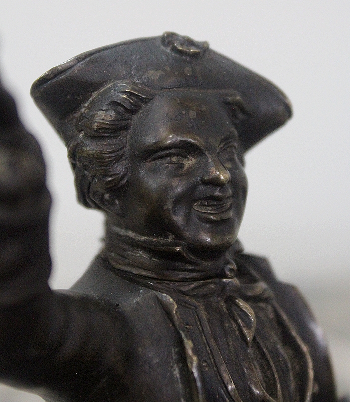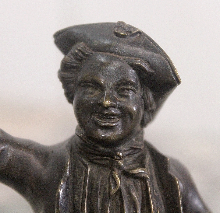 Cette Scène Centenaire illustre un Gentilhomme assis sur un simple Panier renversé, et installé autour d’un Tonneau. Son visage Joufflu et son expression Rieuse dépeint quelque Rides du Sourire. Sa tête est chapeautée d’un Tricorne laissant apparaître une chevelure Courte et Souple.