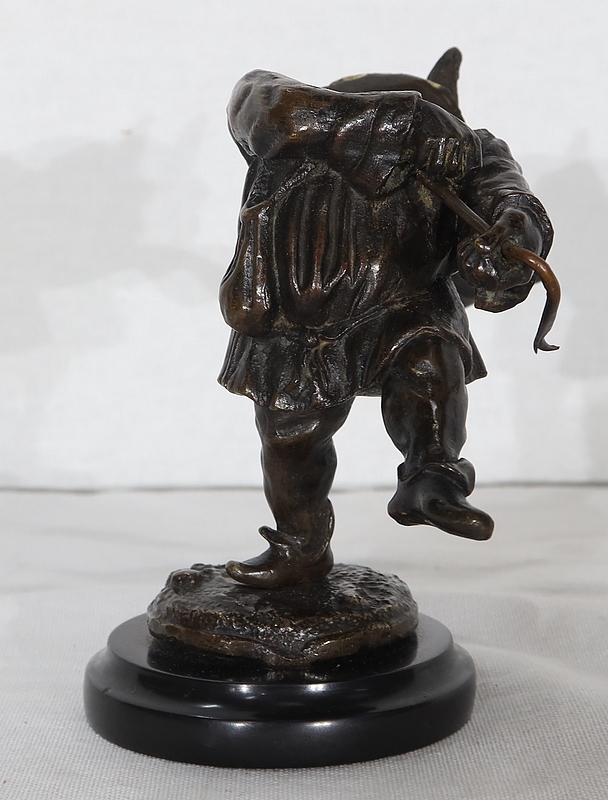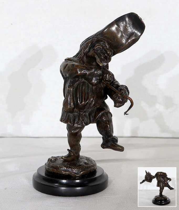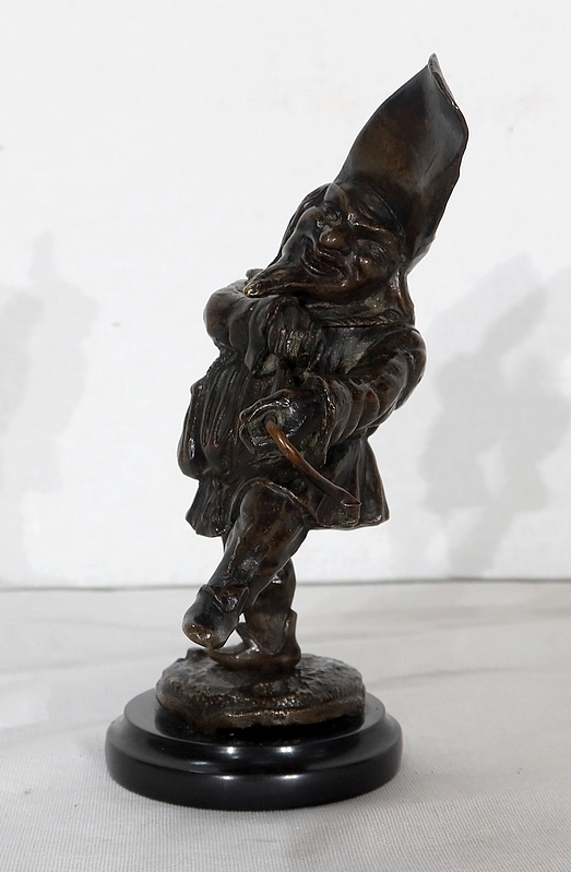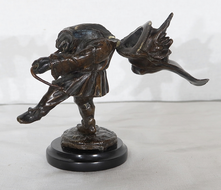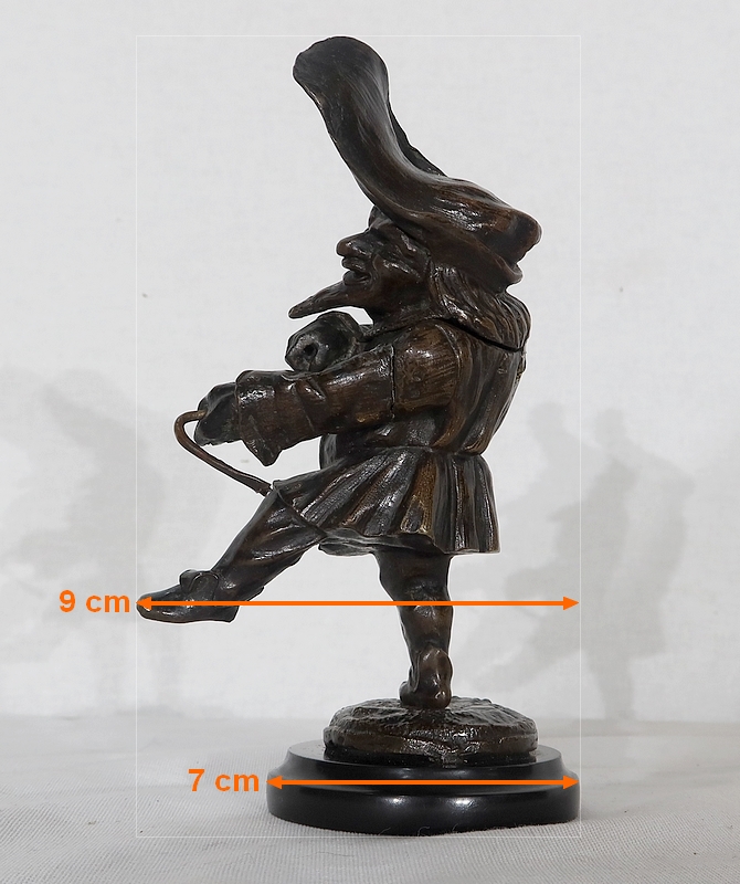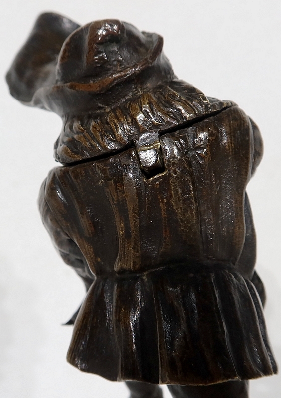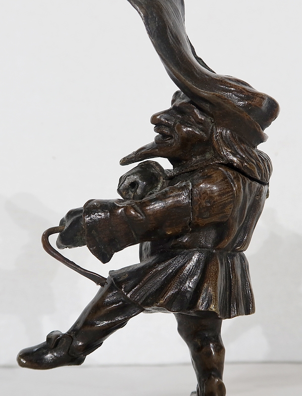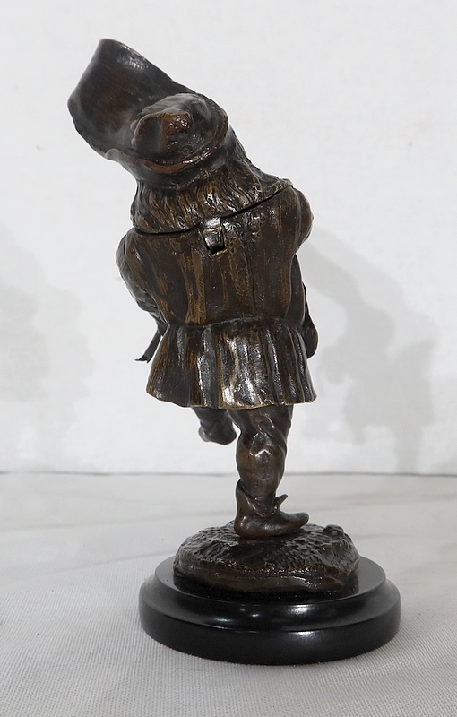 Bronze à patine brune formant encrier représentant un petit personnage cocasse coiffé d’un long chapeau et vêtu d’une tenue moyenâgeuse accompagnée d’une bourse.