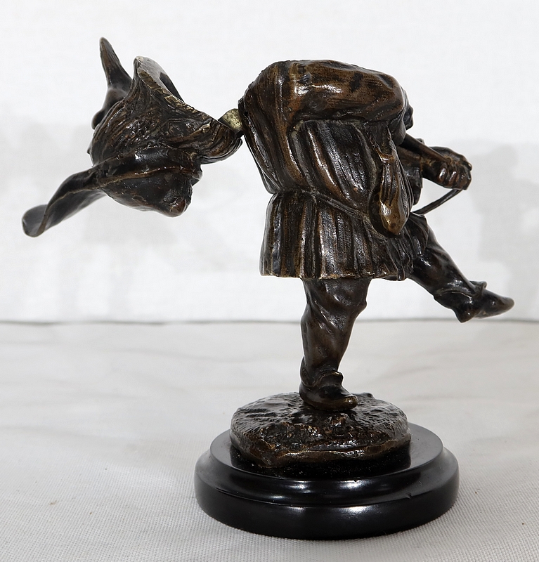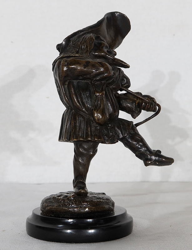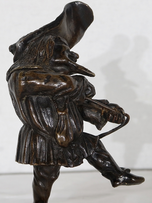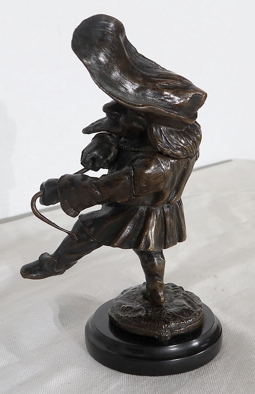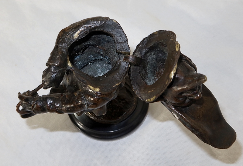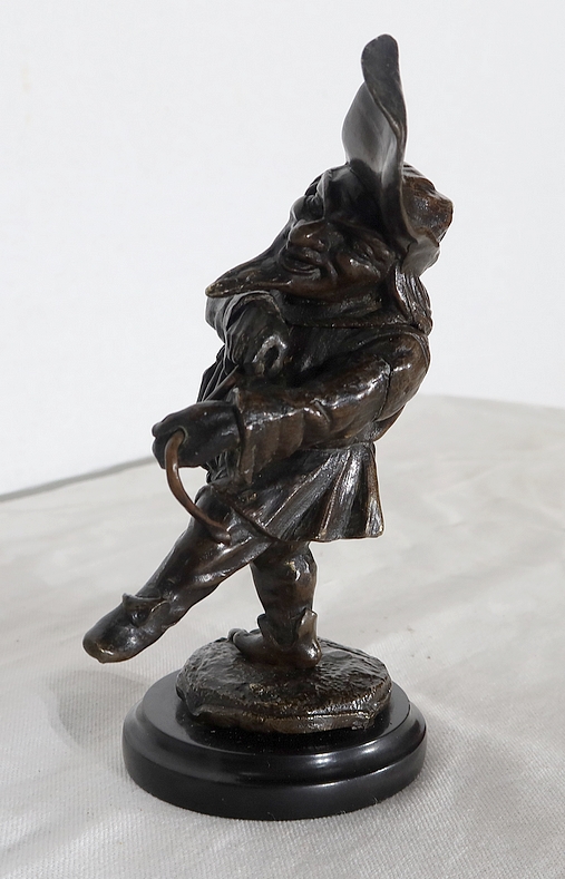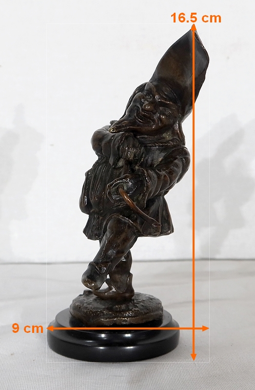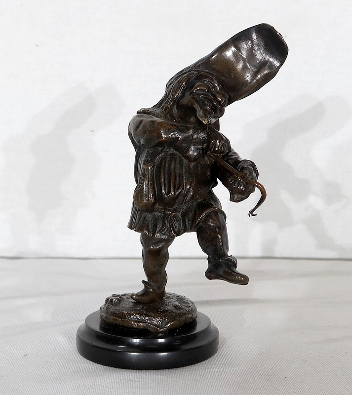 Bronze à patine brune formant encrier représentant un petit personnage cocasse coiffé d’un long chapeau et vêtu d’une tenue moyenâgeuse accompagnée d’une bourse.