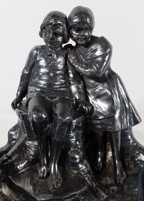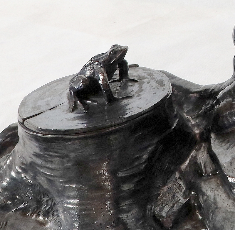 Les enfants sont collés l’un à l’autre, semblant effrayés par l’attitude des batraciens les fixant, près à bondir. Le garçonnet tient solidement la souche sur laquelle il est assis et la fillette s’accroche à son compagnon. Ils sont pieds nus et portent des vêtements finement sculptés.
