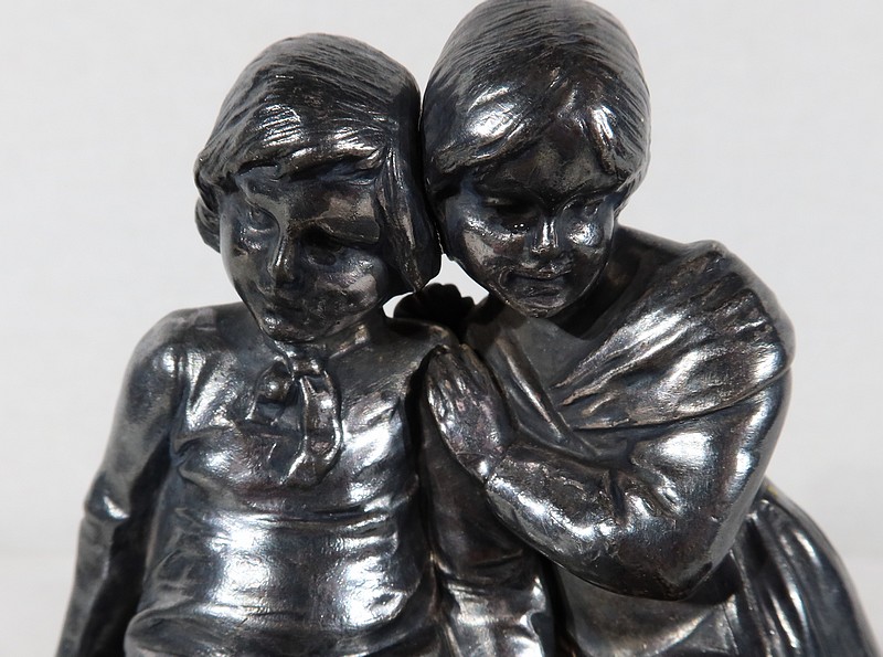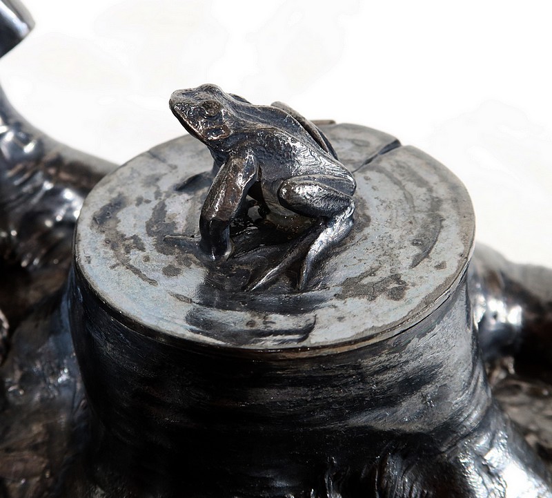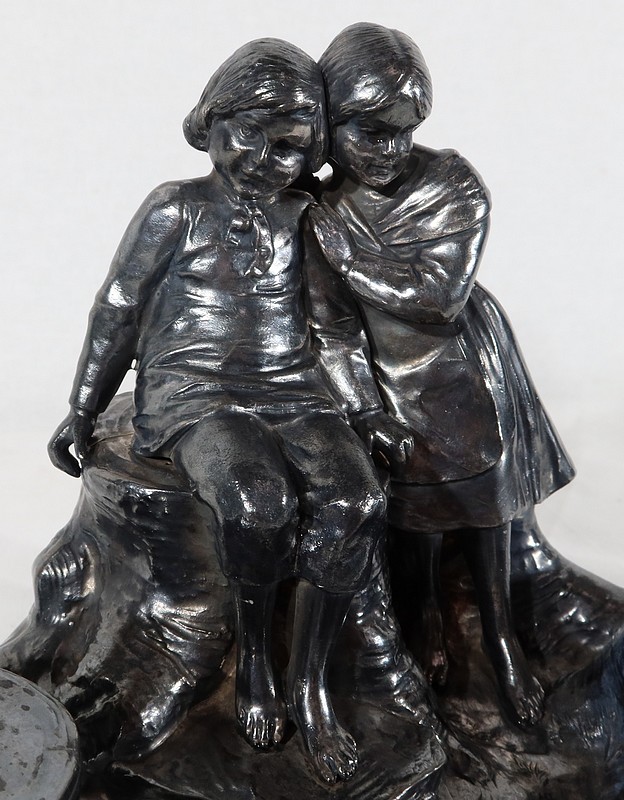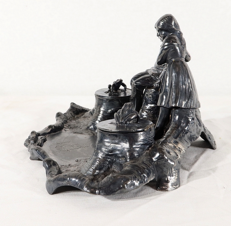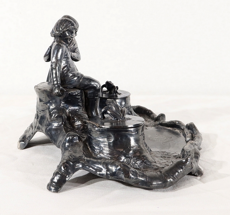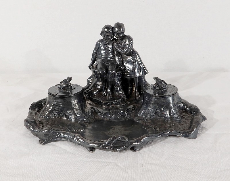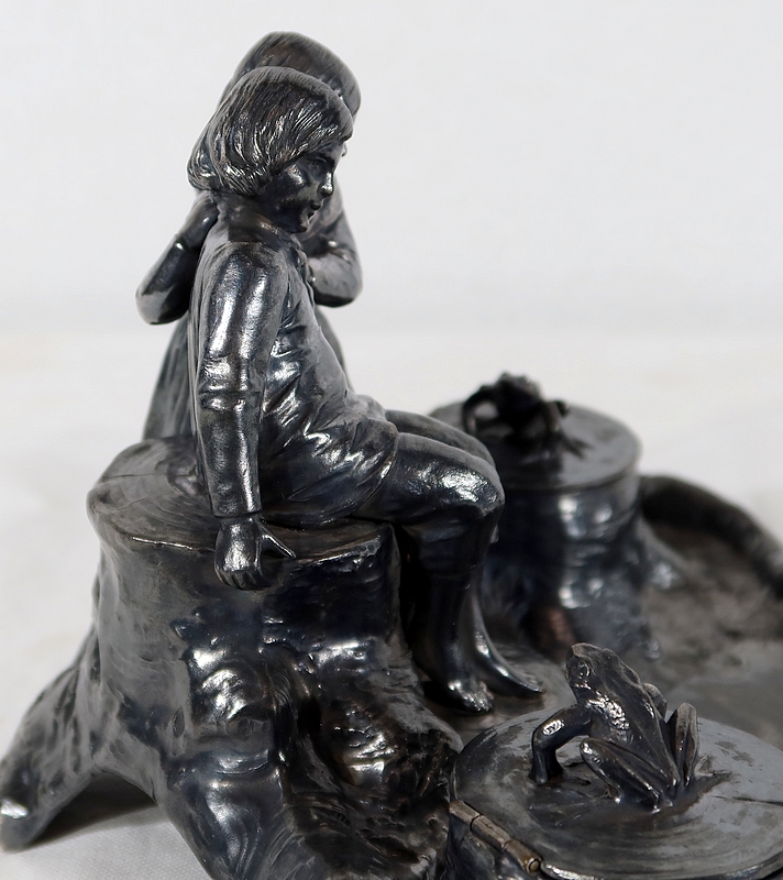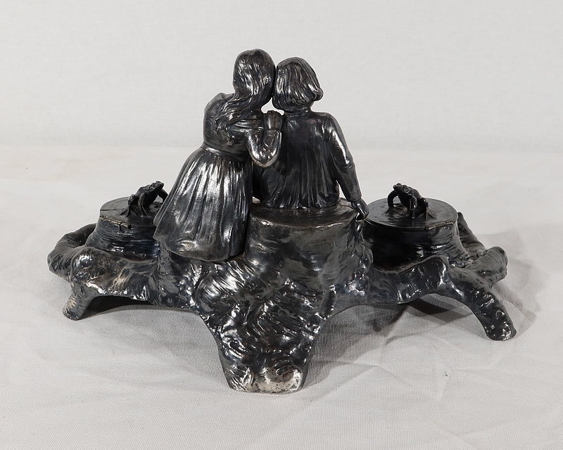 Bel encrier en étain monogrammé figurant deux jeunes enfants regardant chacun une grenouille disposée sur un encrier.