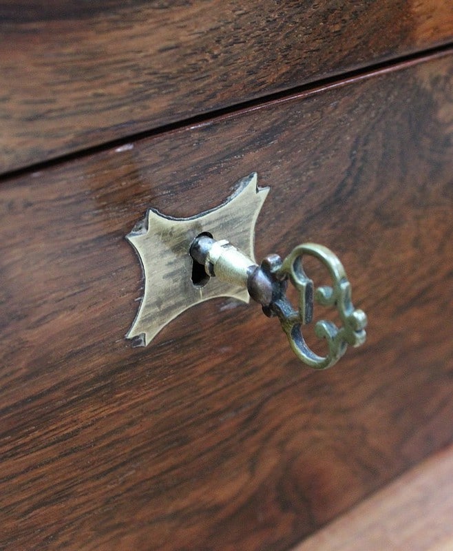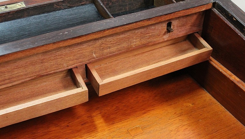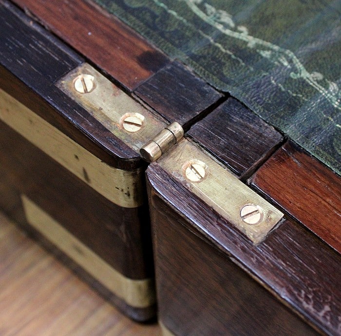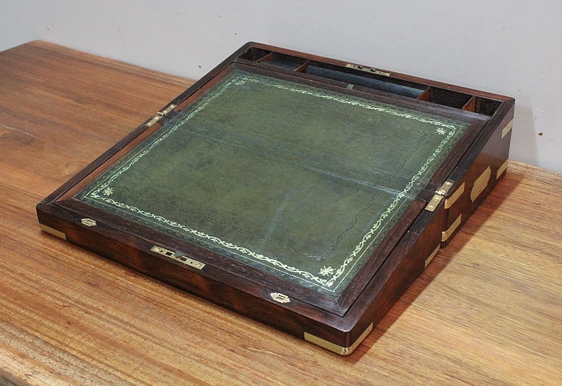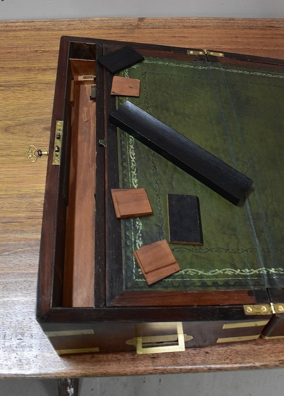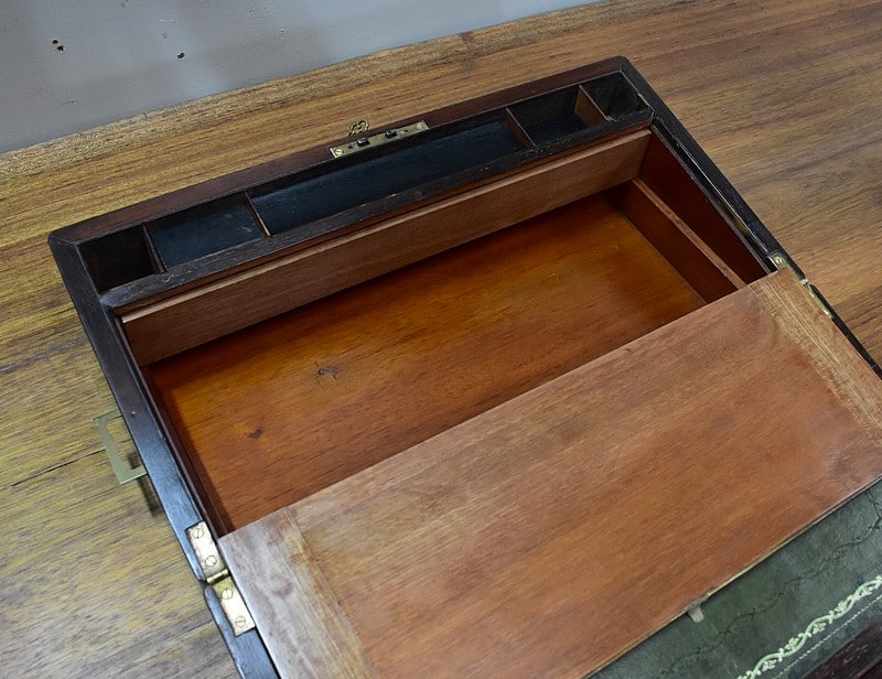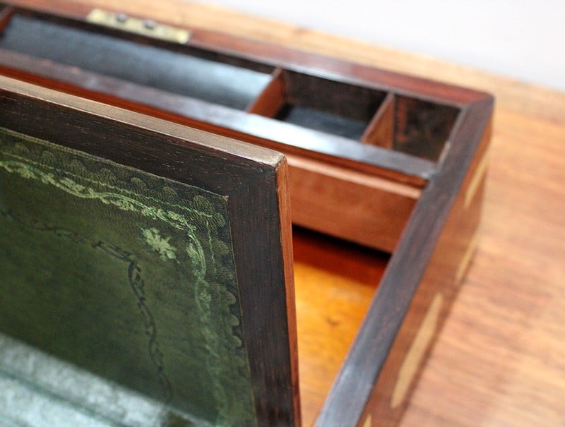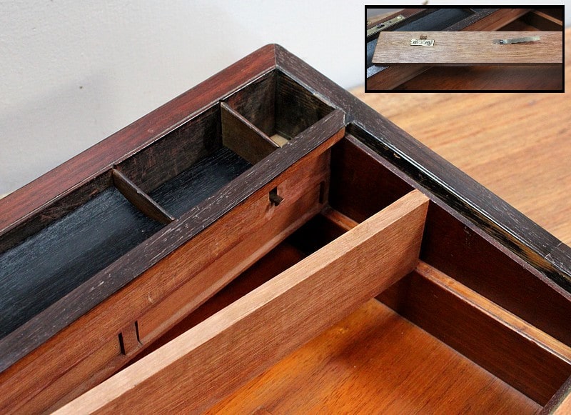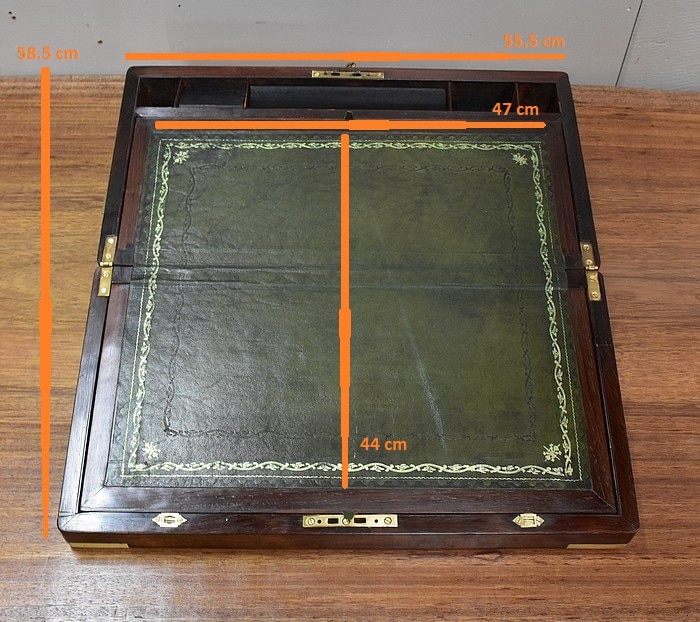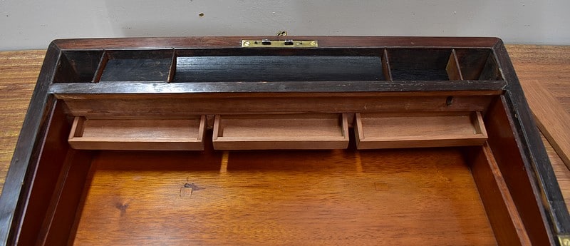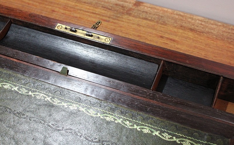 Une fois déverrouillé, ce Coffret devient un Écritoire incliné, recouvert d’un cuir ancien à dominante Verte et enjolivé de frises tantôt Dorées tantôt sur fond dur. Cette zone de travail propose également en partie haute plusieurs petits compartiments de rangements, et sous le cuir deux espaces plus grands. Dans l’un d’eux, on notera la présence de trois petits tiroirs secrets, dissimulés sous un tasseau amovible.