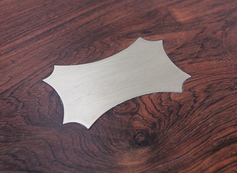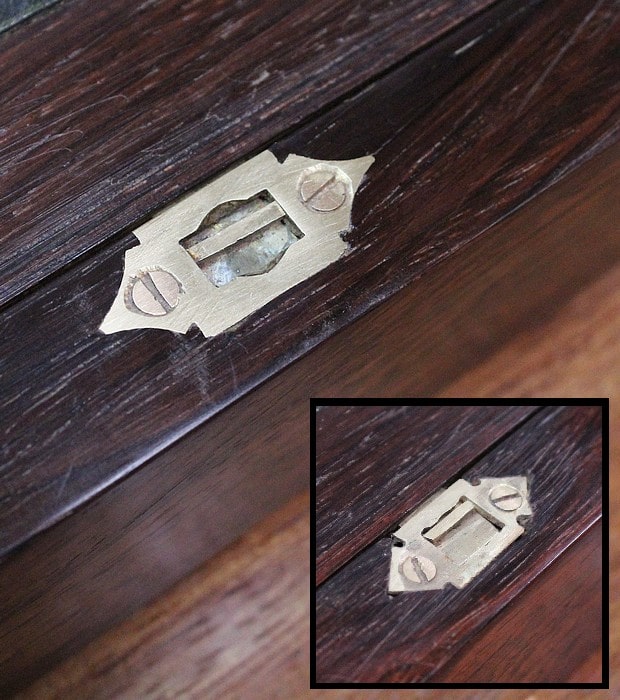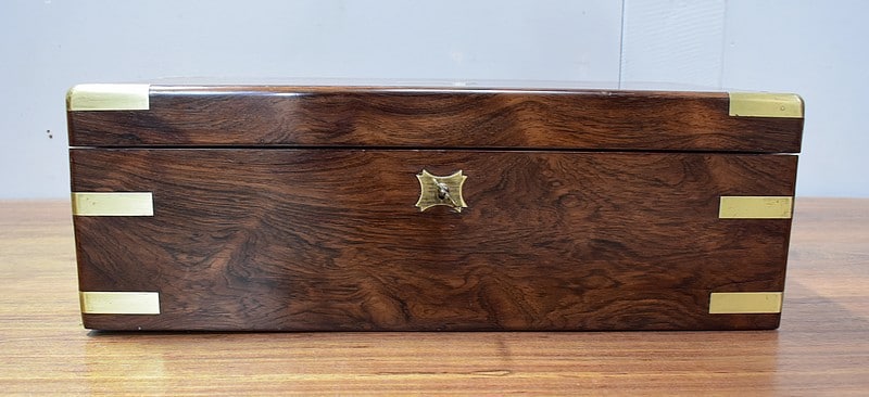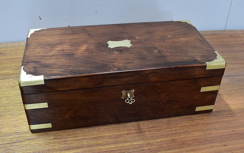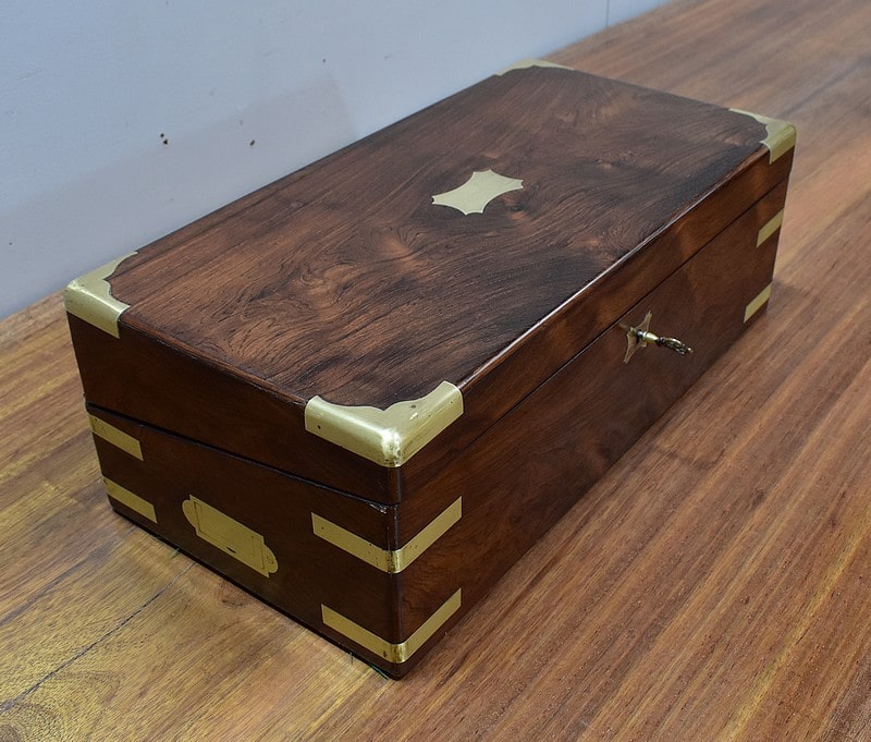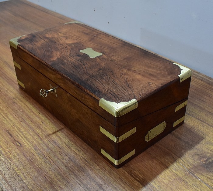 Coffret de Marine en bois de Palissandre, avec plaques en laiton découpé, à fonction décorative sur son dessus et de protection dans ses angles. Il est doté d’une serrure fonctionnelle et de sa clé d’origine.
