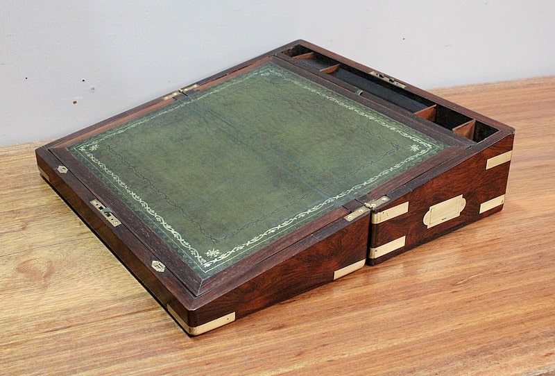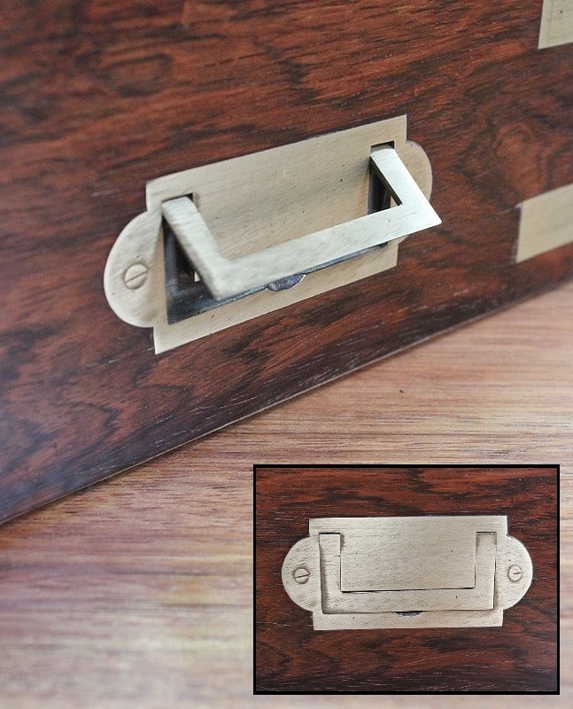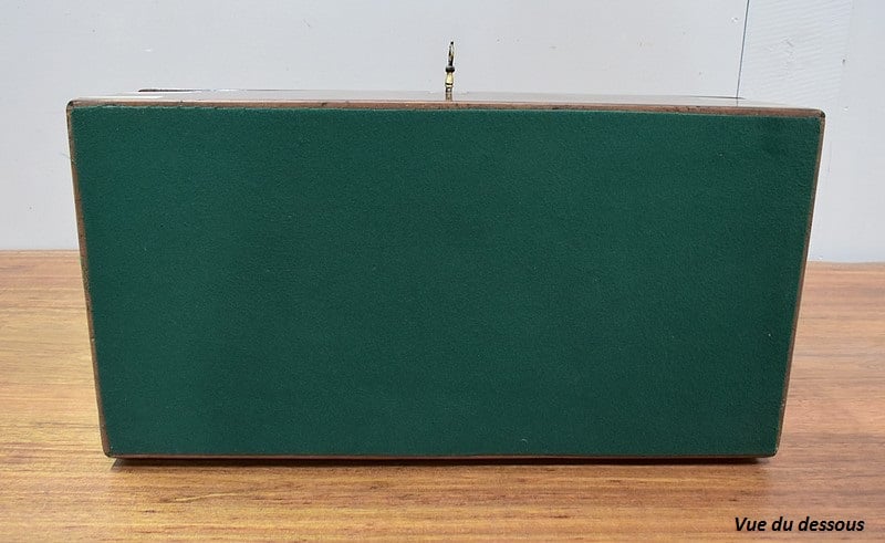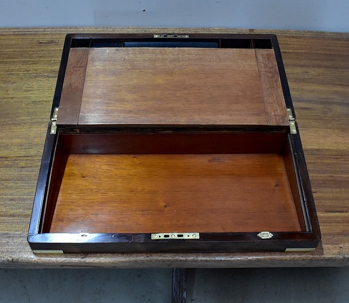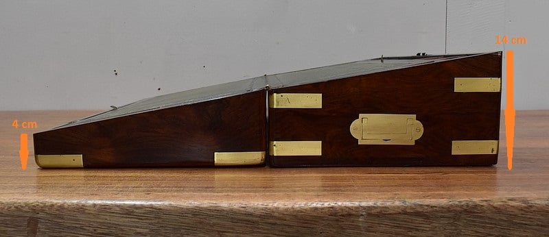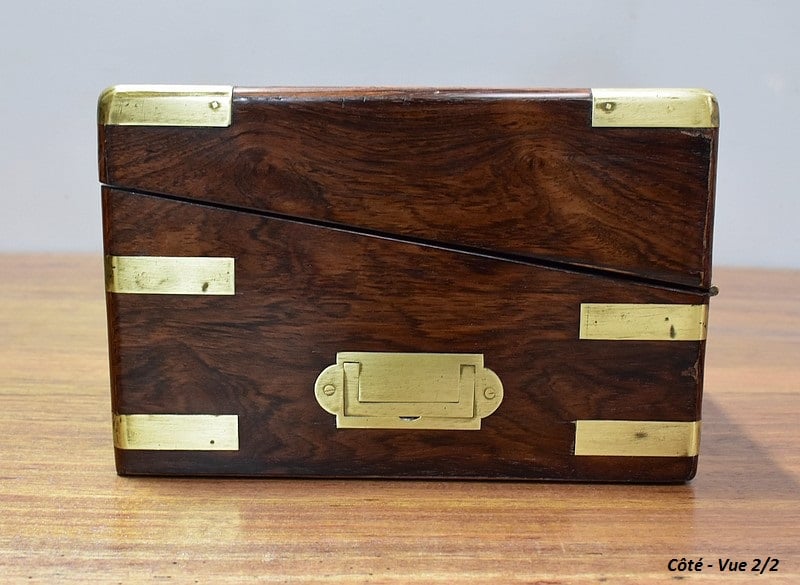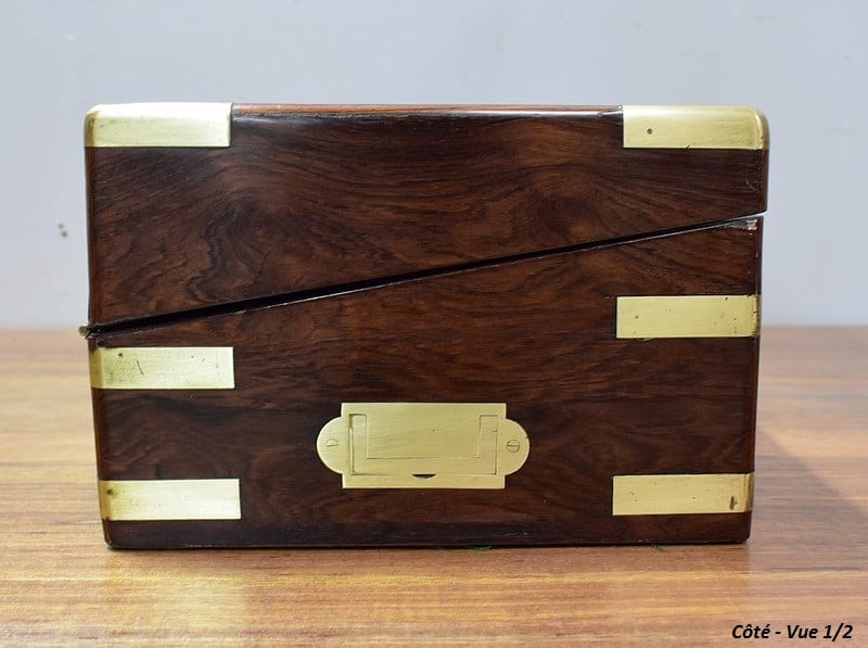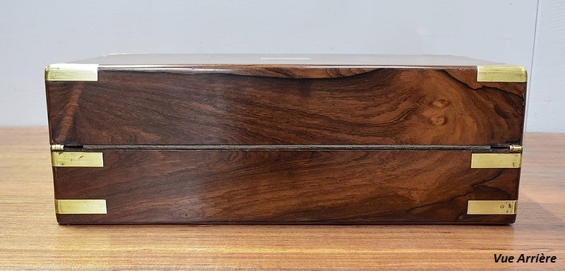 On appréciera l’Élégance de ce Coffret Écritoire, ainsi que sa praticité, qu’il doit notamment aux deux poignées encastrées en laiton dont sont pourvus ses côtés.