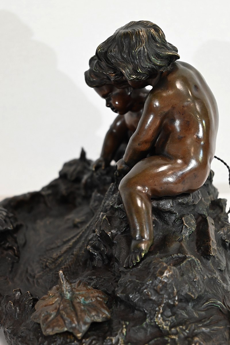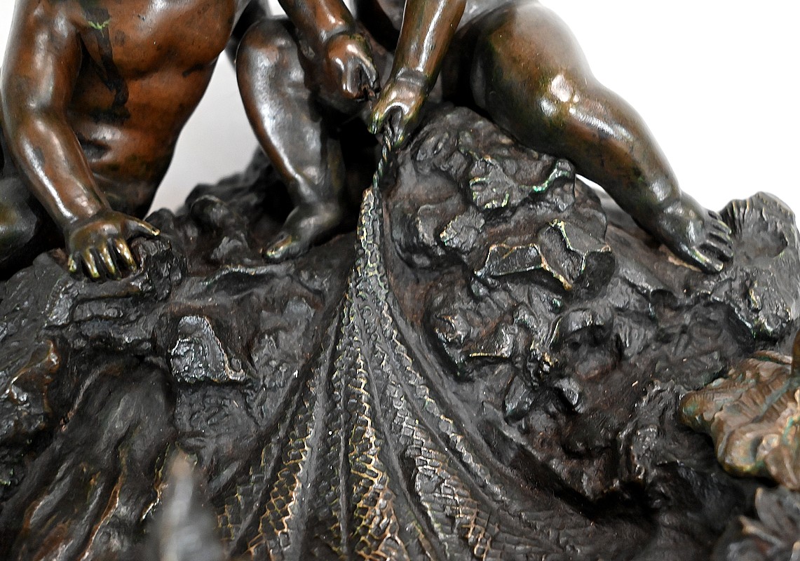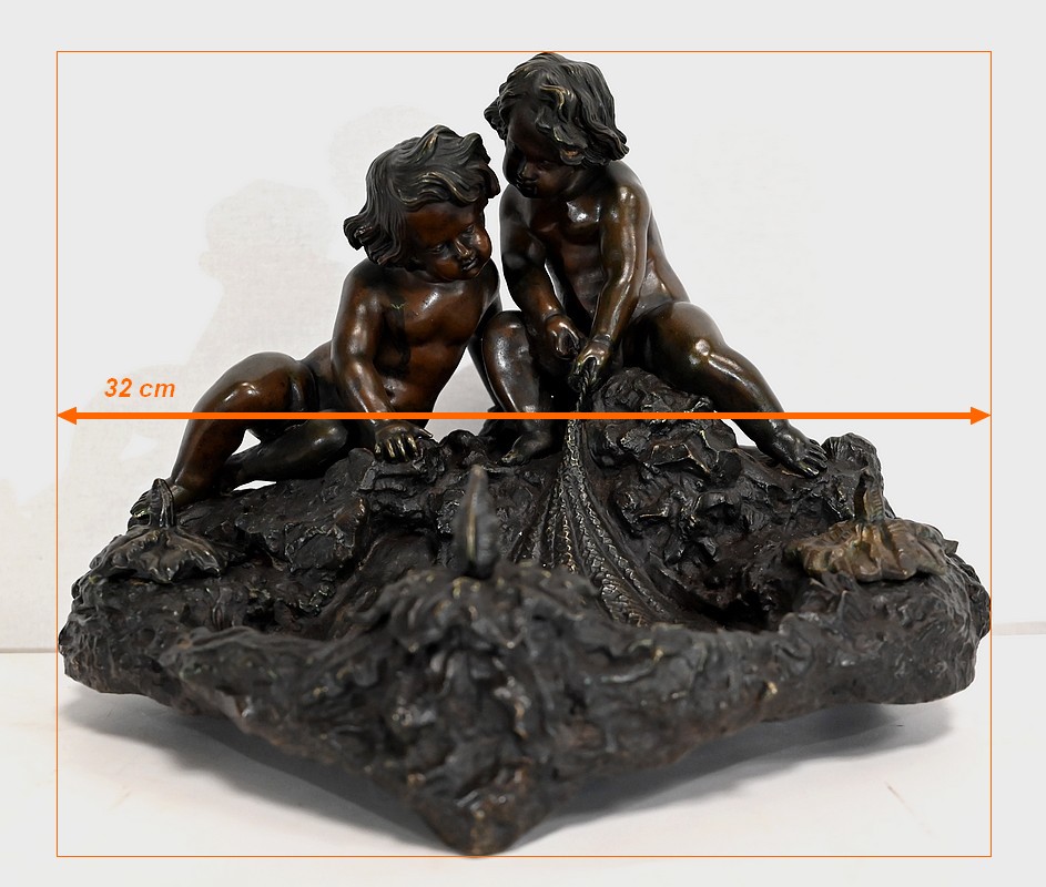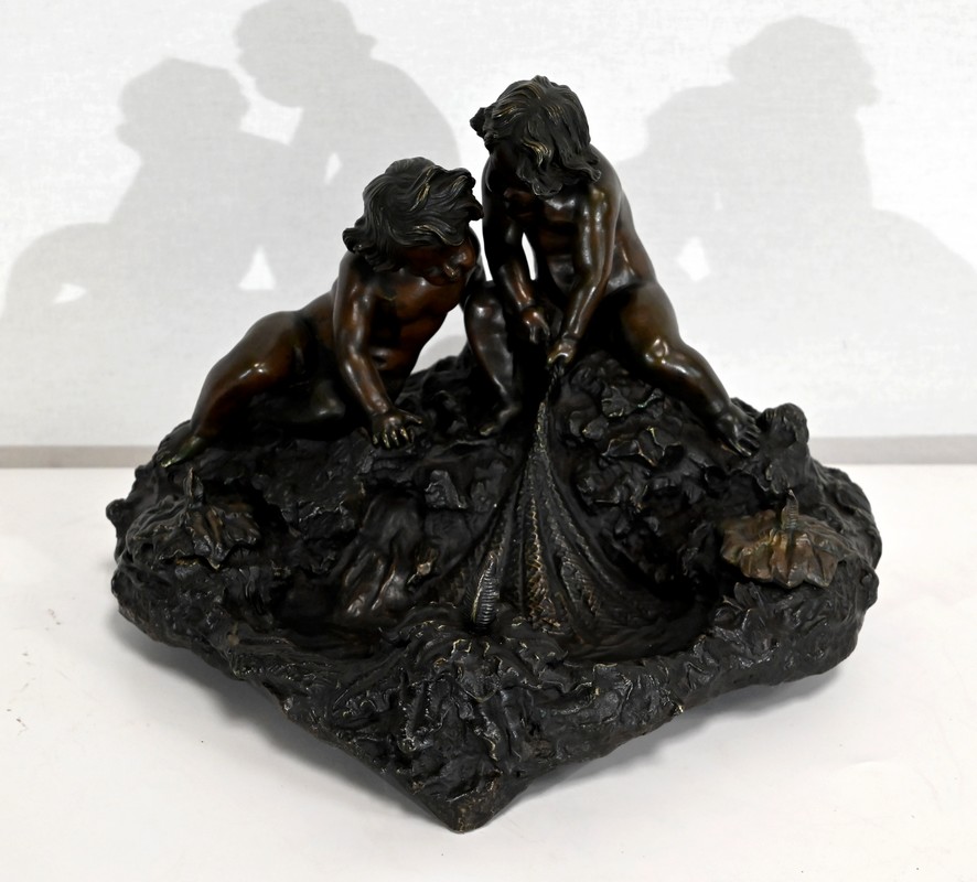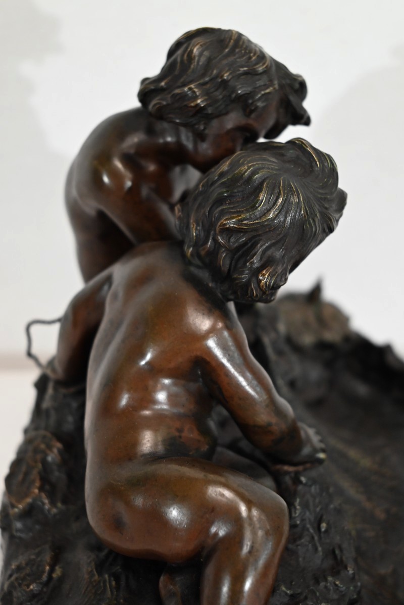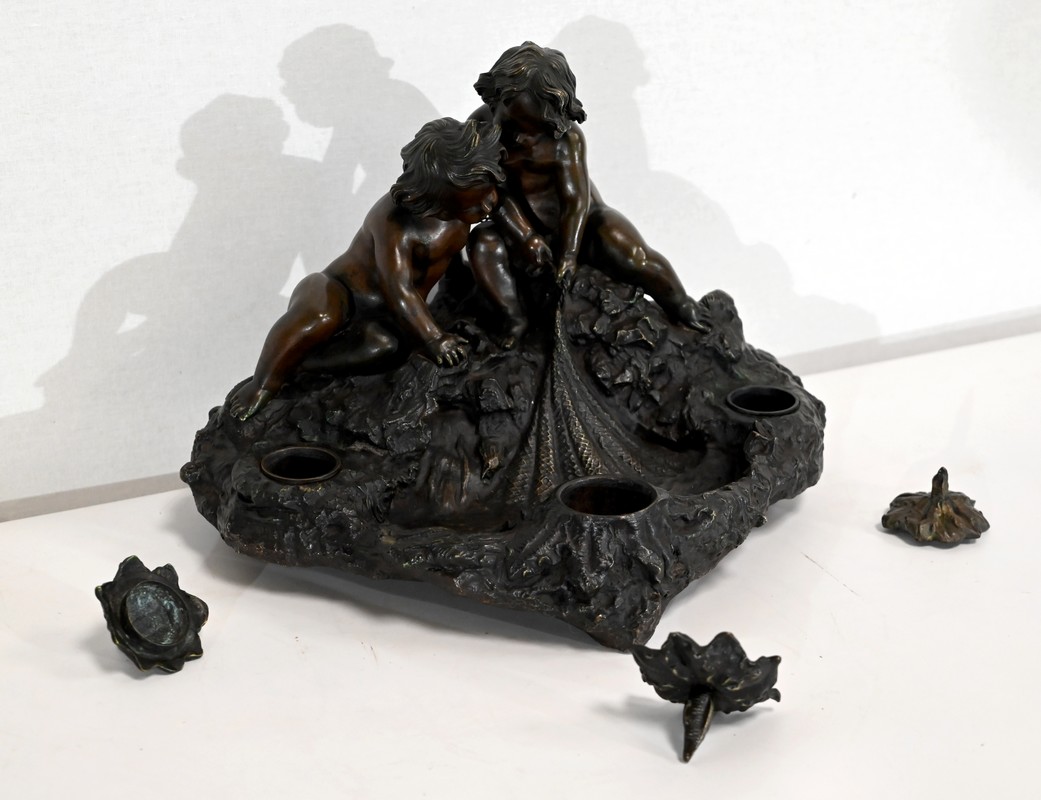 Encrier en Bronze à patine brune, représentant un groupe d’enfants à la chevelure soyeuse, nus, en position assise sur un rocher. L’un d’entre eux tire un filet de pêche au bord d’une rivière.