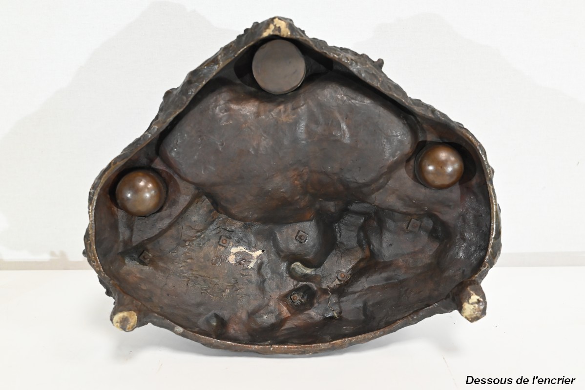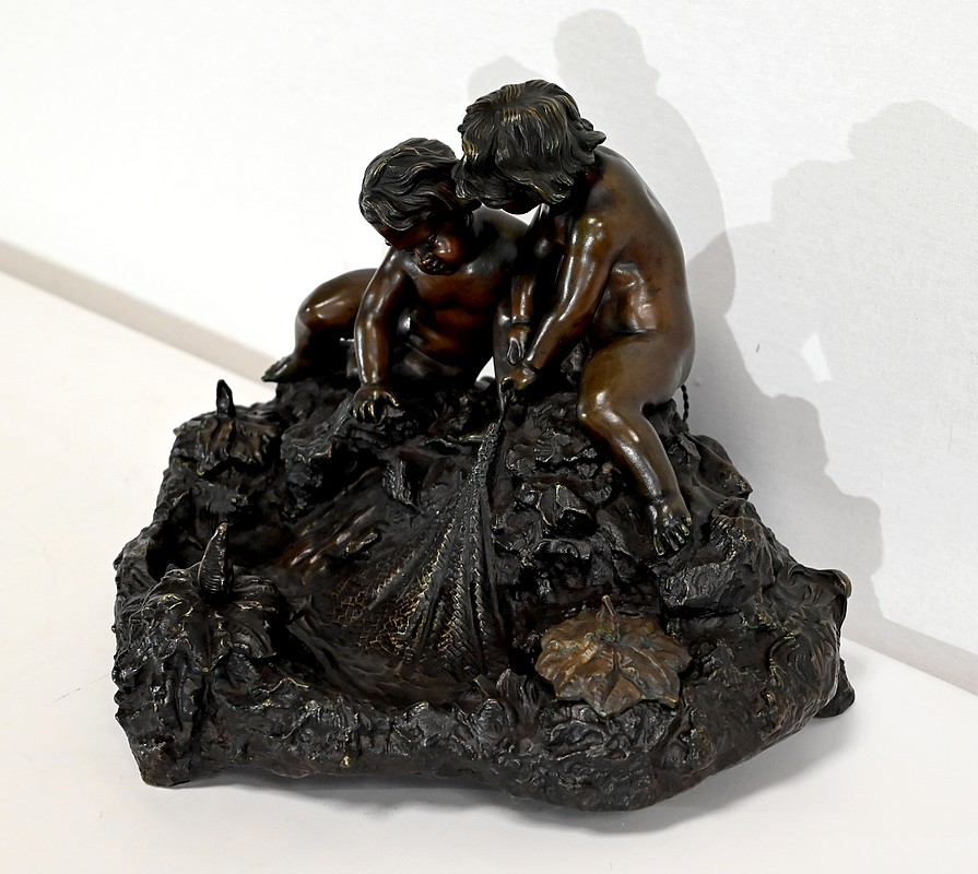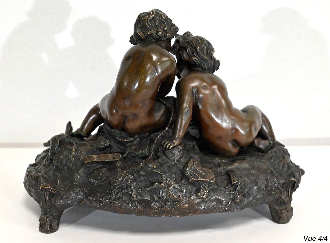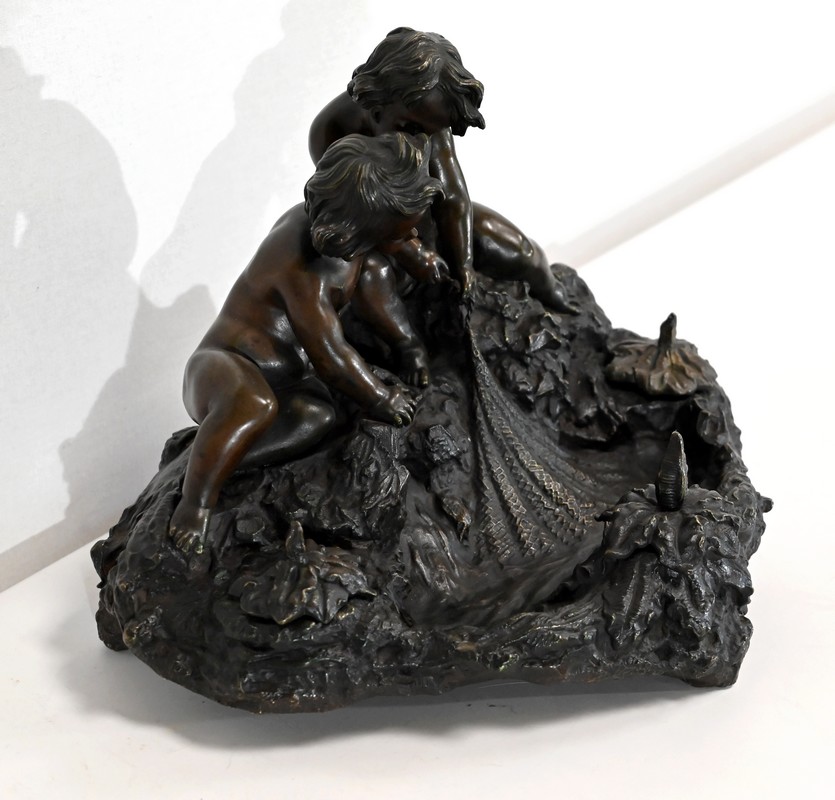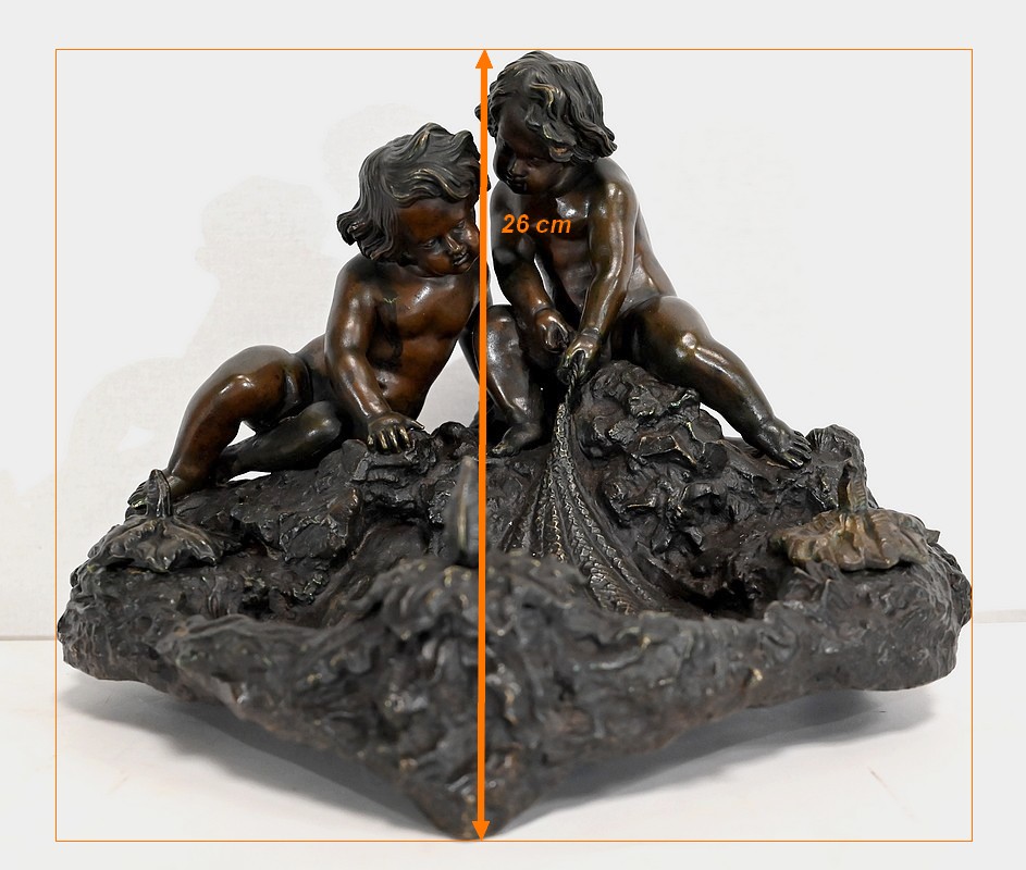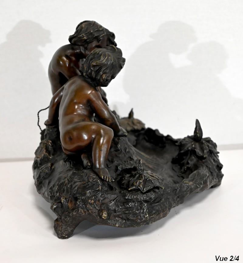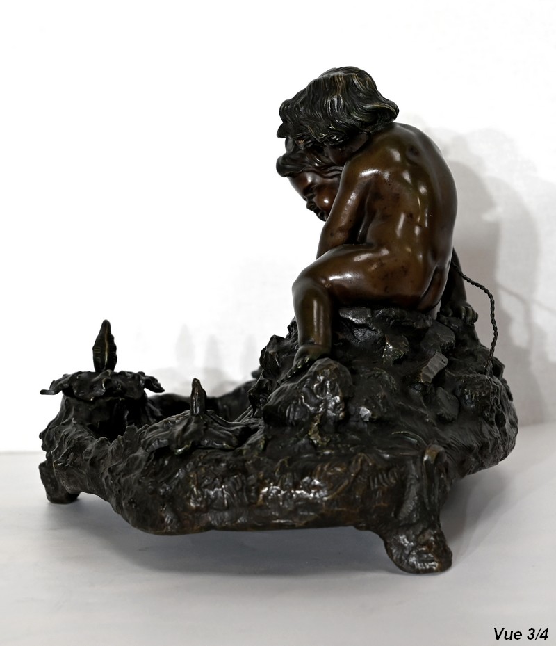 Encrier en Bronze à patine brune, représentant un groupe d’enfants à la chevelure soyeuse, nus, en position assise sur un rocher. L’un d’entre eux tire un filet de pêche au bord d’une rivière.