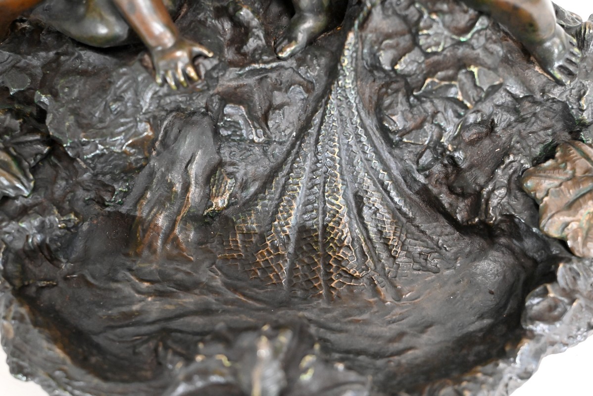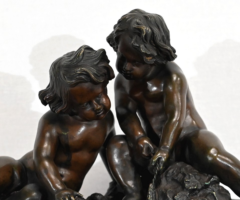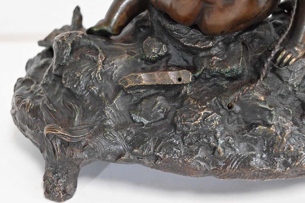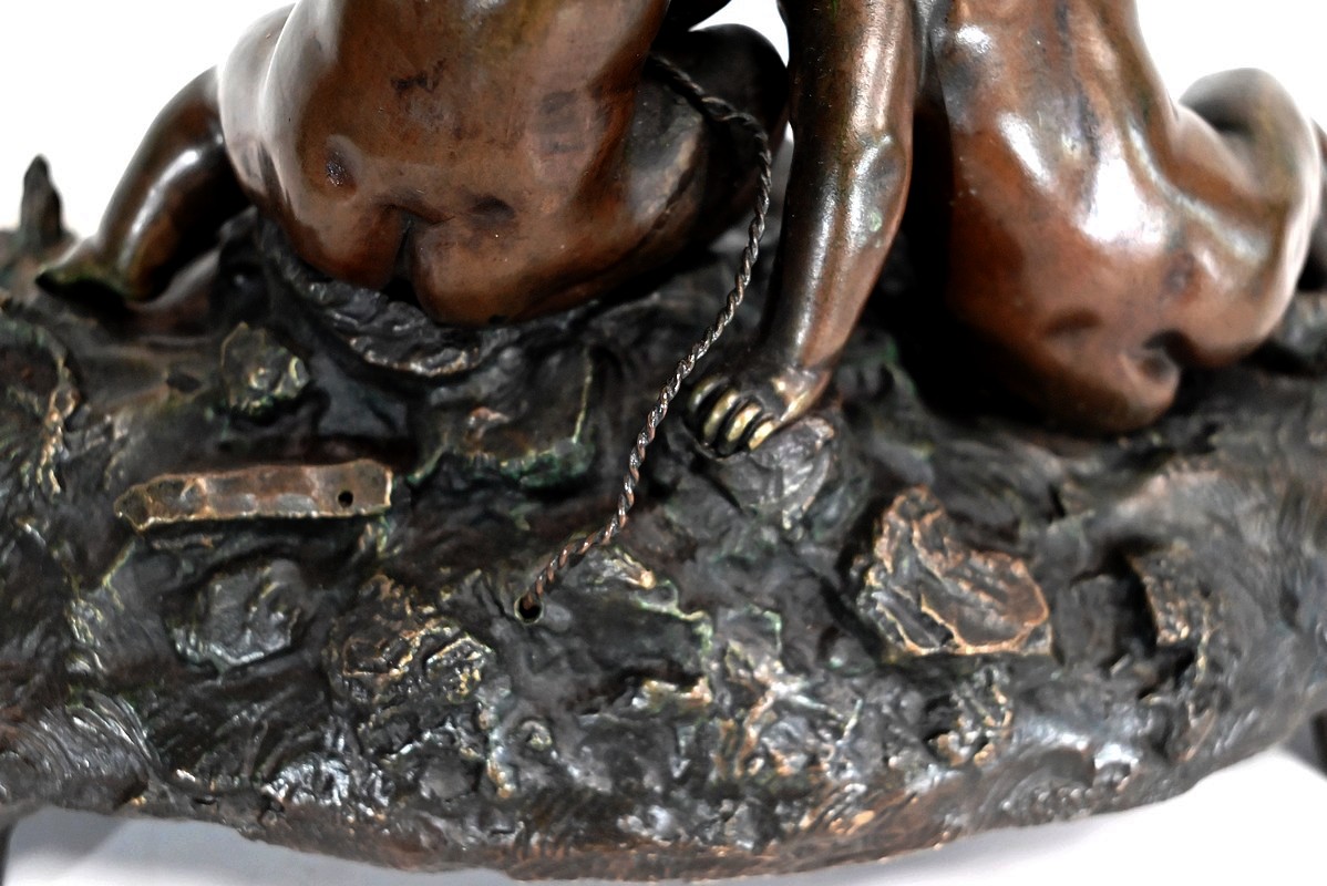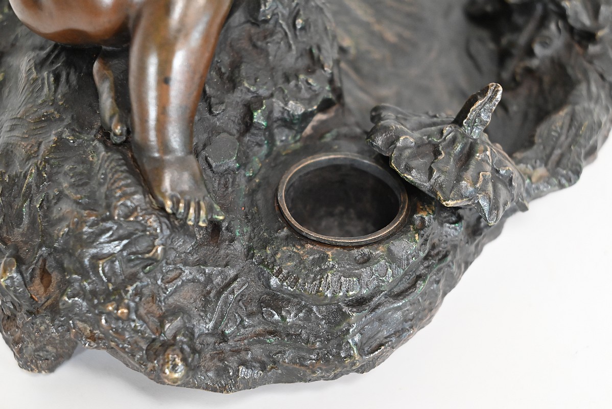 Encrier en Bronze à patine brune, représentant un groupe d’enfants à la chevelure soyeuse, nus, en position assise sur un rocher. L’un d’entre eux tire un filet de pêche au bord d’une rivière.