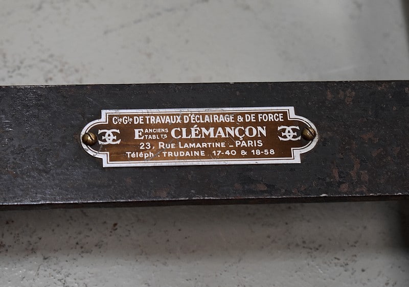 Son pied en croix, stable, est signé d’une plaque de la ‘Compagnie générale de Travaux d’éclairage et de Force, rue Lamartine, à Paris’.