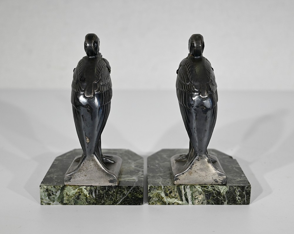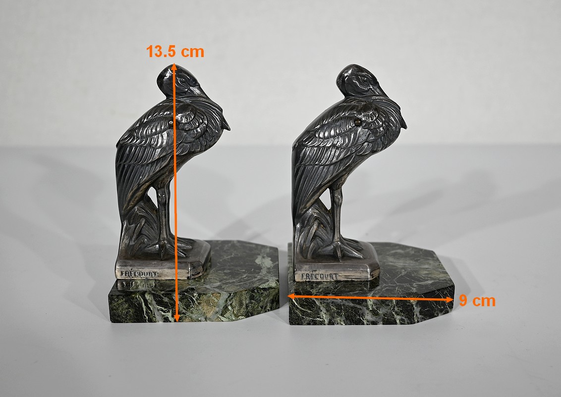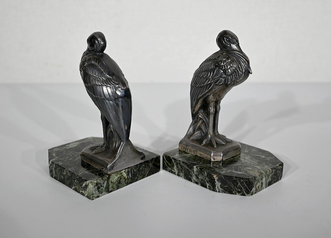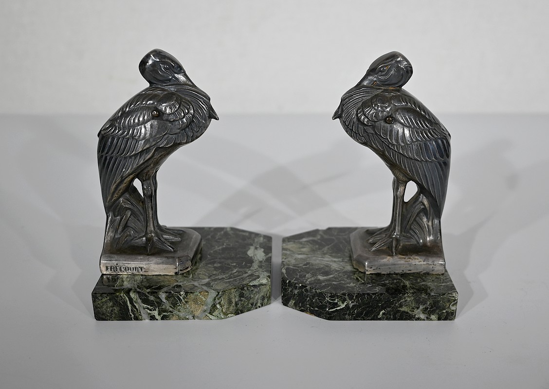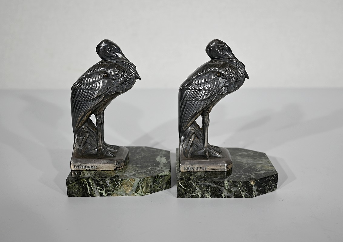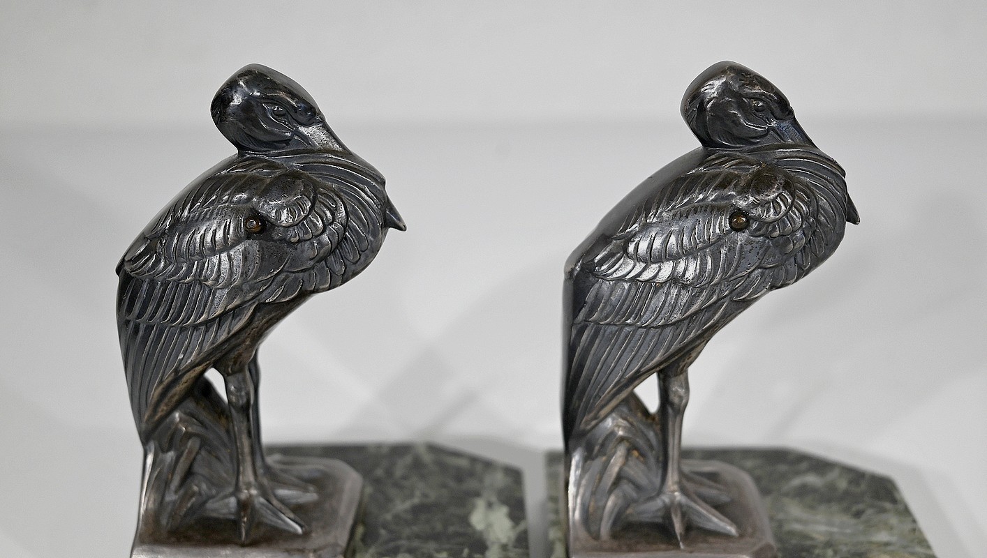 Ces hérons sont figurés droits, le bec rentré dans leurs plumes. Avec leur port altier et leur réalisation minutieusement ciselée, cette paire de serre-livres ravira les amoureux de ce style inimitable qu’est l’Art Déco.