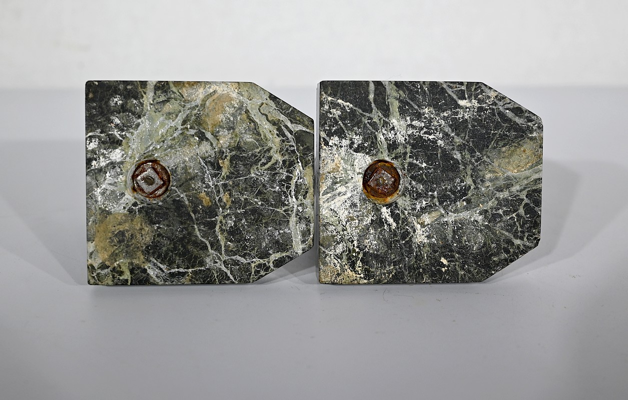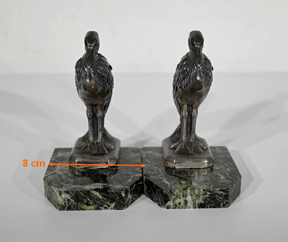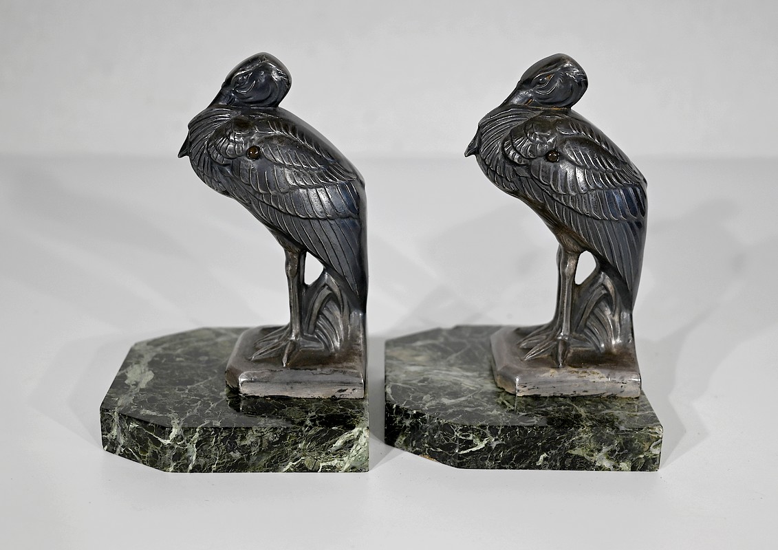 Serre-livres figurant des hérons, en métal patiné, sur un socle en marbre vert de mer.