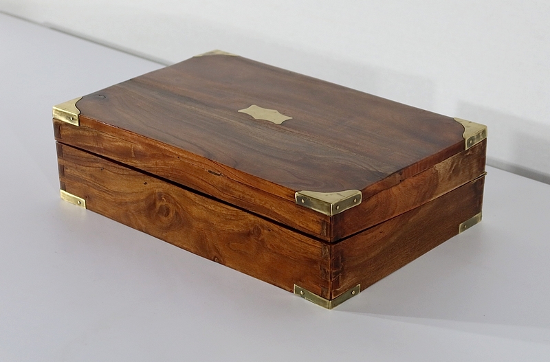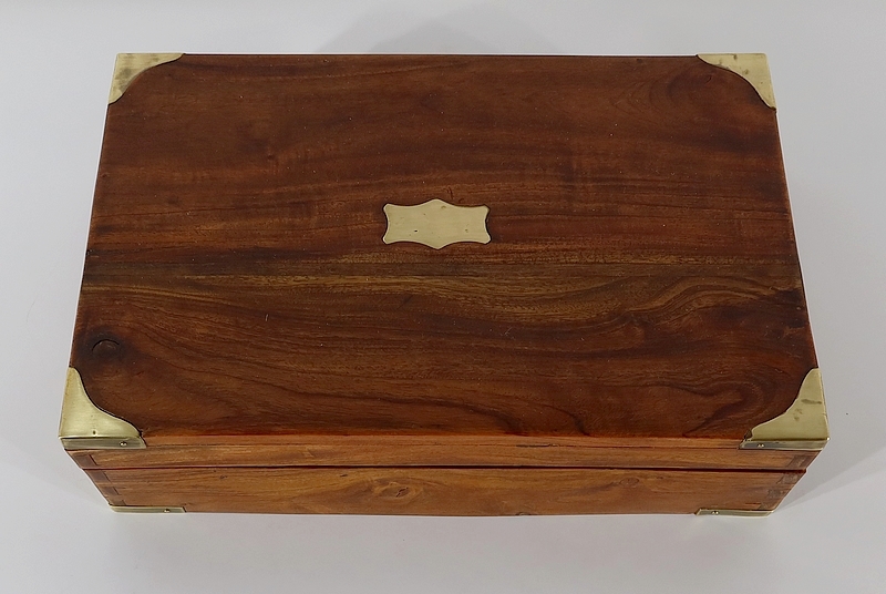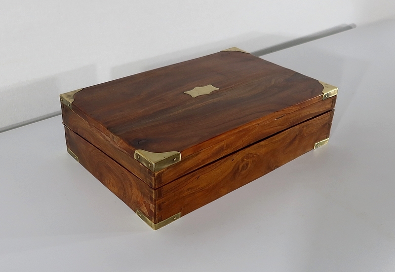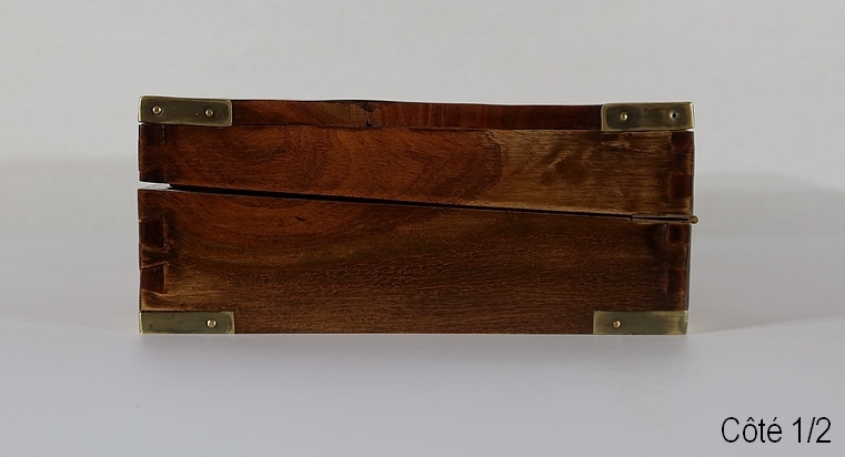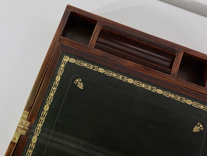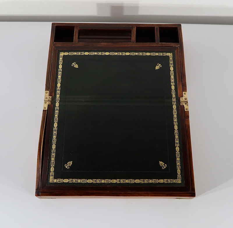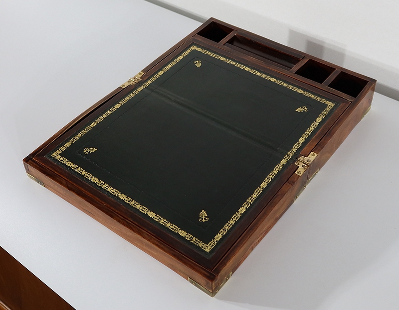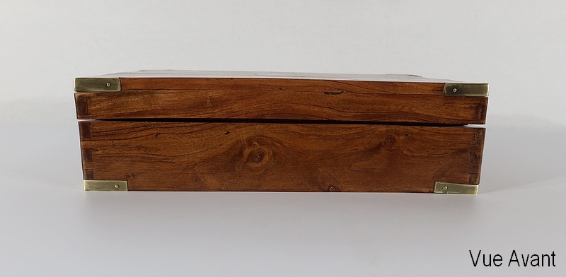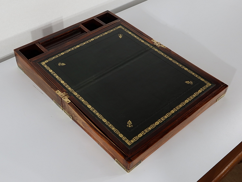 Écritoire de voyage composé d’un dessus avec angles et plaque centrale en laiton et possédant des angles assemblés en queue d’aronde.