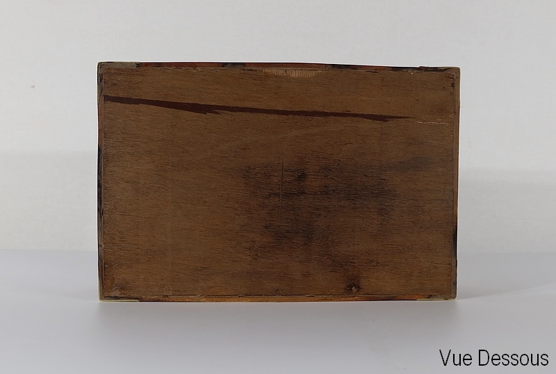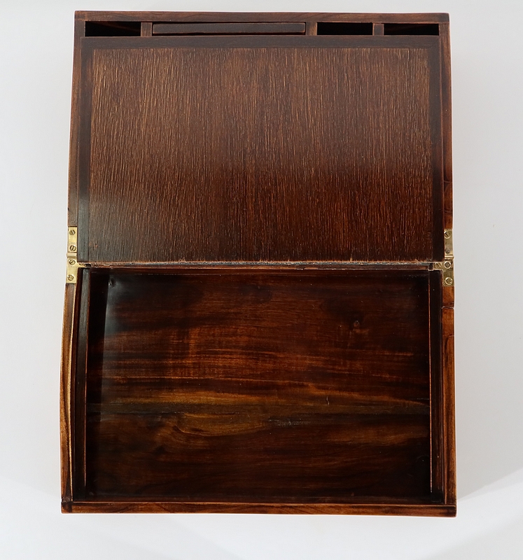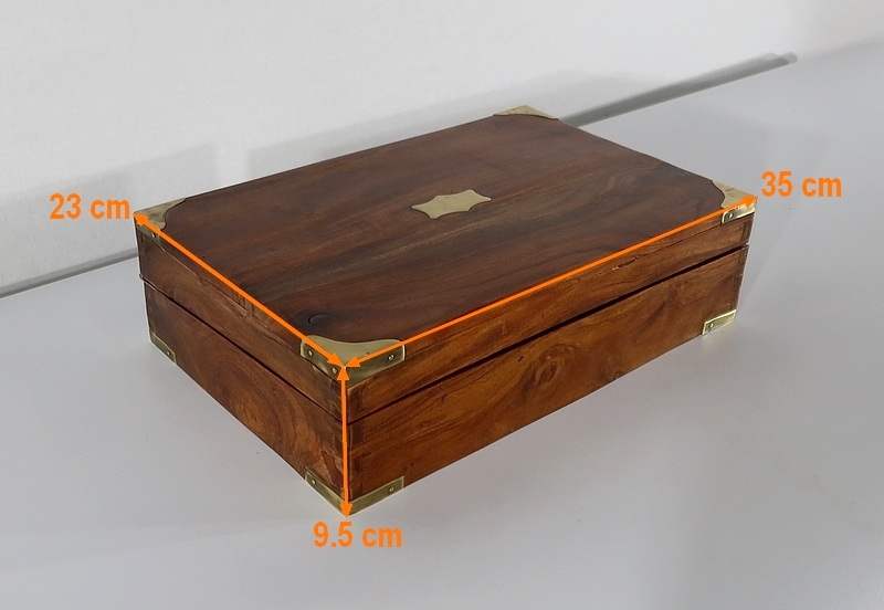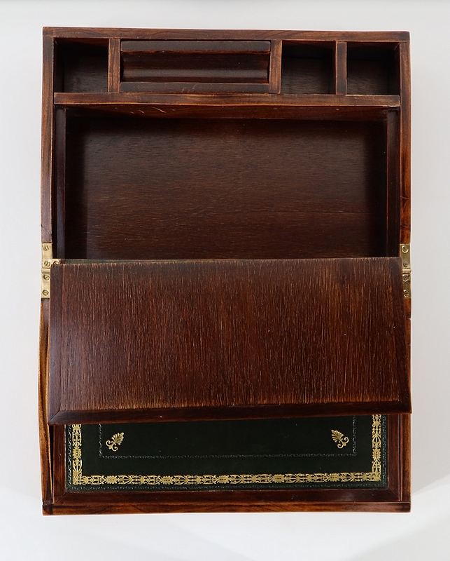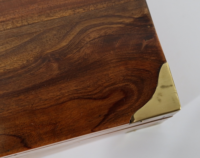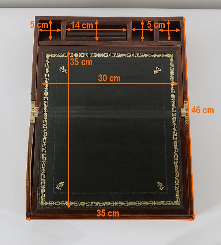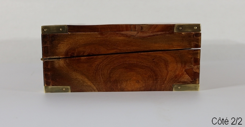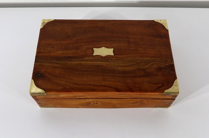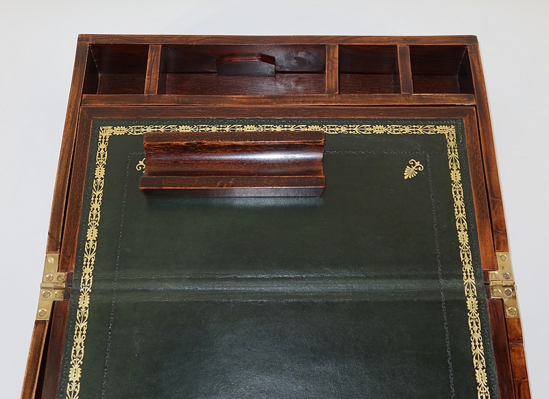 Écritoire de voyage composé d’un dessus avec angles et plaque centrale en laiton et possédant des angles assemblés en queue d’aronde.