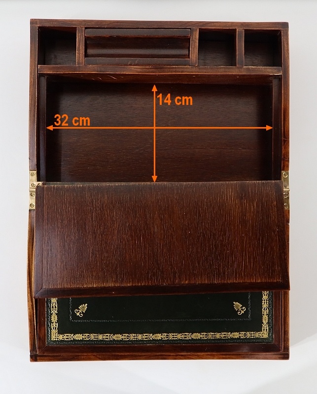 Une fois ouvert nous découvrons un pan légèrement incliné agrémenté d’un cuir vert soutenu avec vignette à froid, vignette dorée et motifs aux angles. Dans la partie supérieure, nous trouvons trois casiers et un porte crayon amovible découvrant une cavité.