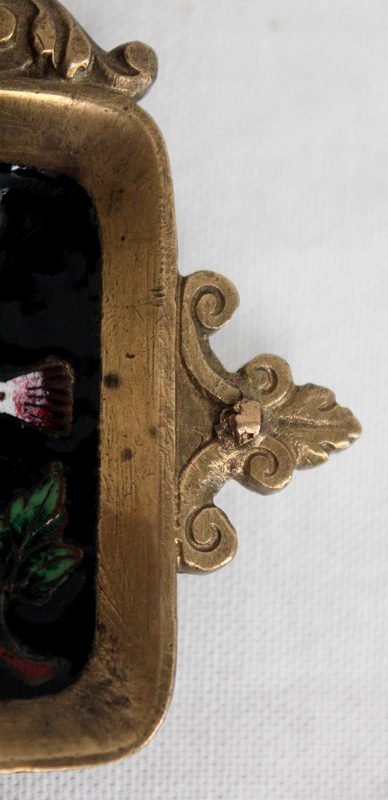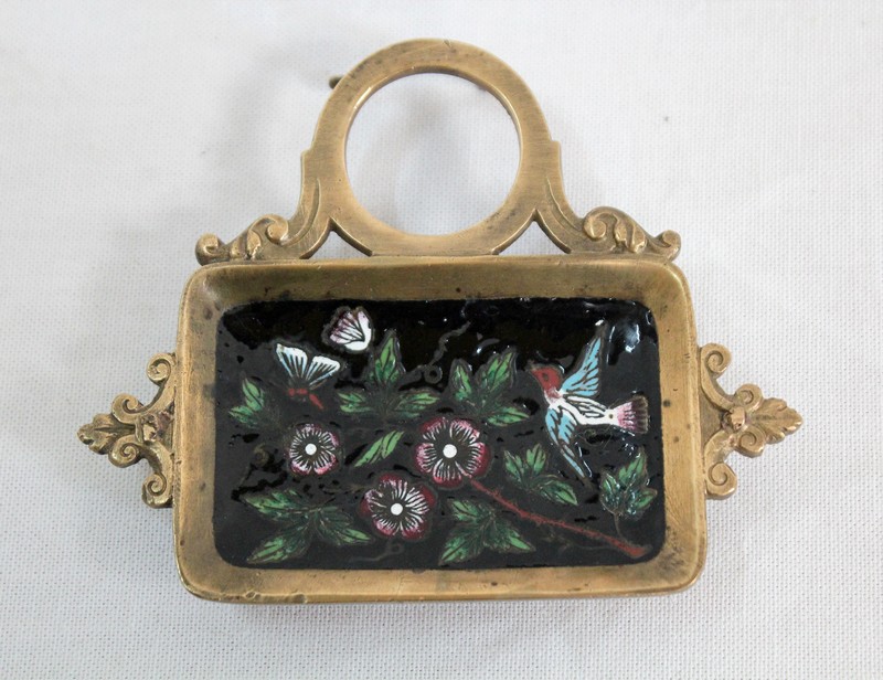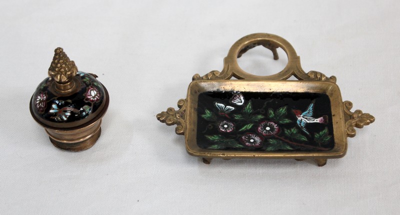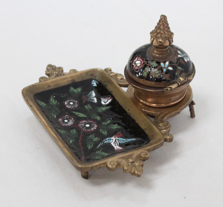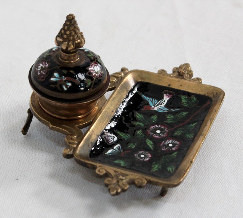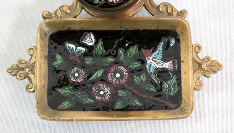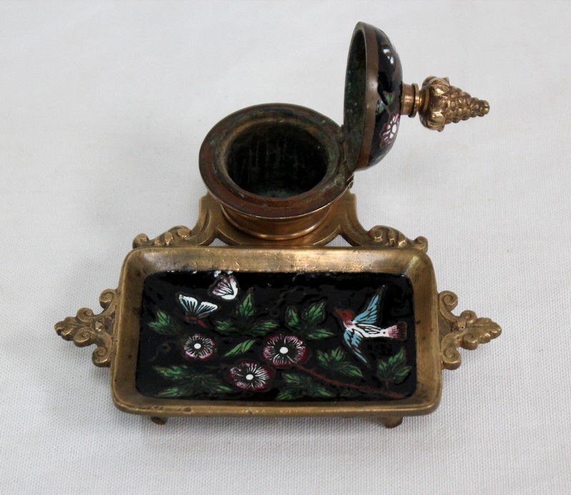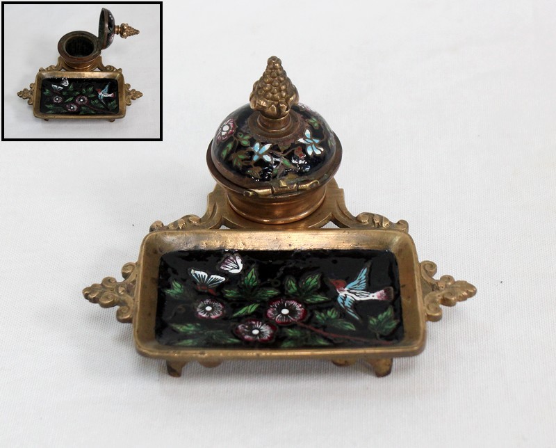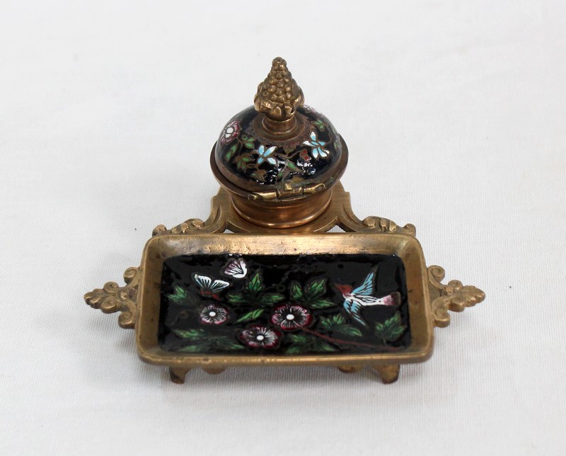 Cet accessoire est enjolivé par des motifs en émaux sur fond noir, représentant des illustrations colorées sur le thème de la nature : des fleurs et des feuillages s’entrelacent sur le couvercle du réceptacle, tandis que des papillons et un oiseau folâtrent dans les branchages fleuris figurant sur le porte-plume.