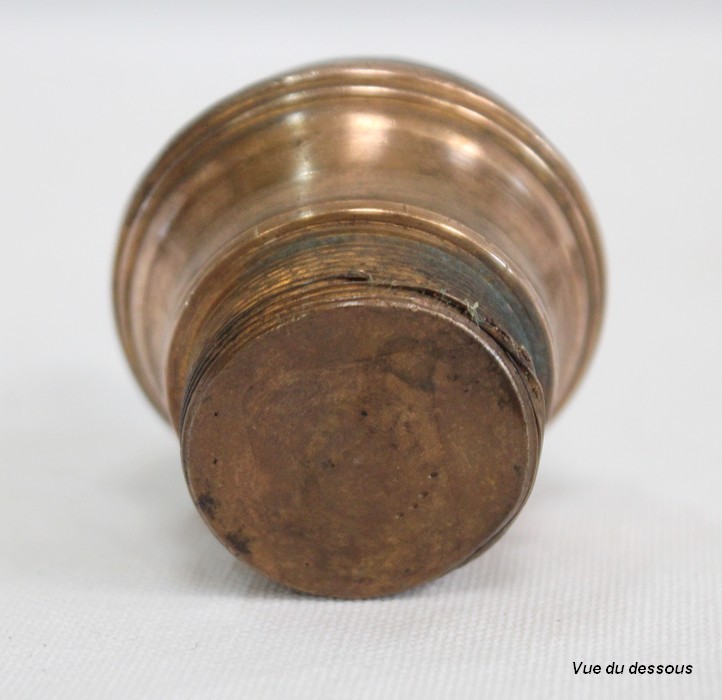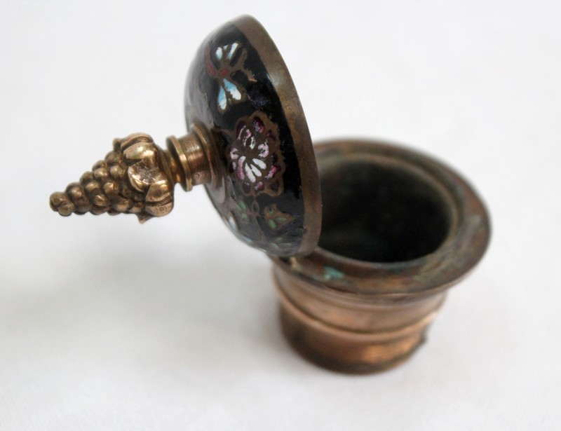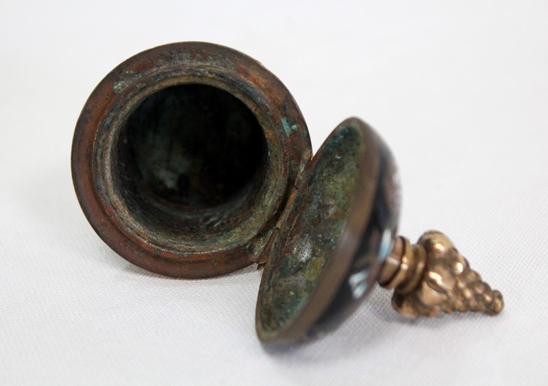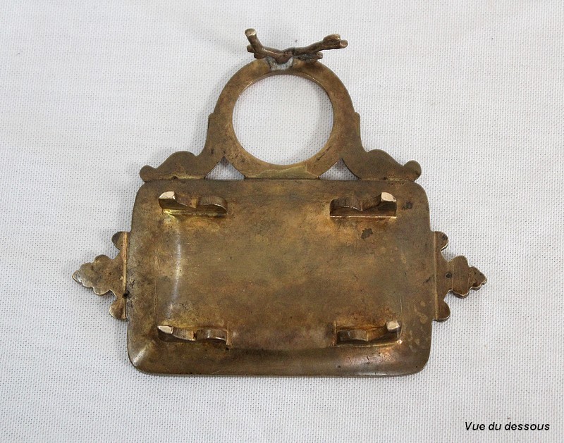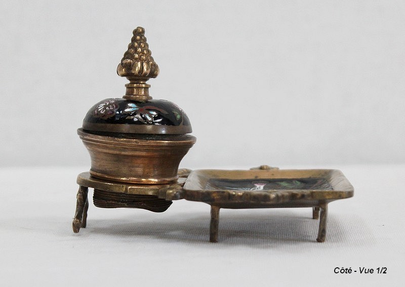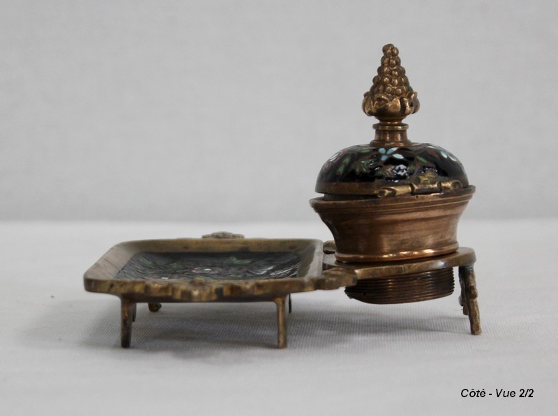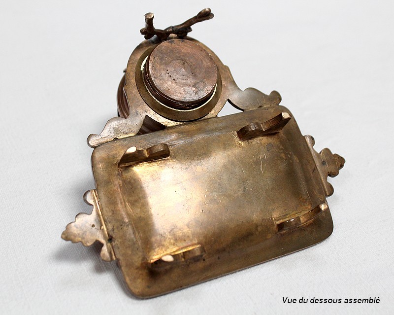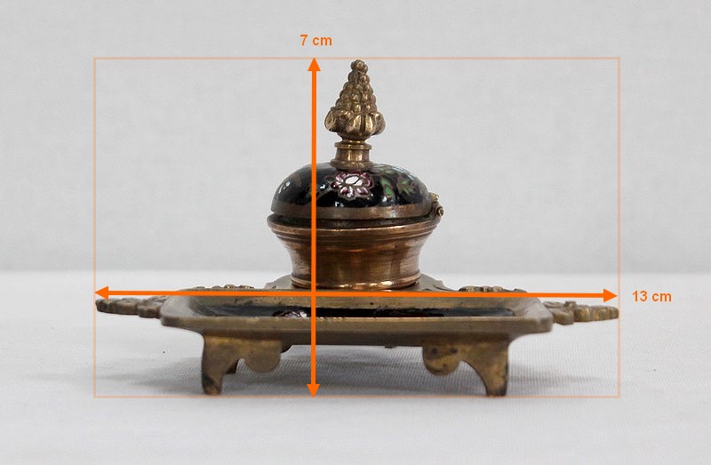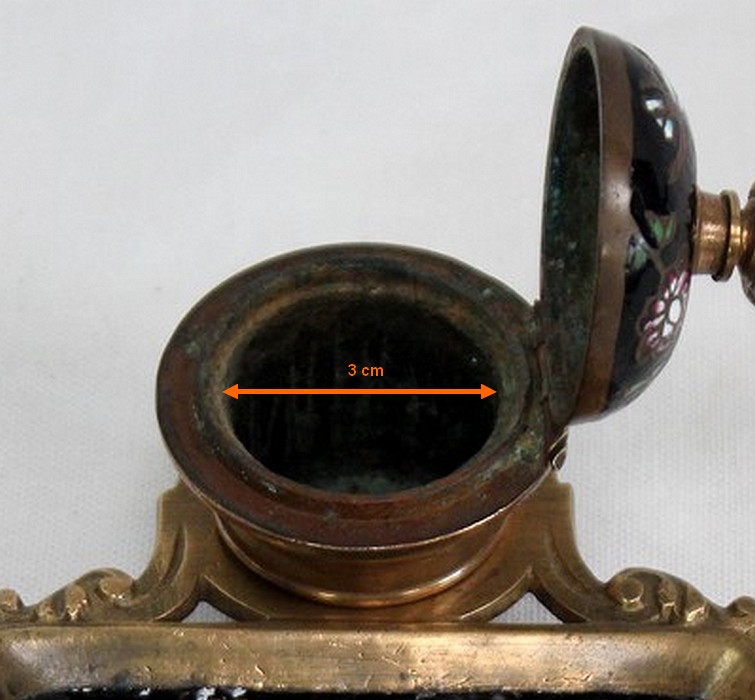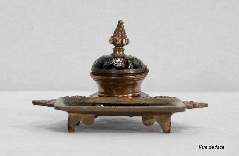 Le réceptacle, destiné à l’origine pour l’encre, dispose d’un couvercle muni d’un bouton de tirage en forme de pomme de pin. Dissociable à souhait, il est vissé sur une base ronde évidée sommant le repose-plume, lui-même de forme rectangulaire et ornementé de volutes sur ses côtés. Sa partie centrale, légèrement enfoncée, permettait de récolter les résidus d’encre s’échappant de l’outil de calligraphie.