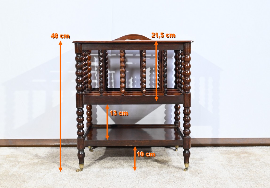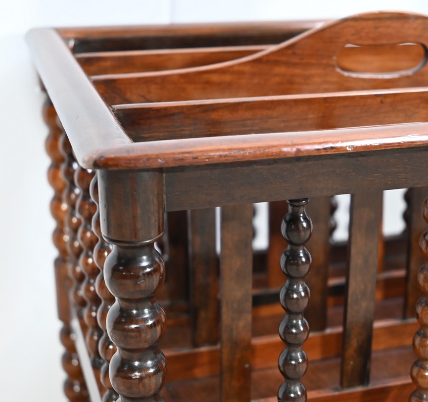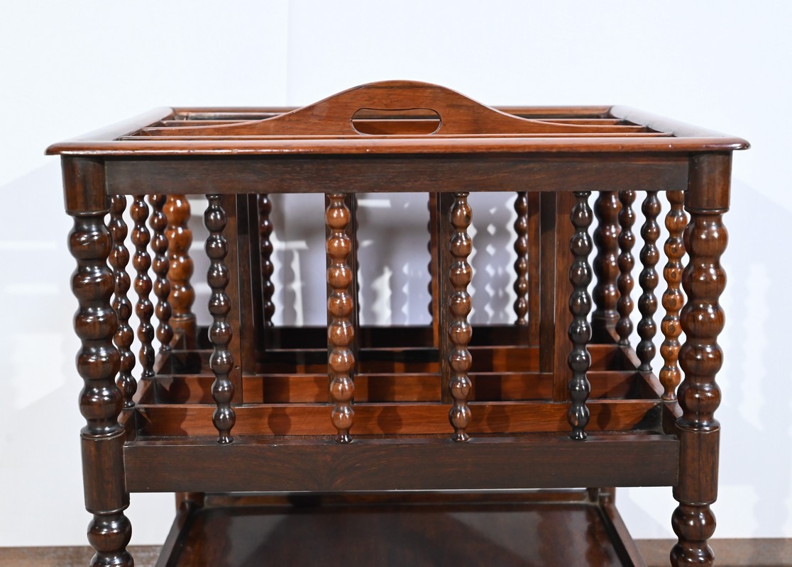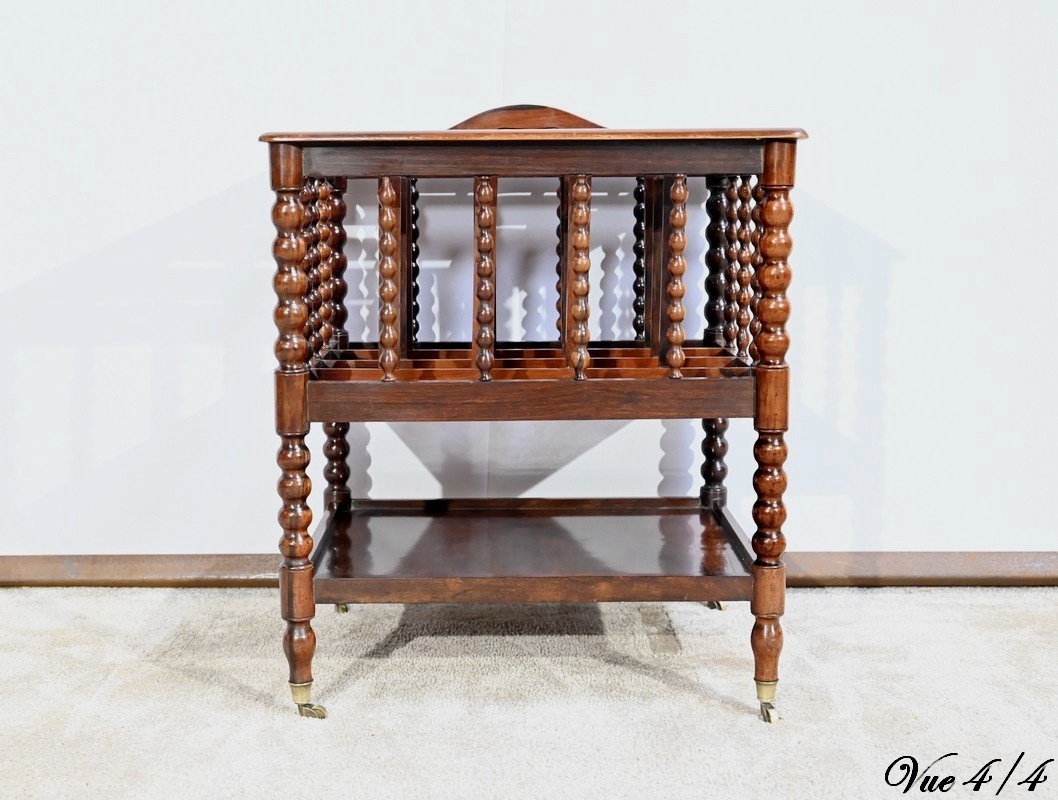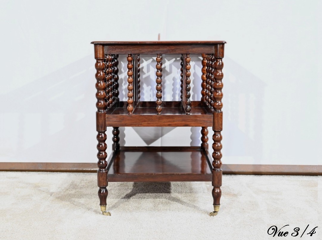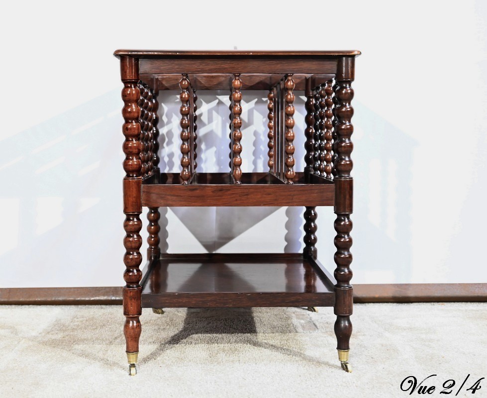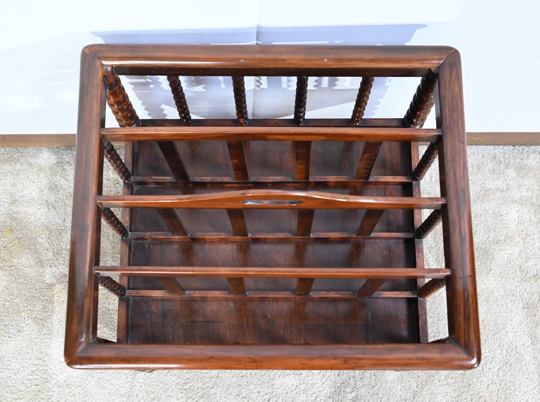 Ce porte-revues en palissandre de Rio présente en partie haute quatre compartiments identiques à barreaux sommées d’une poignée. L’encadrement est légèrement arrondi et à coupe d’onglet.