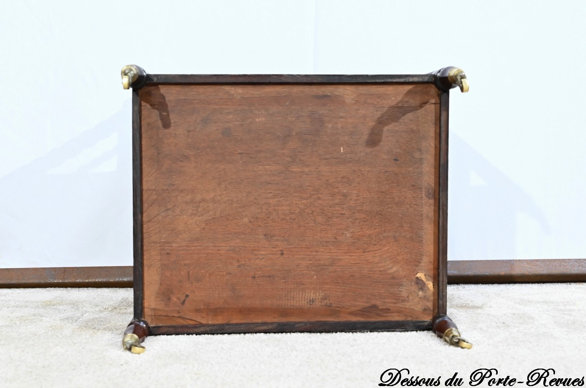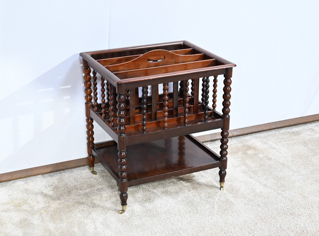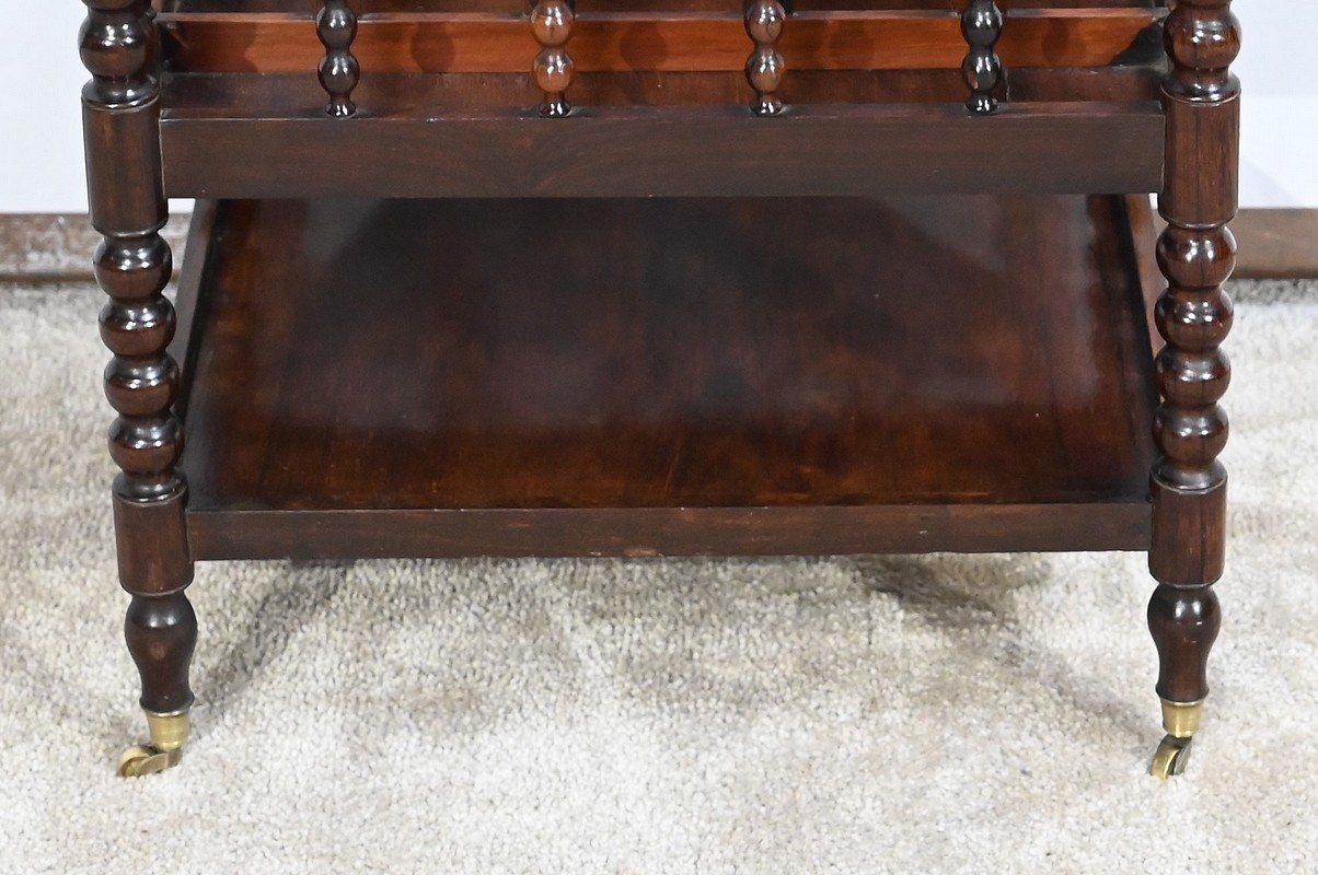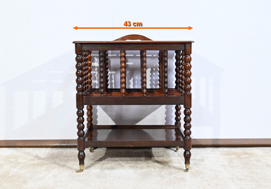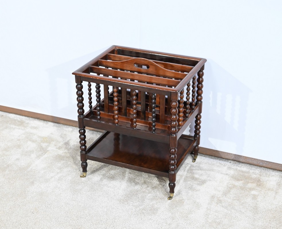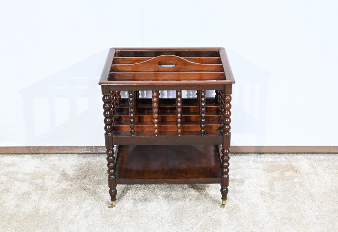 Ce porte-revues en palissandre de Rio présente en partie haute quatre compartiments identiques à barreaux sommées d’une poignée. L’encadrement est légèrement arrondi et à coupe d’onglet.