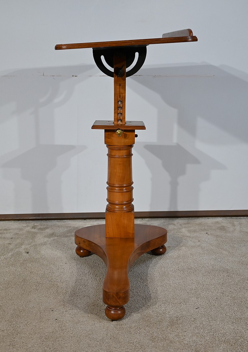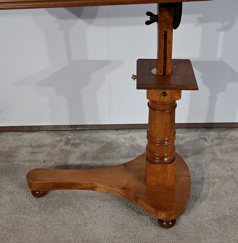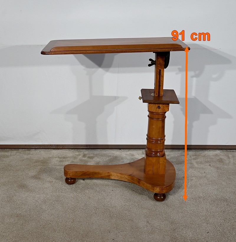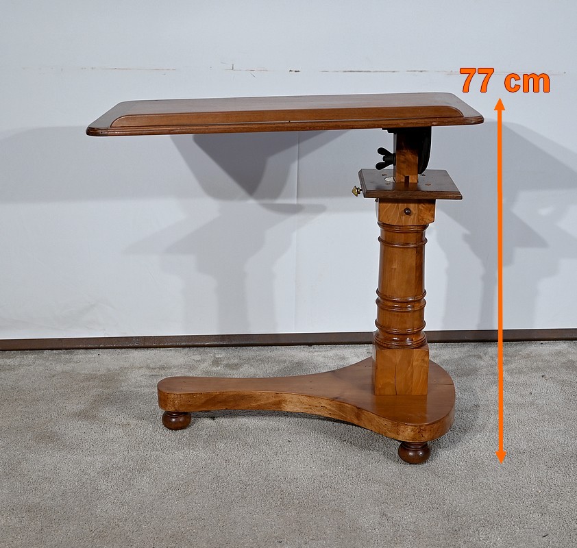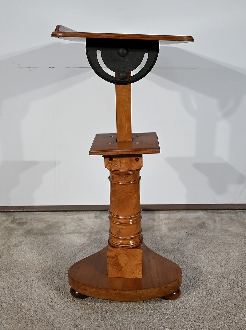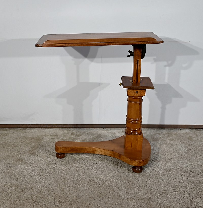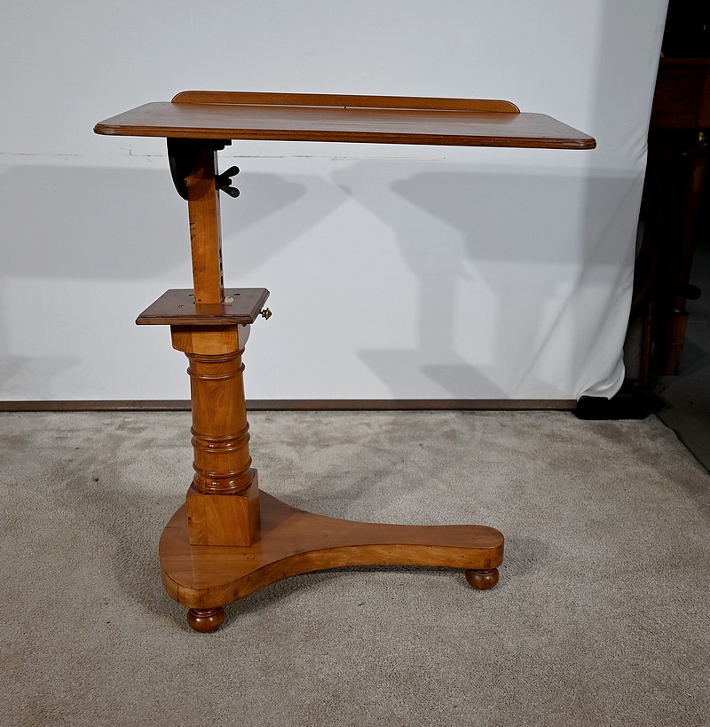 Belle table de lecture polyvalente, possédant un dessus en acajou blond d’une seule planche, accompagnée d’embouts pour éviter sa déformation. Un élément de retenue en bois, amovible, peut se retirer et se positionner à l’inverse du plateau. En dessous, un élément en fer dont la partie latérale est ajourée permet l’inclinaison du dessus avec une vis papillon pour la bloquer dans la position voulue. Cette table est également réglable en hauteur par un élément de bois cranté permettant de positionner le plateau à la hauteur souhaitée. Un élément carré cranté coulisse dans un fût tourné, à collerettes, dont la base est également carrée. Cette dernière repose sur une base rappelant la forme d’un luth. Cette dernière repose sur trois pieds tournés avec roulettes intérieures encastrées permettant un déplacement facile du meuble. La partie basse (colonne et socle) est en merisier blond et le plateau est en acajou blond. Les essences de bois présentent la même teinte.