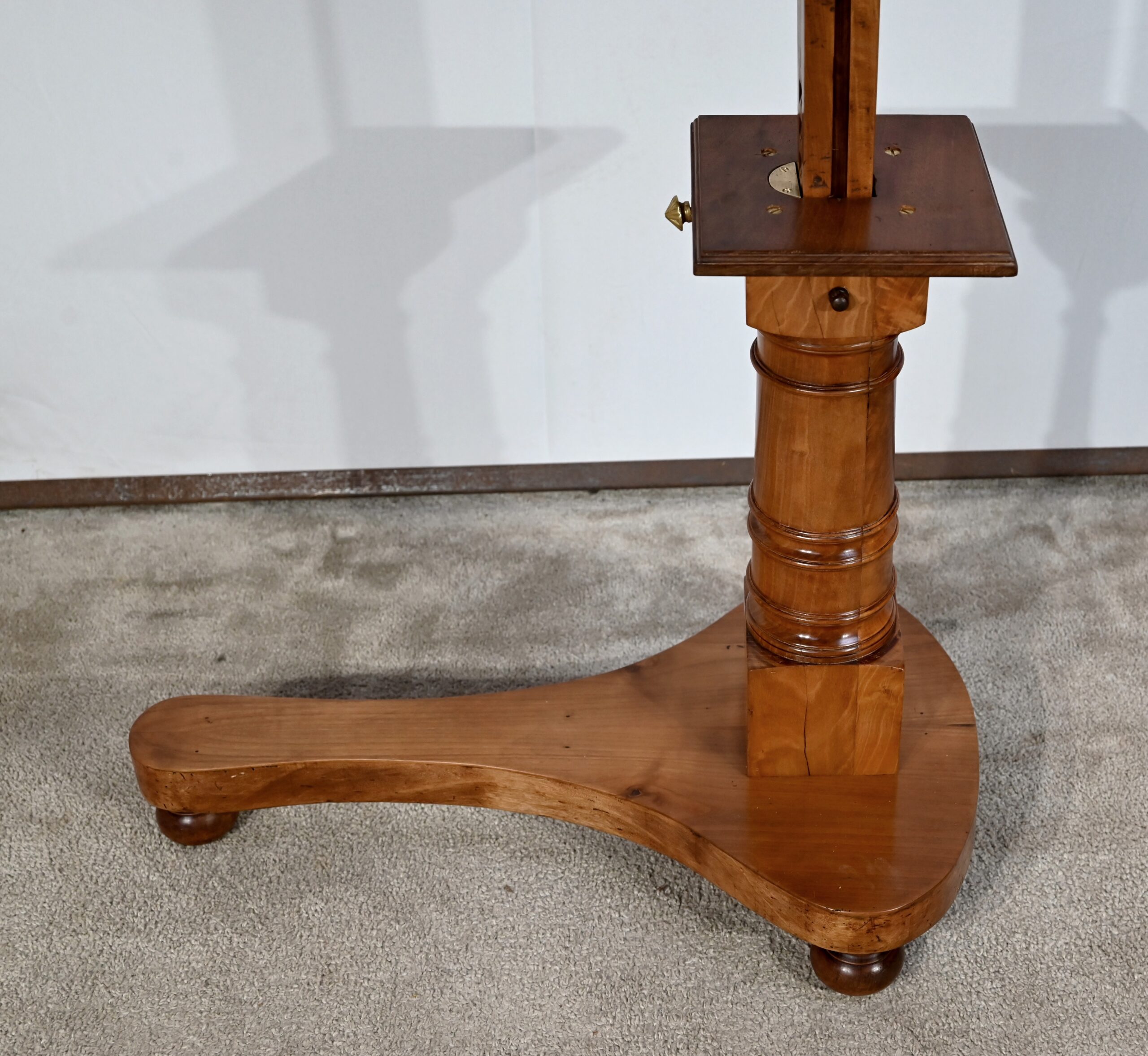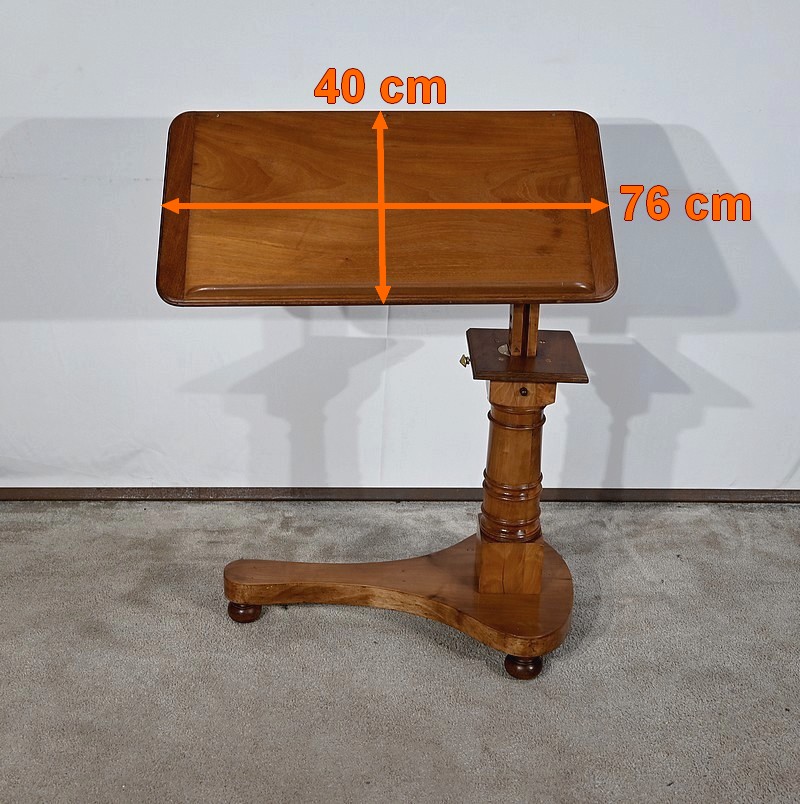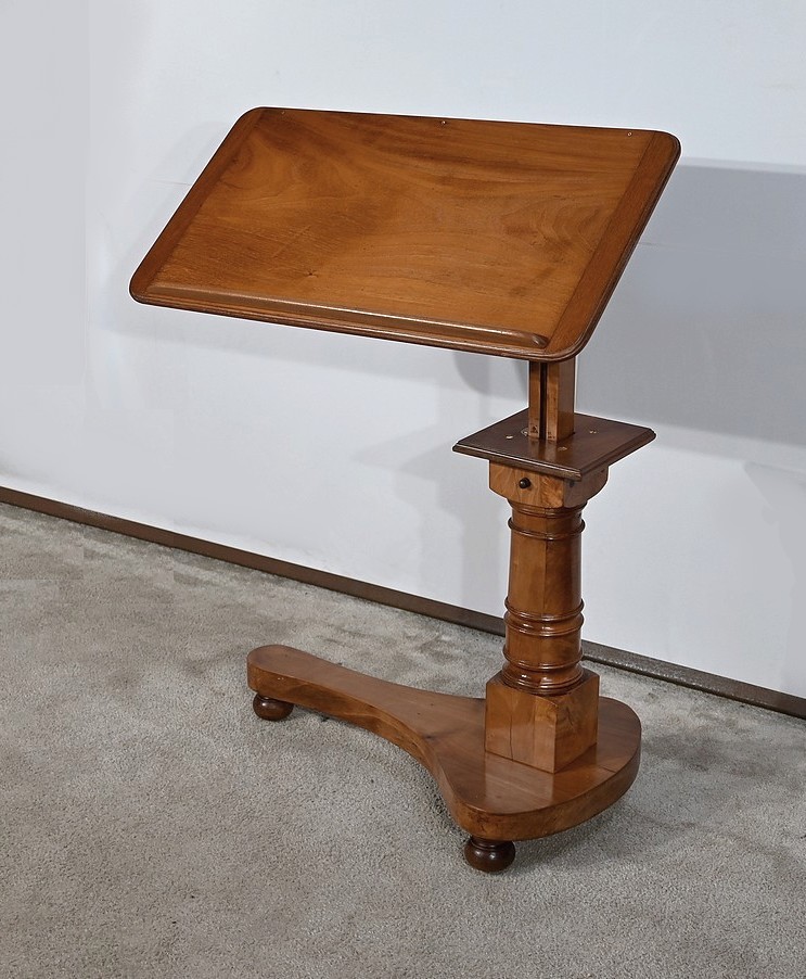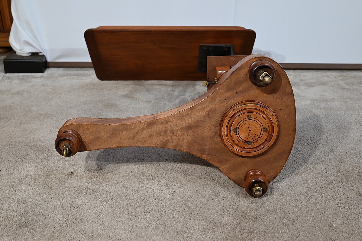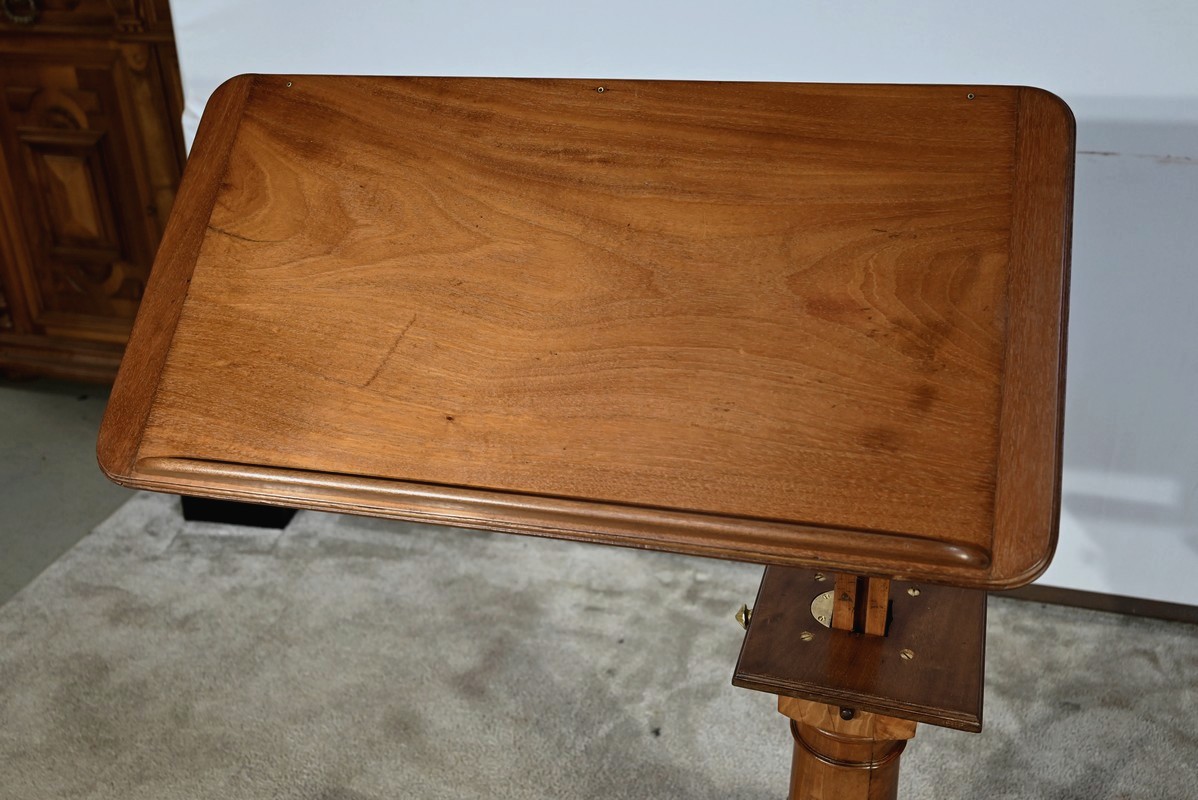 Belle table de lecture polyvalente, possédant un dessus en acajou blond d’une seule planche, accompagnée d’embouts pour éviter sa déformation. Un élément de retenue en bois, amovible, peut se retirer et se positionner à l’inverse du plateau. En dessous, un élément en fer dont la partie latérale est ajourée permet l’inclinaison du dessus avec une vis papillon pour la bloquer dans la position voulue. Cette table est également réglable en hauteur par un élément de bois cranté permettant de positionner le plateau à la hauteur souhaitée. Un élément carré cranté coulisse dans un fût tourné, à collerettes, dont la base est également carrée. Cette dernière repose sur une base rappelant la forme d’un luth. Cette dernière repose sur trois pieds tournés avec roulettes intérieures encastrées permettant un déplacement facile du meuble. La partie basse (colonne et socle) est en merisier blond et le plateau est en acajou blond. Les essences de bois présentent la même teinte.