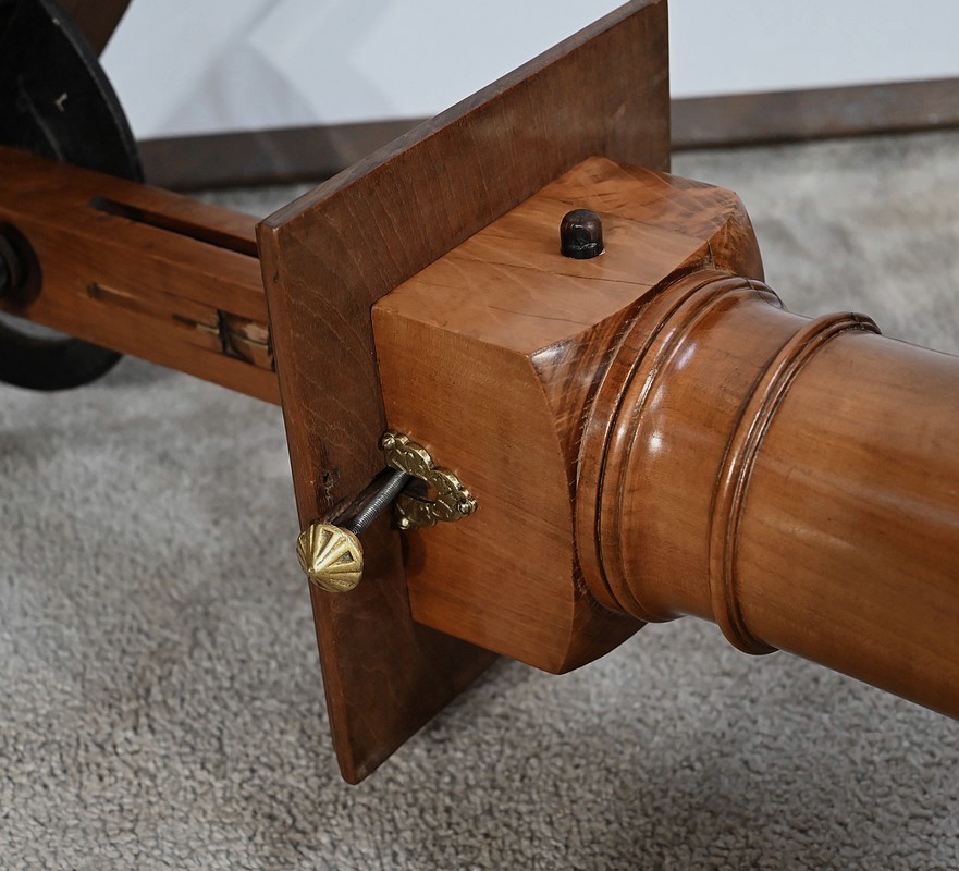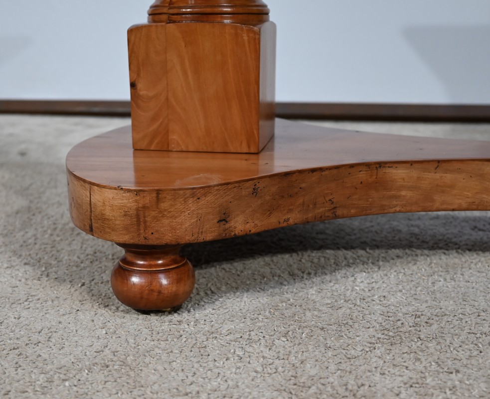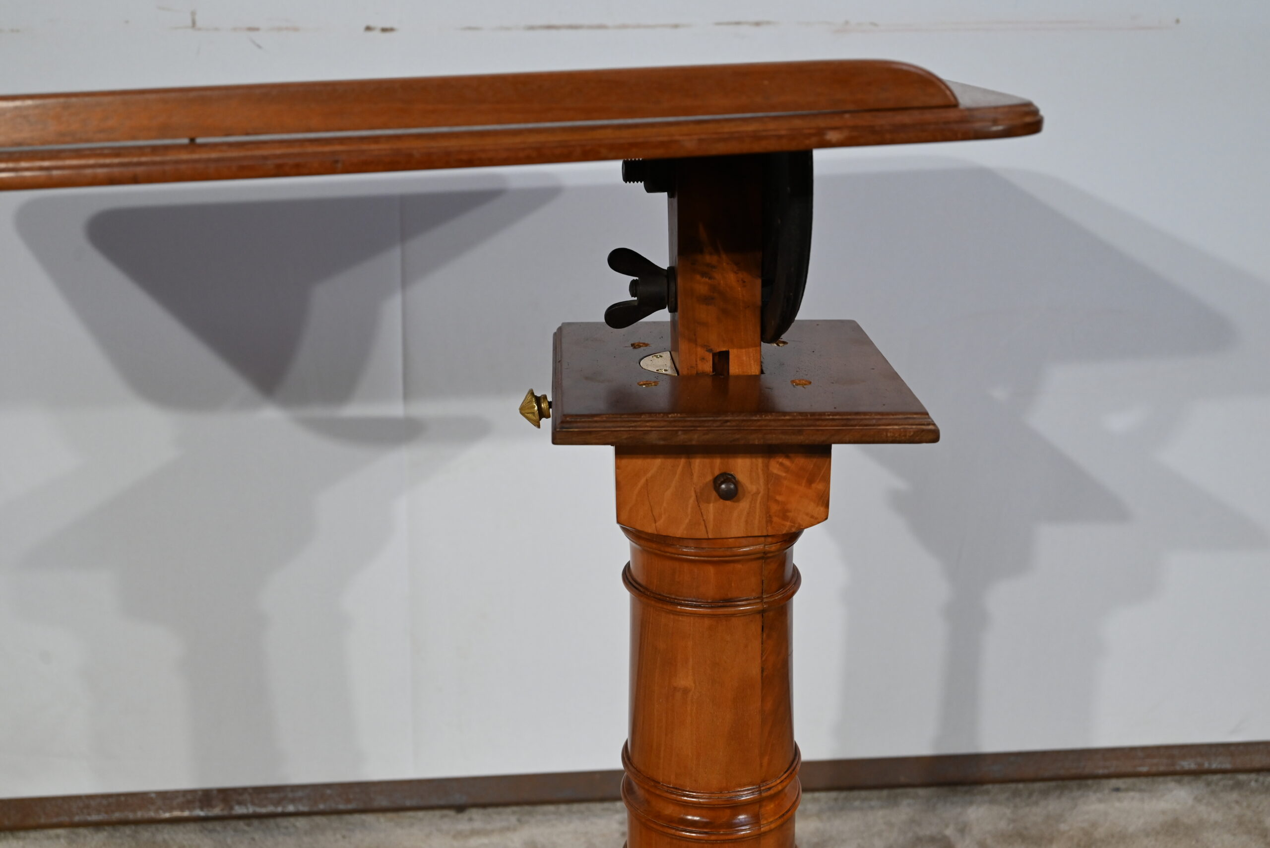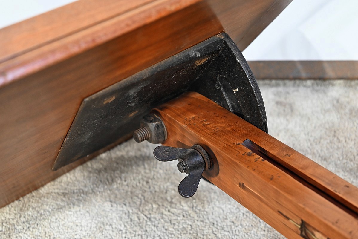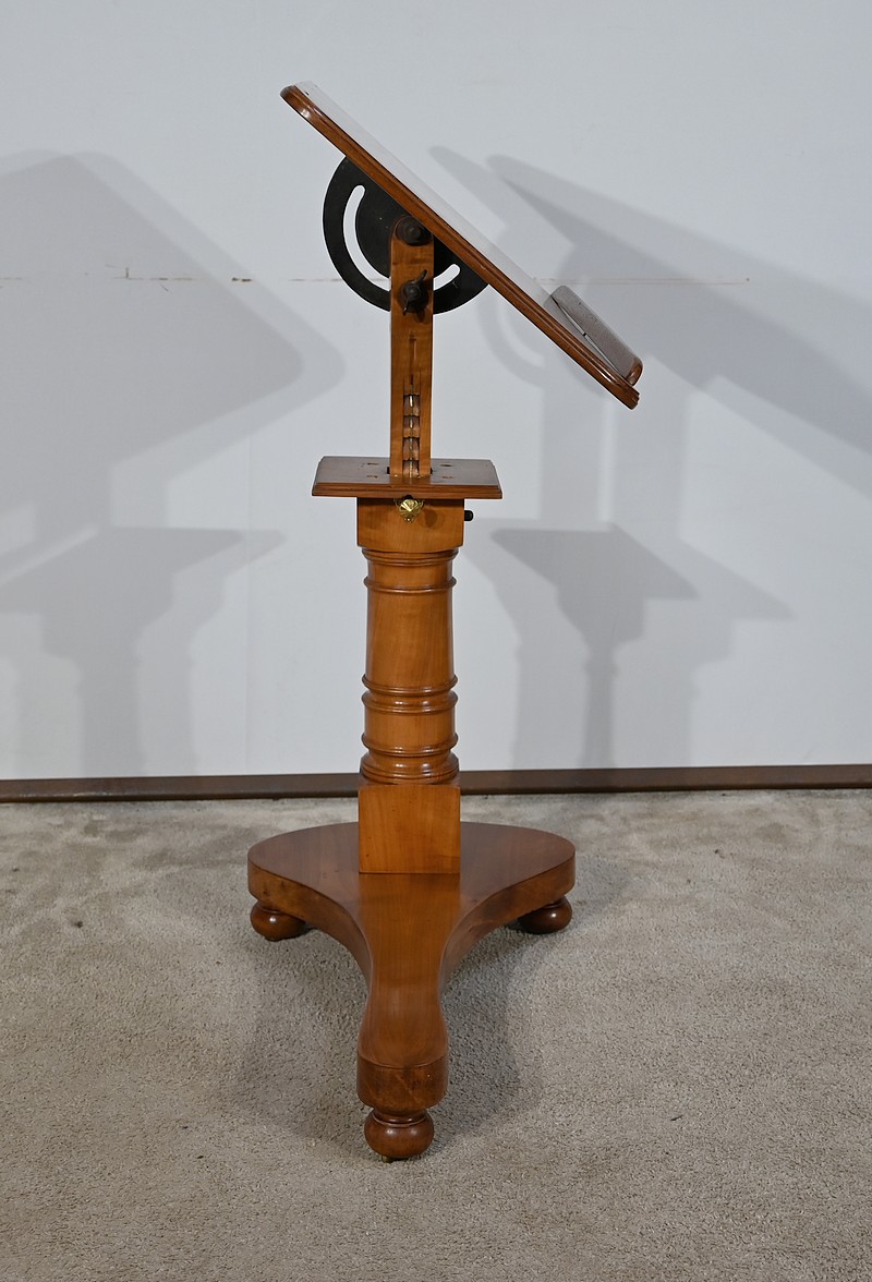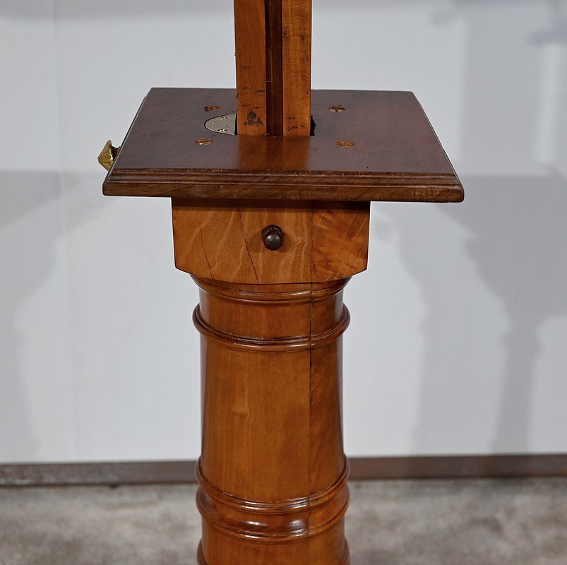 Belle table de lecture polyvalente, possédant un dessus en acajou blond d’une seule planche, accompagnée d’embouts pour éviter sa déformation. Un élément de retenue en bois, amovible, peut se retirer et se positionner à l’inverse du plateau. En dessous, un élément en fer dont la partie latérale est ajourée permet l’inclinaison du dessus avec une vis papillon pour la bloquer dans la position voulue. Cette table est également réglable en hauteur par un élément de bois cranté permettant de positionner le plateau à la hauteur souhaitée. Un élément carré cranté coulisse dans un fût tourné, à collerettes, dont la base est également carrée. Cette dernière repose sur une base rappelant la forme d’un luth. Cette dernière repose sur trois pieds tournés avec roulettes intérieures encastrées permettant un déplacement facile du meuble. La partie basse (colonne et socle) est en merisier blond et le plateau est en acajou blond. Les essences de bois présentent la même teinte.