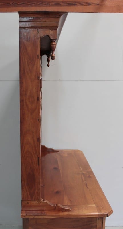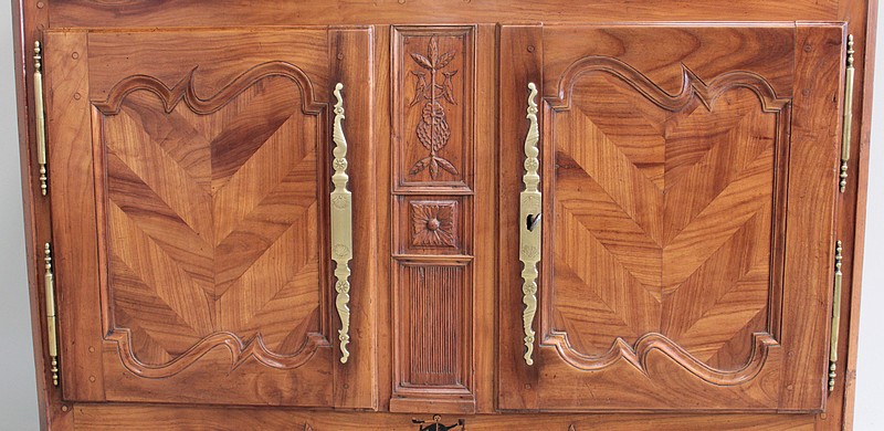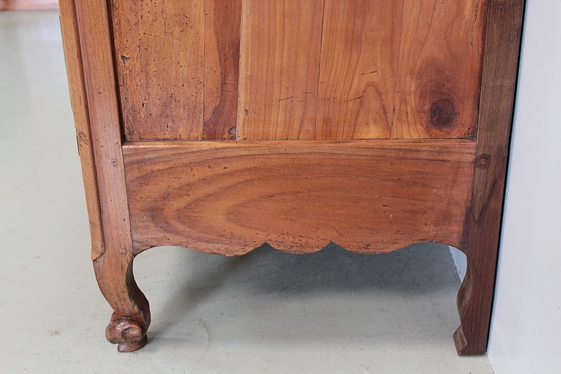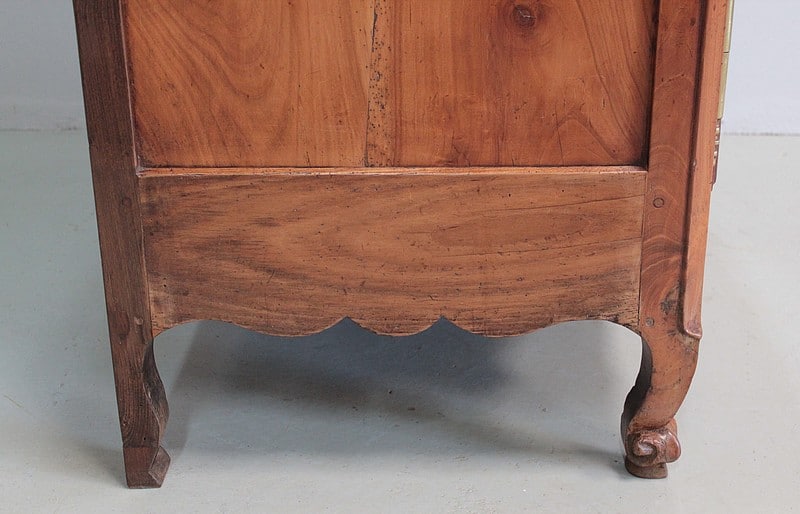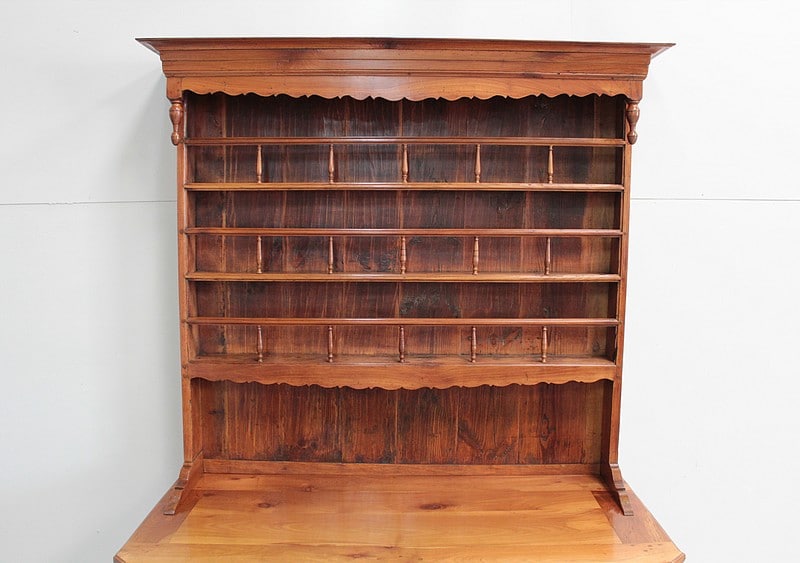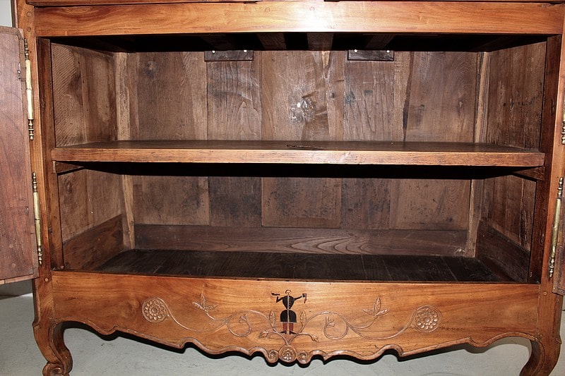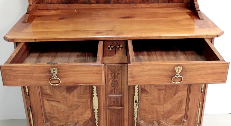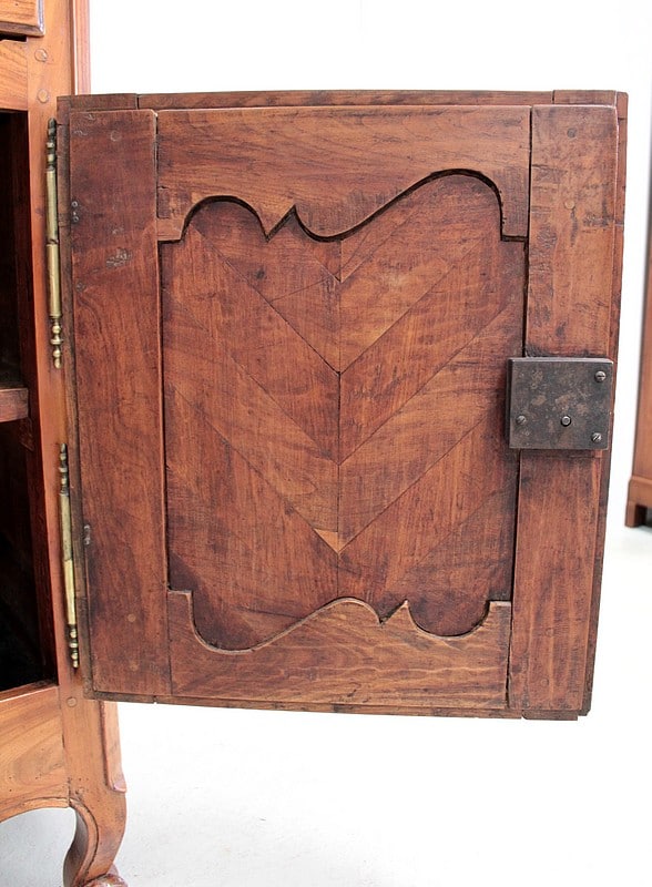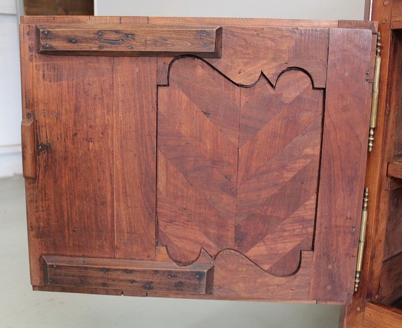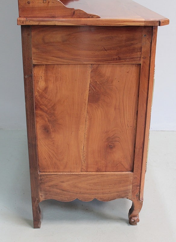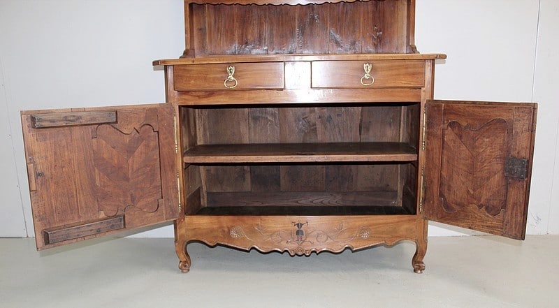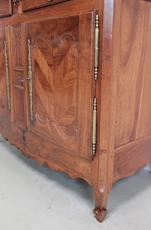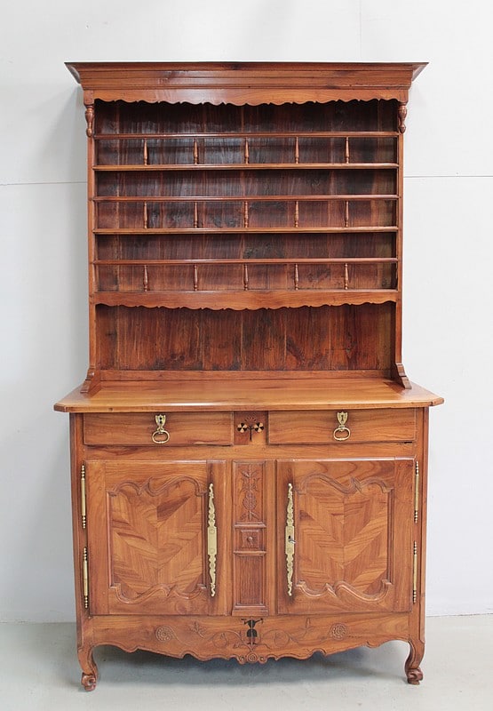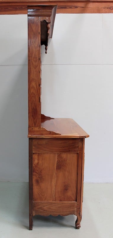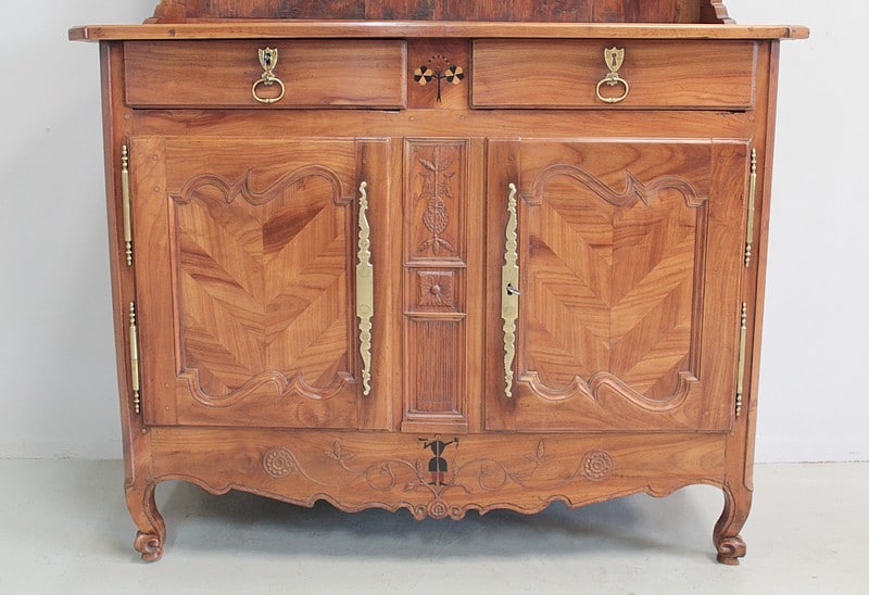 Rare Buffet-Vaisselier Louis XV en merisier , la partie haute garnie de 3 étagères de présentation, la partie basse ouvrant par 2 tiroirs (dont un fermant à clé) et 2 portes à médaillons travaillés en chevrons.