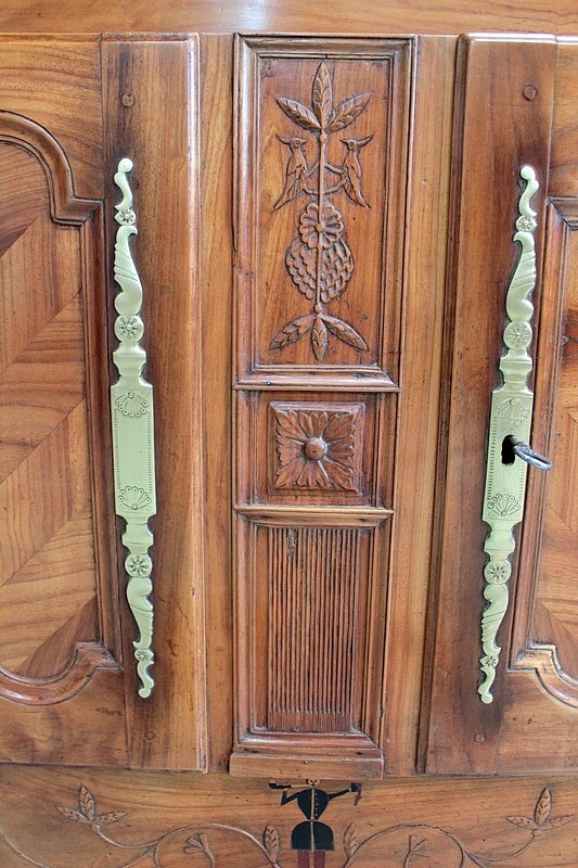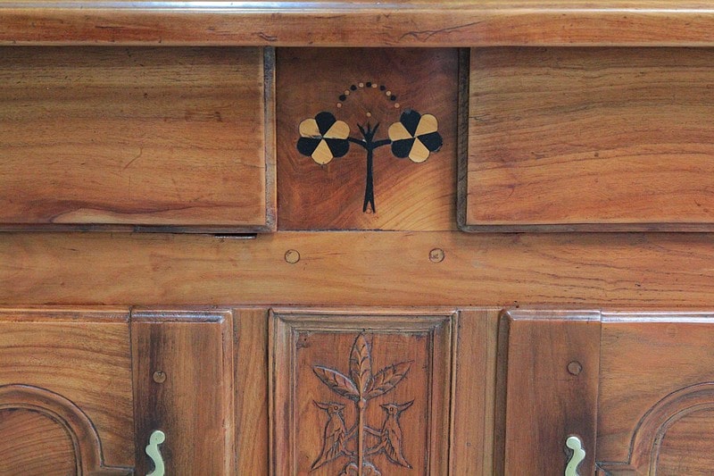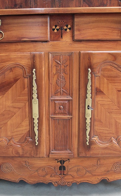 Le dormant est sculpté ainsi que la traverse basse chantournée , une marqueterie naïve agrémente cette sculpture ainsi que l’espace entre les 2 tiroirs.