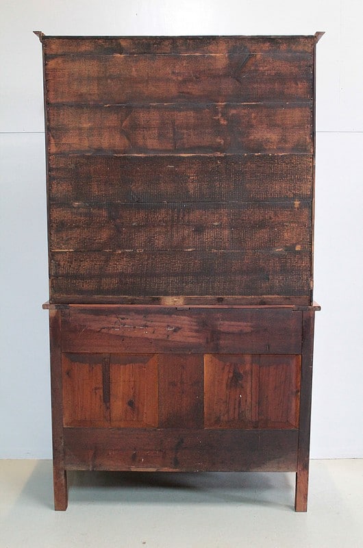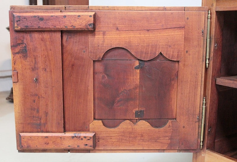 La partie basse ouvrant par 2 tiroirs (fermant à clé) avec poignées de tirage en laiton, et 2 portes découpées ornées d’entrées de serrures et de fiches de cuivre. Angles arrondis.