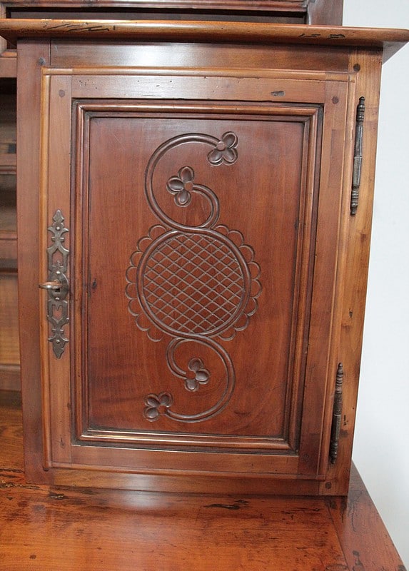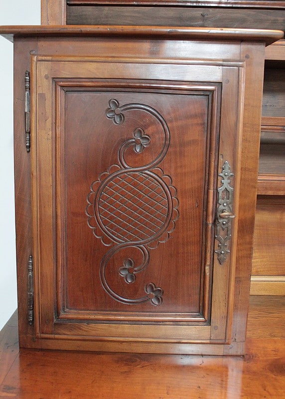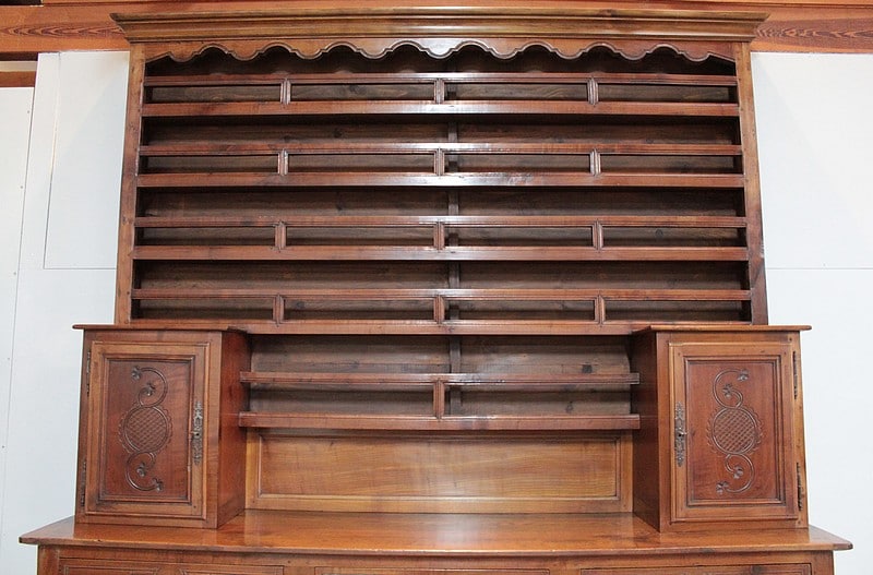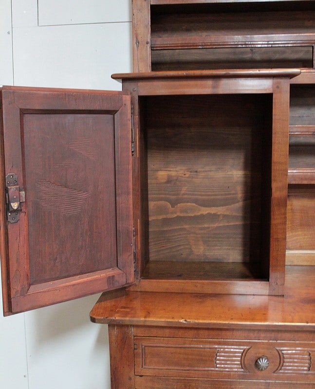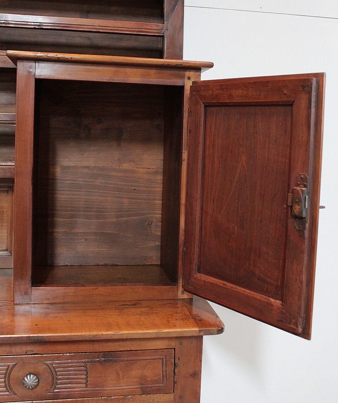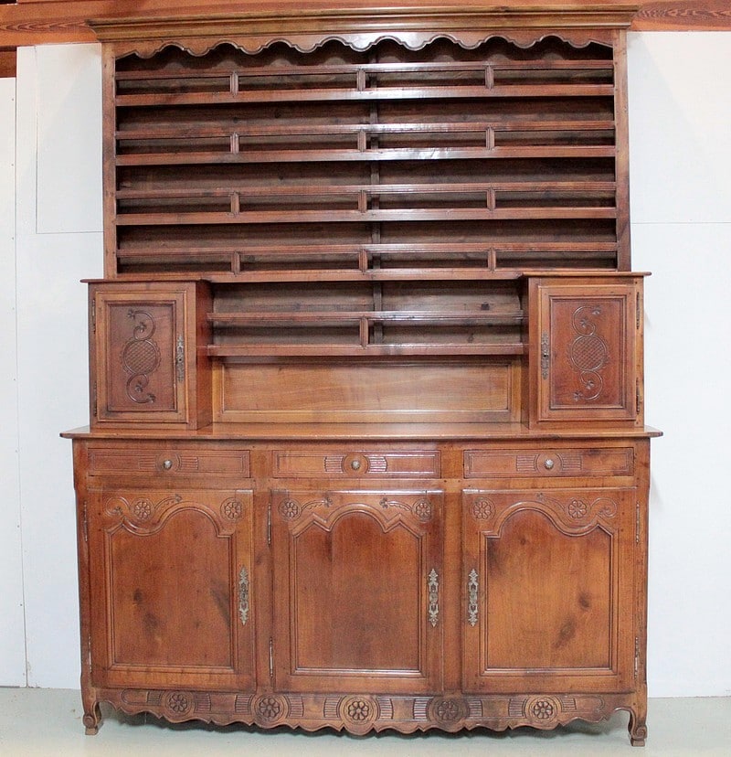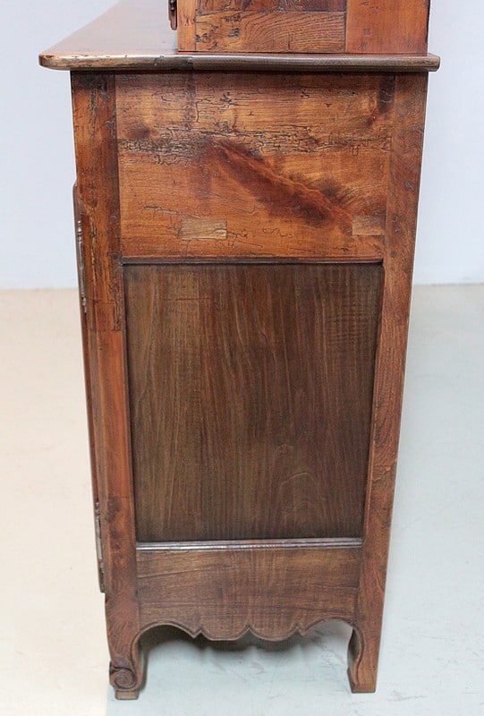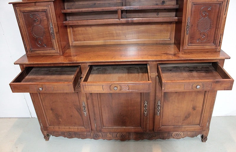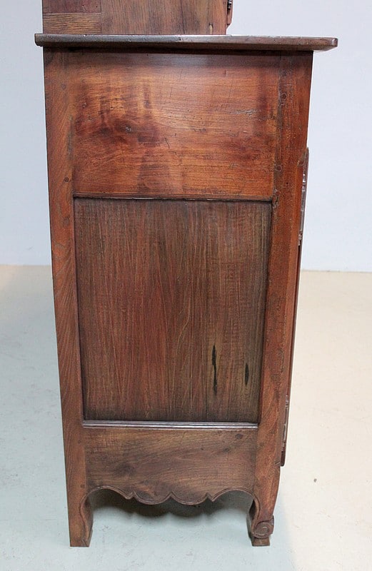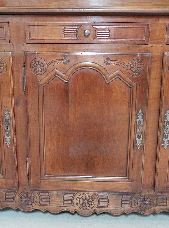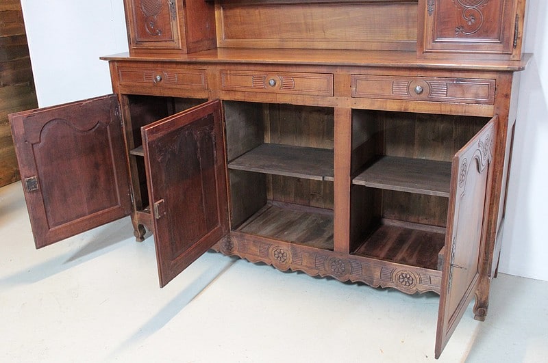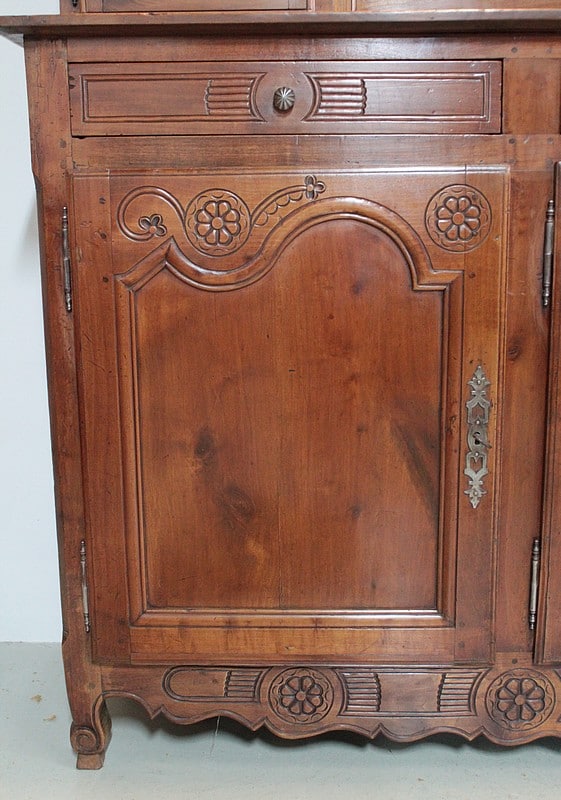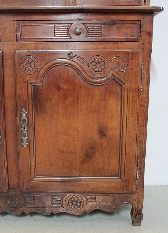 Grand Buffet-Vaisselier de style Louis XIV-Louis XV régional en merisier (côtés en chêne), ouvrant à 3 portes découpées à motif de fleurs en partie basse (fermant 3 compartiments)..