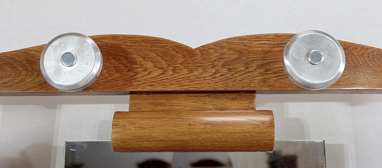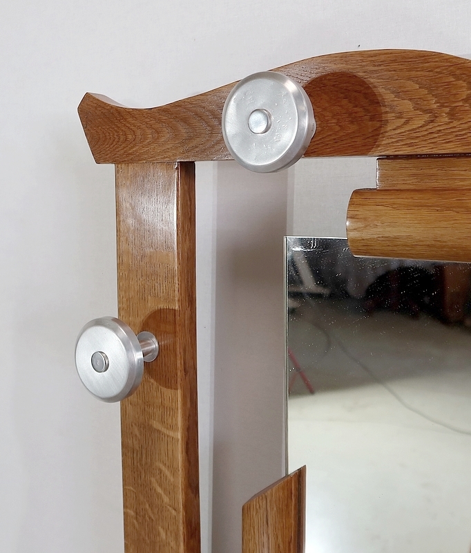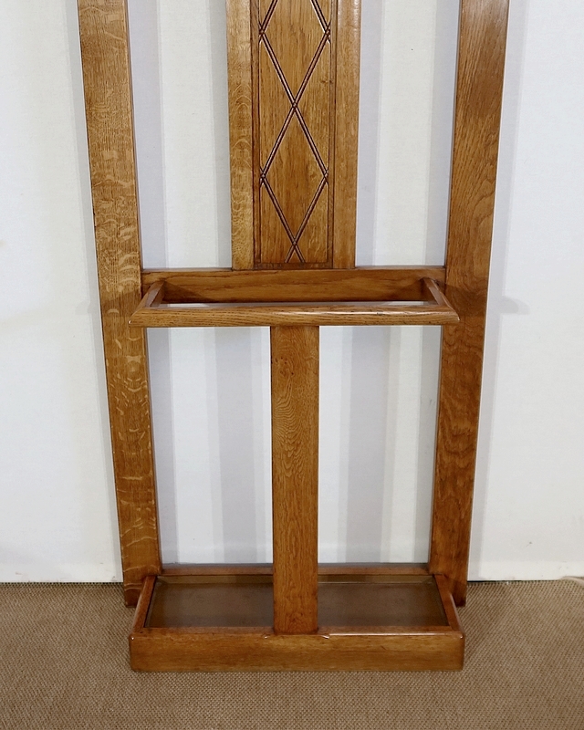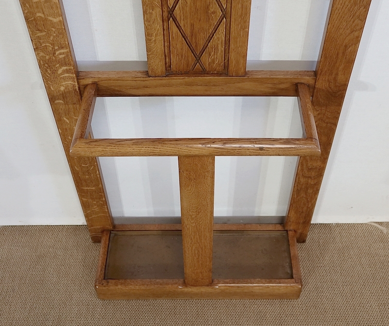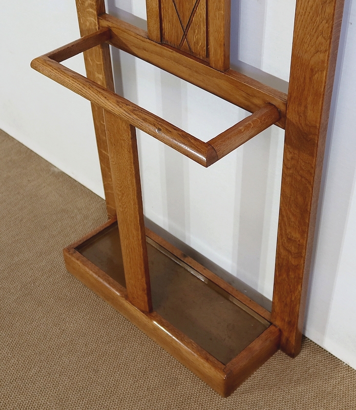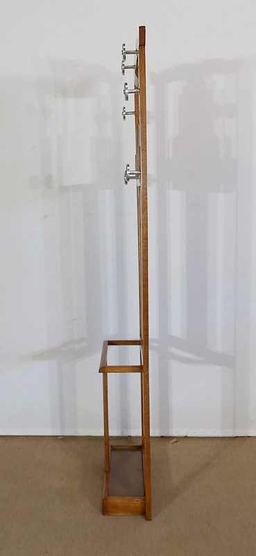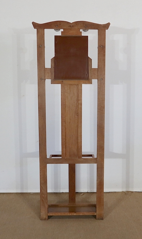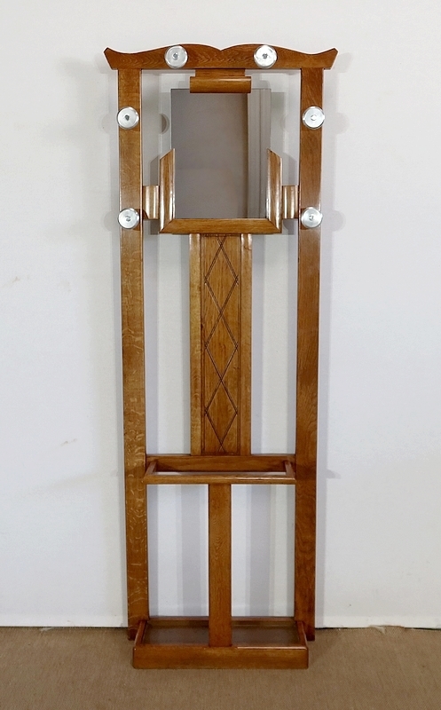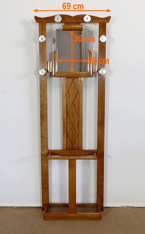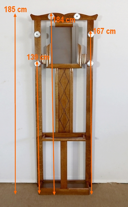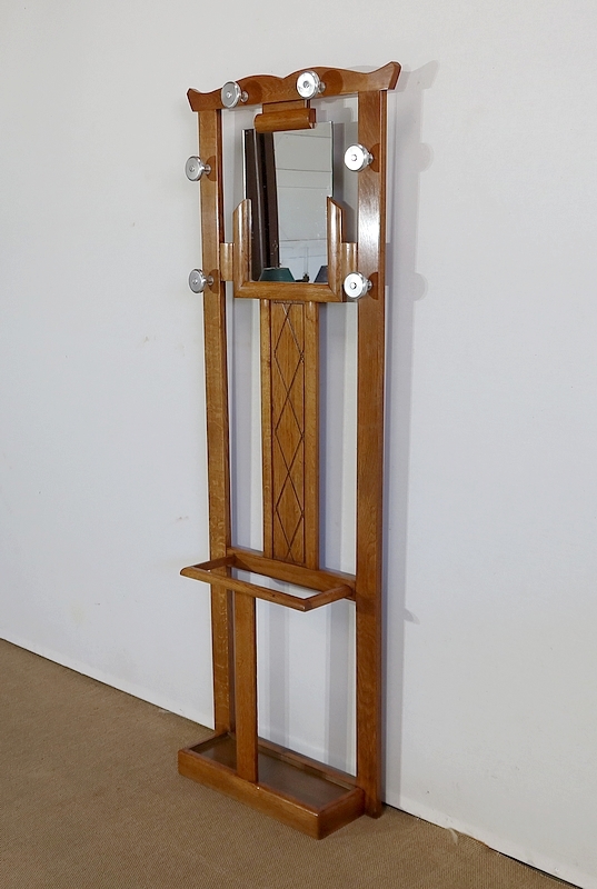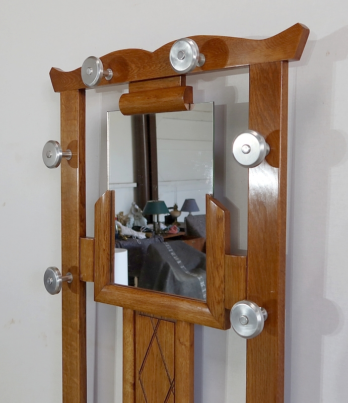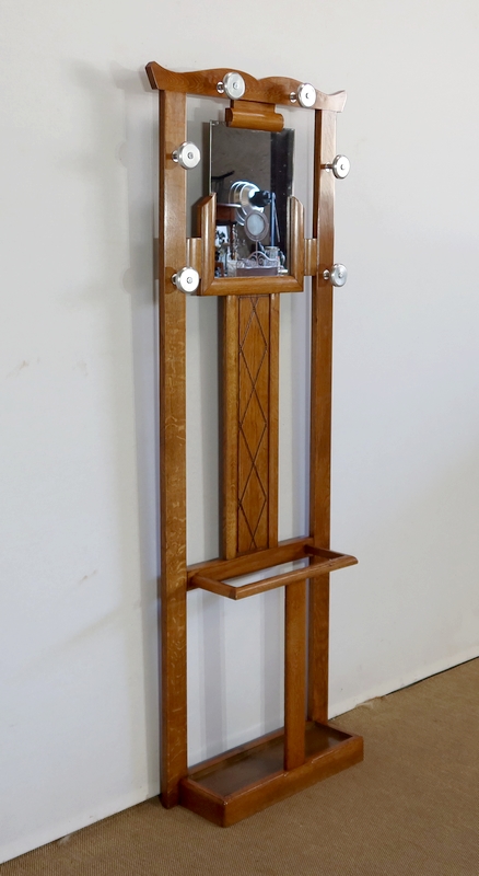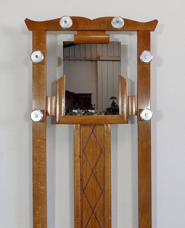 Vestiaire en chêne comprenant 6 patères, un miroir et un porte parapluie.