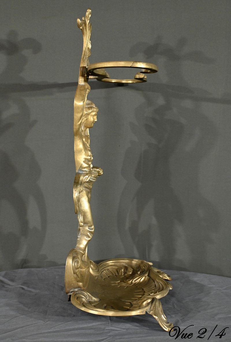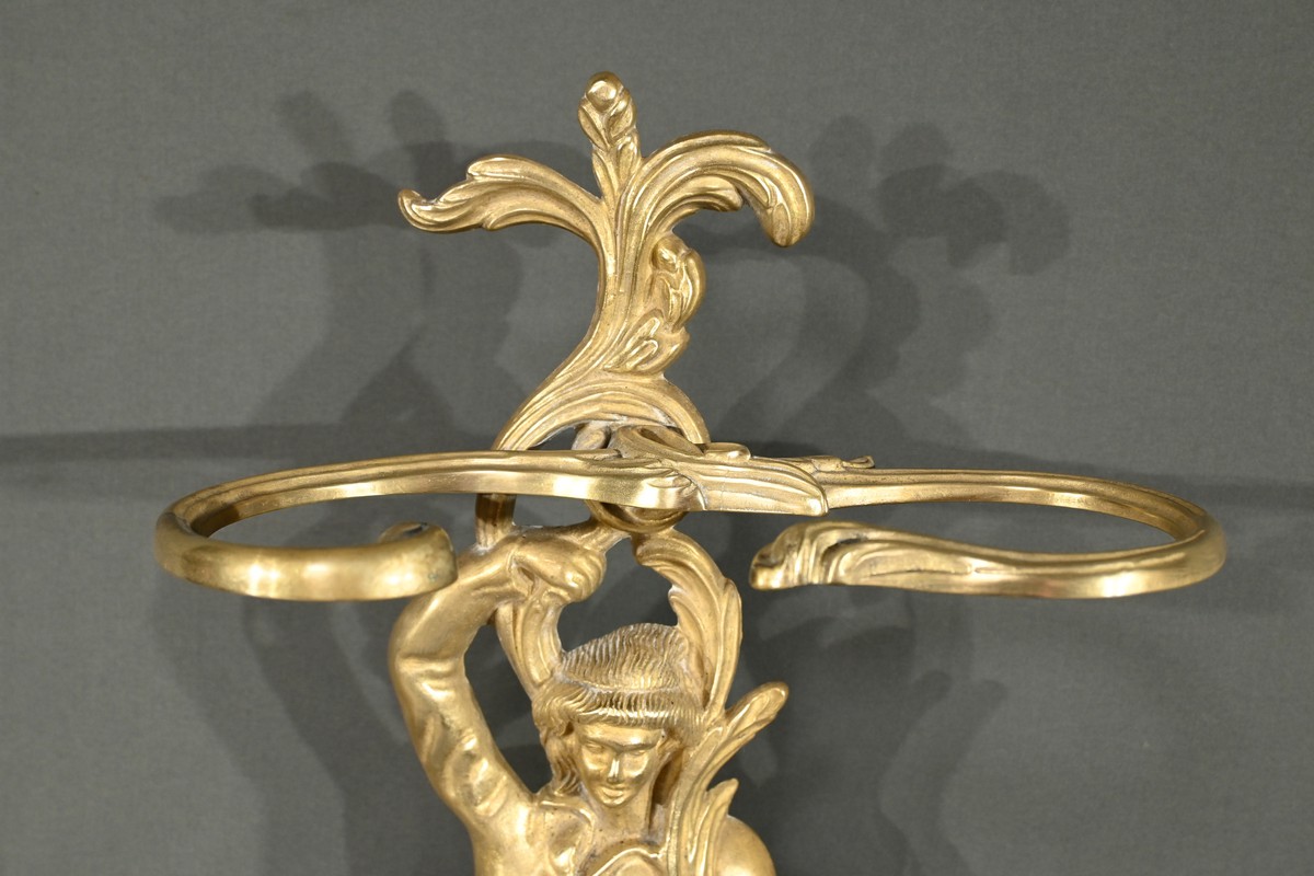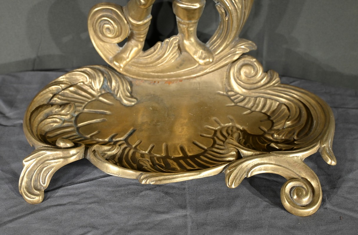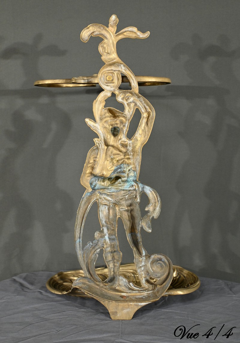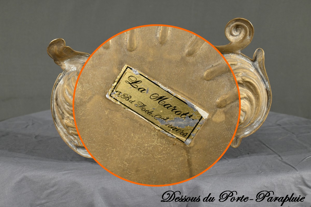 Le porte-parapluie repose sur un plateau égouttoir orné de feuilles d’acanthe et de volutes, ajoutant une touche de sophistication et de naturalisme typique de l’art nouveau.