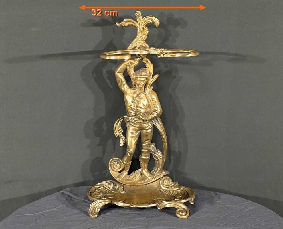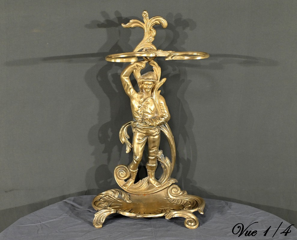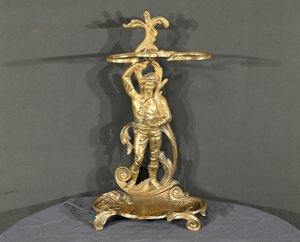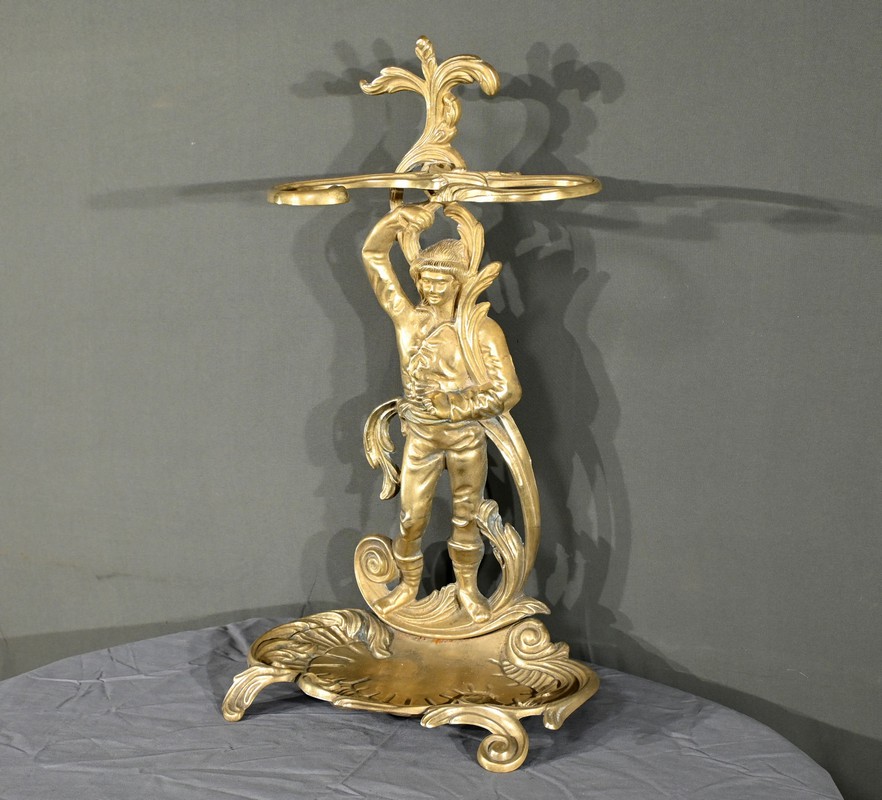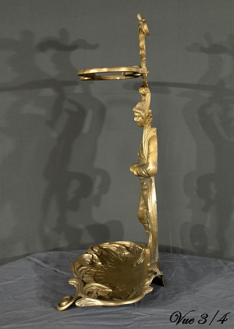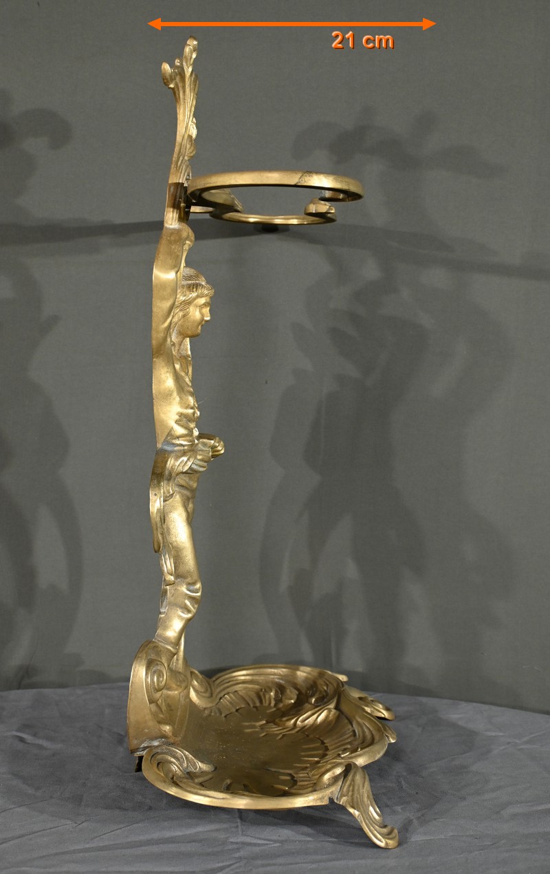 Le porte-parapluie repose sur un plateau égouttoir orné de feuilles d’acanthe et de volutes, ajoutant une touche de sophistication et de naturalisme typique de l’art nouveau.